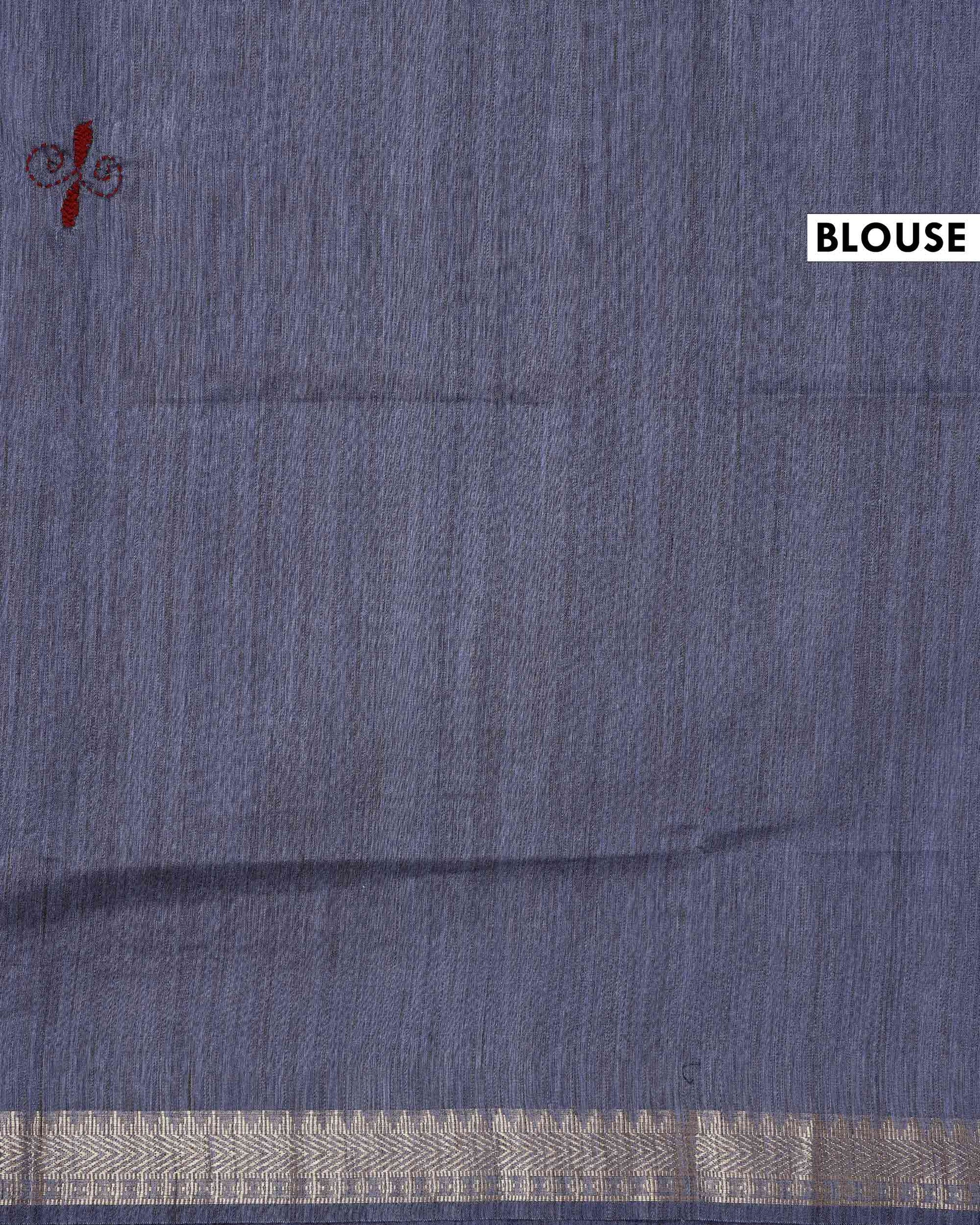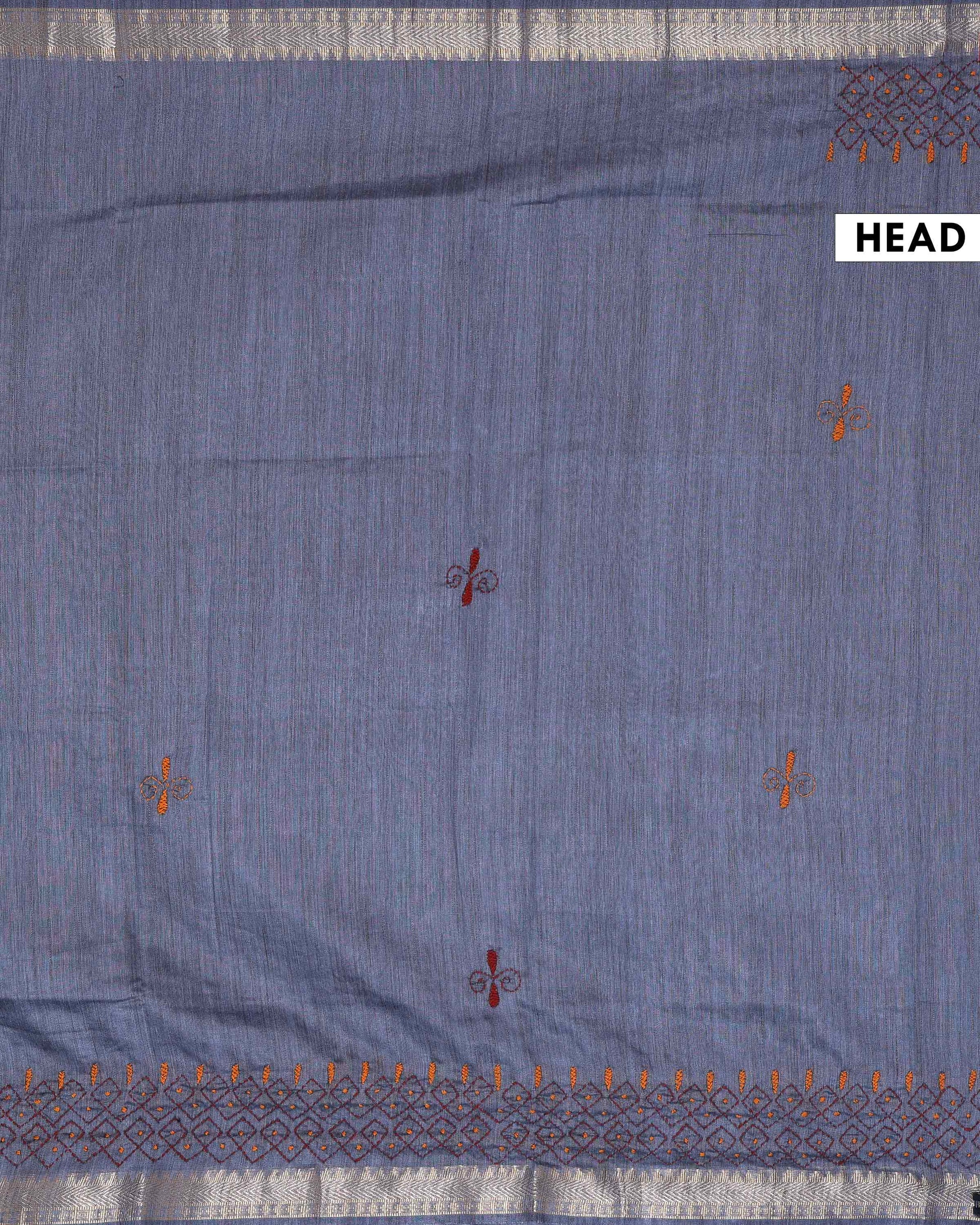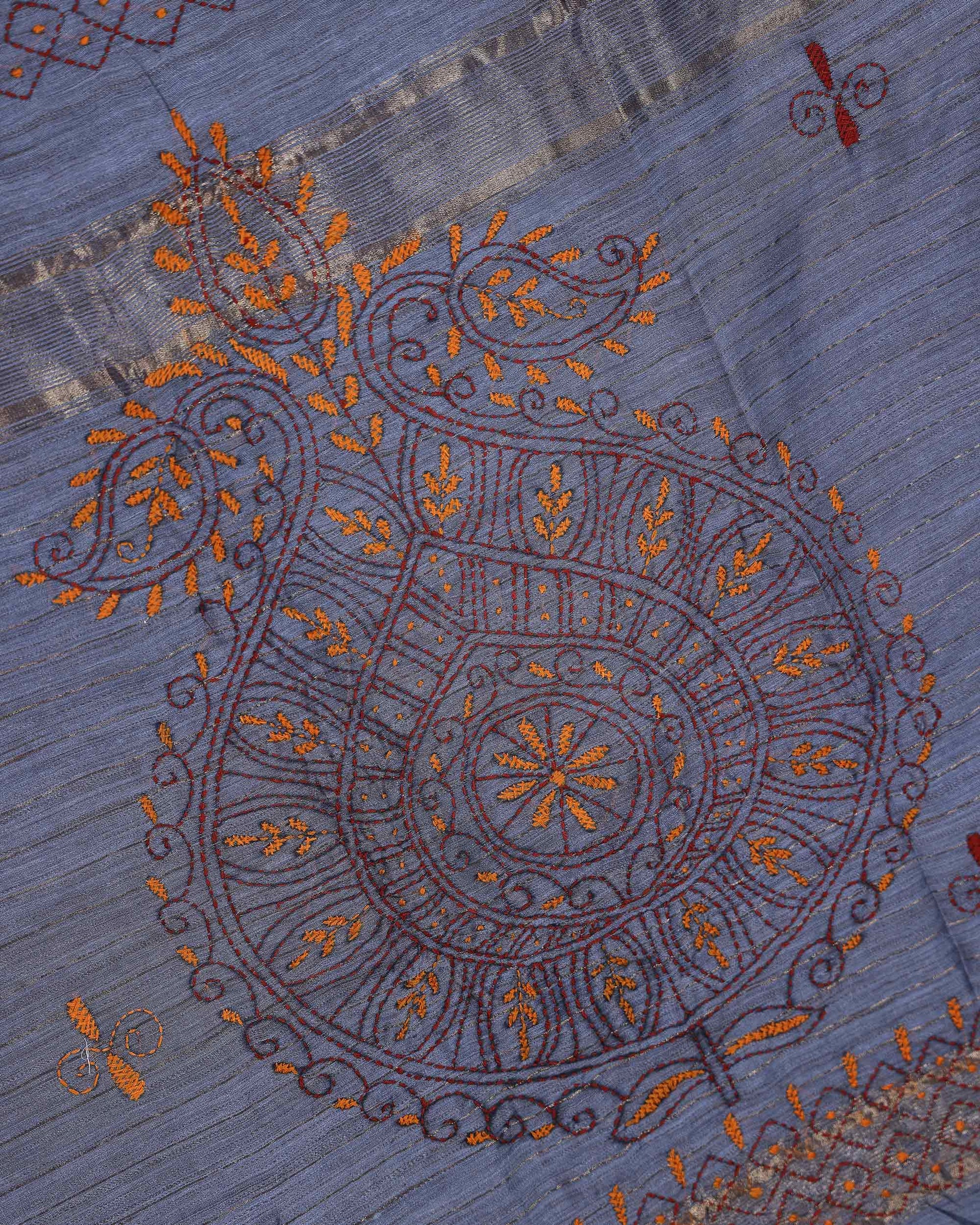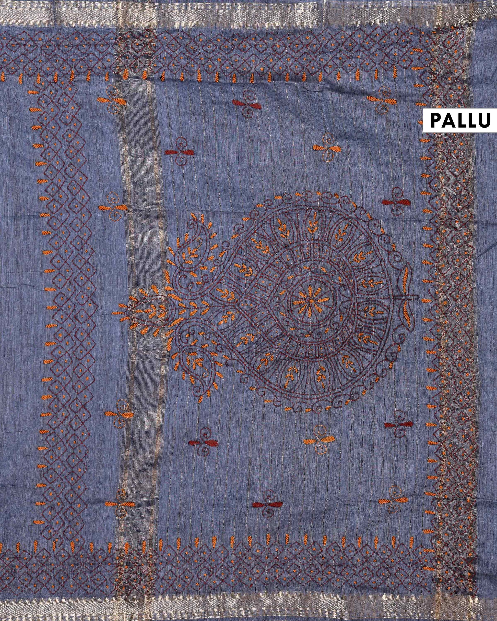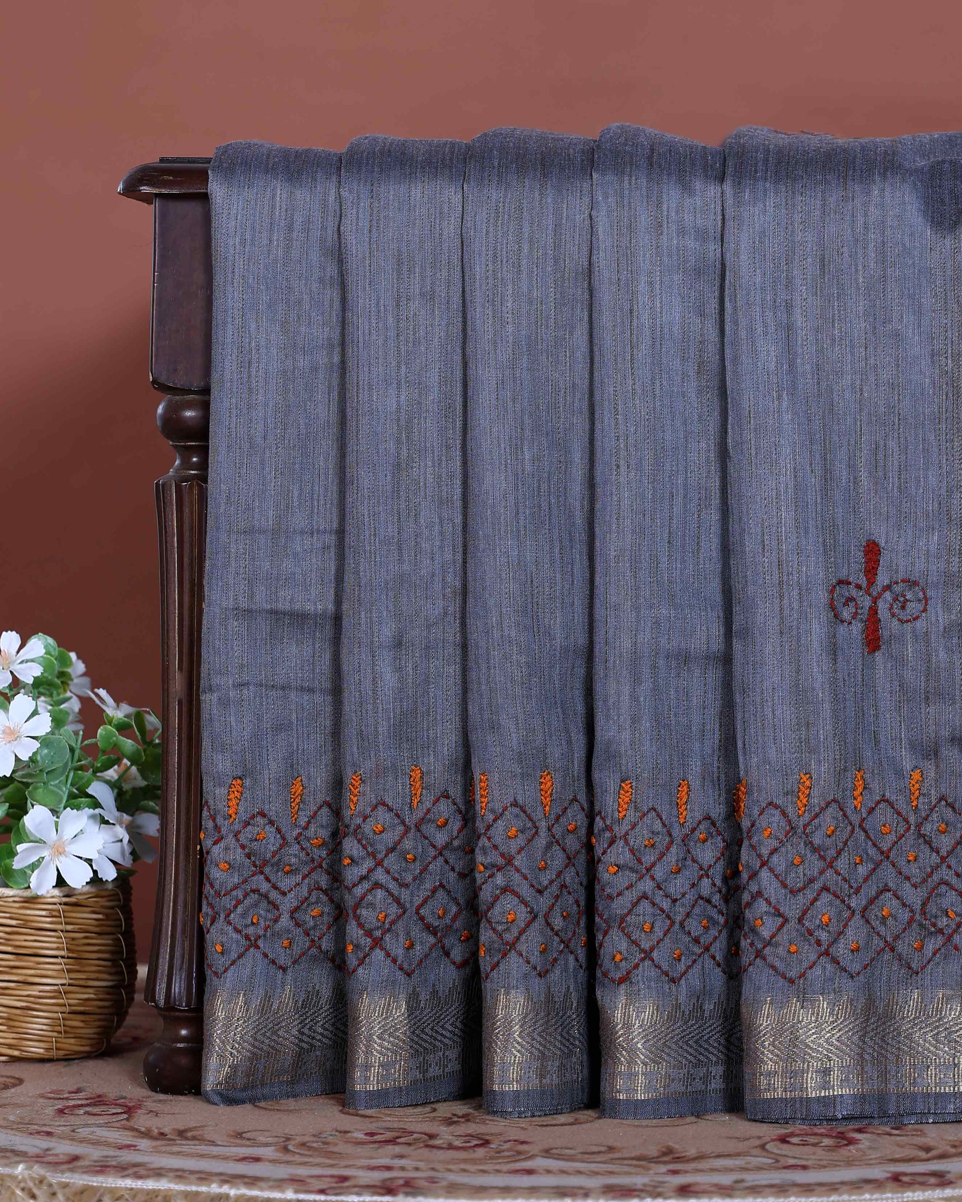 - This beautiful Grey Kantha saree features intricate traditional embroidery along the border and pallu