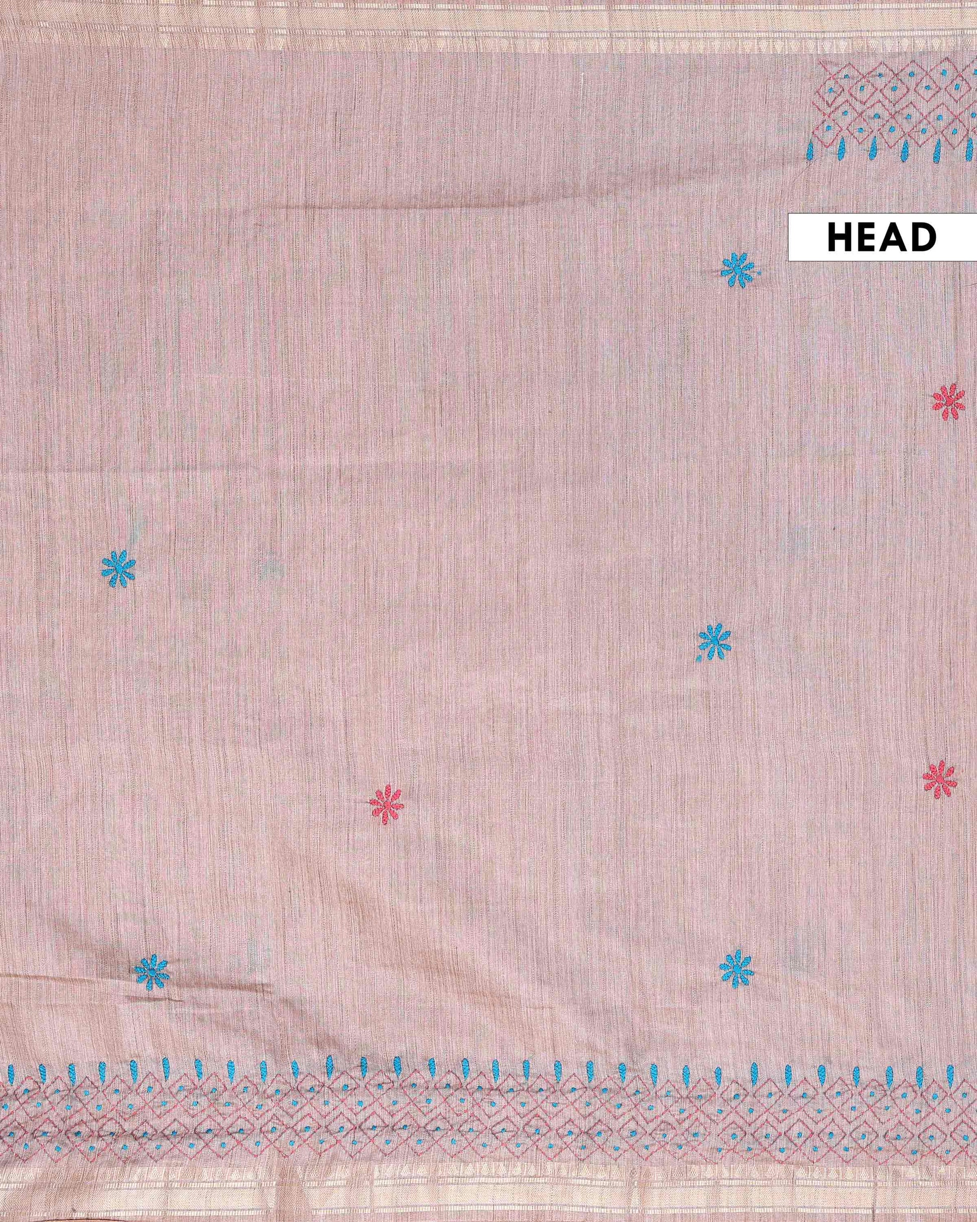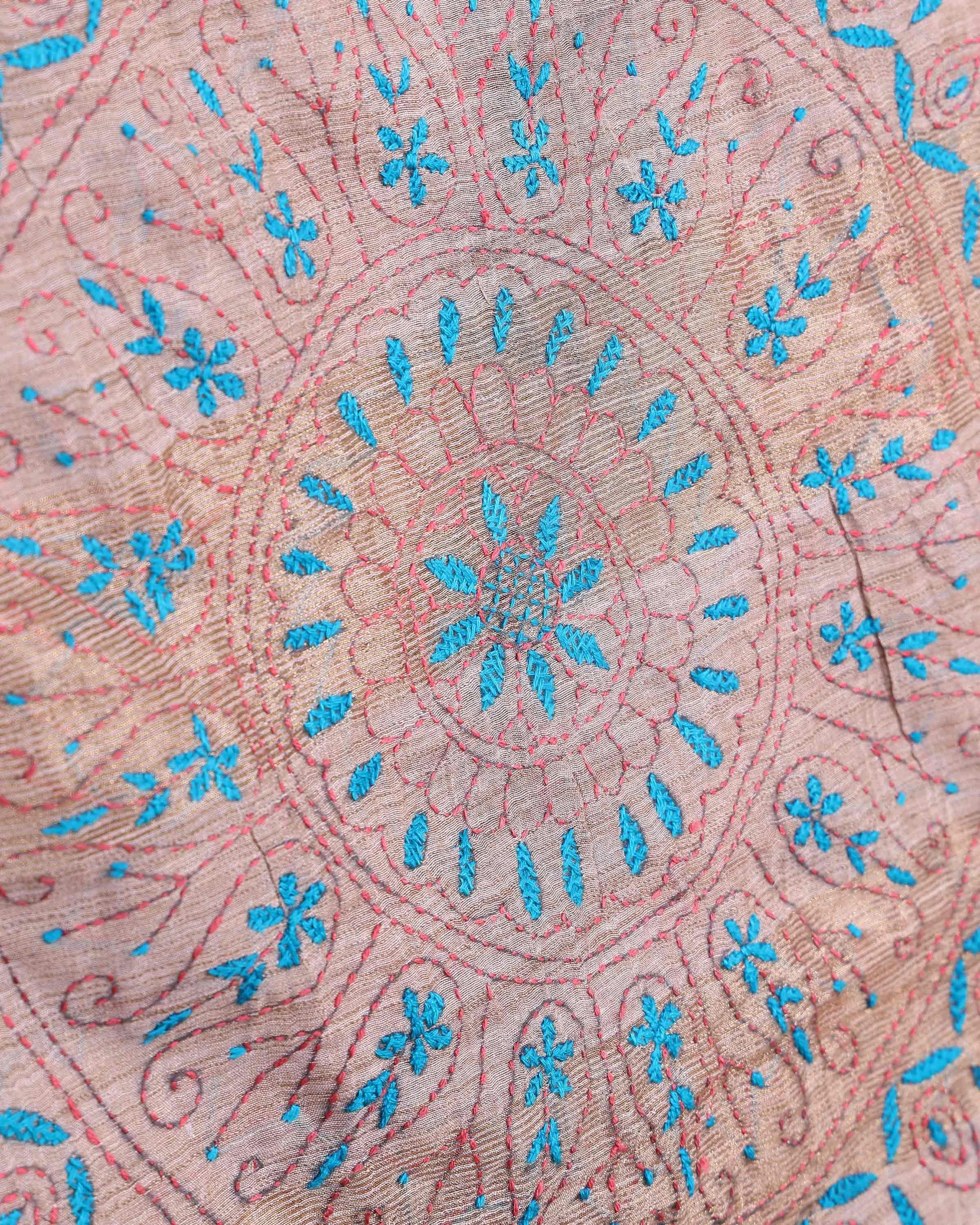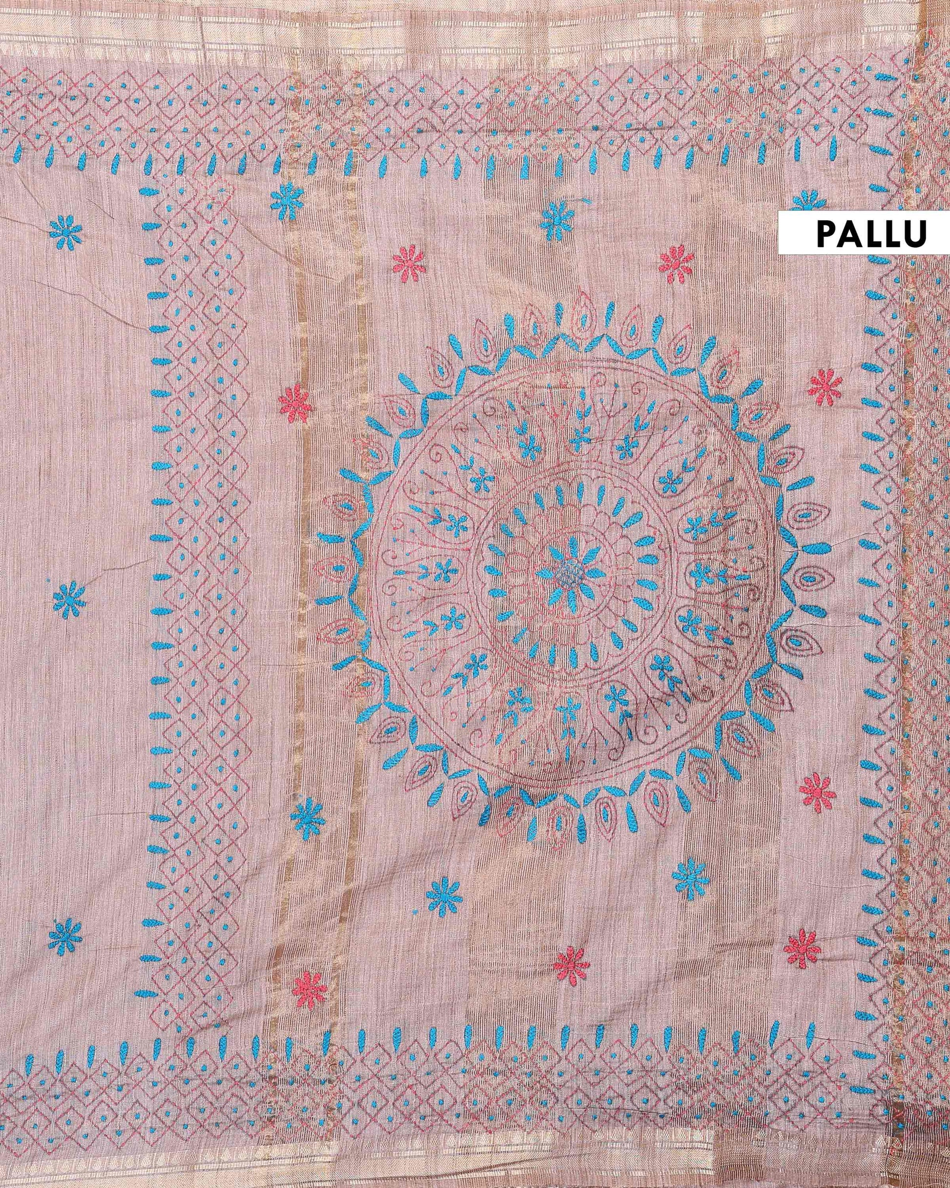 - This beautiful Light Brown Kantha saree features intricate traditional embroidery along the border and pallu