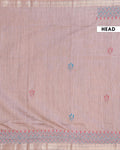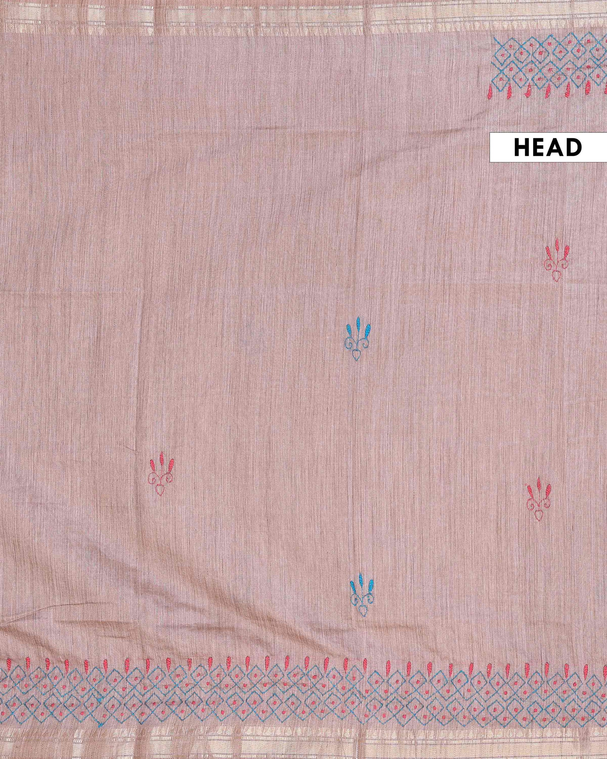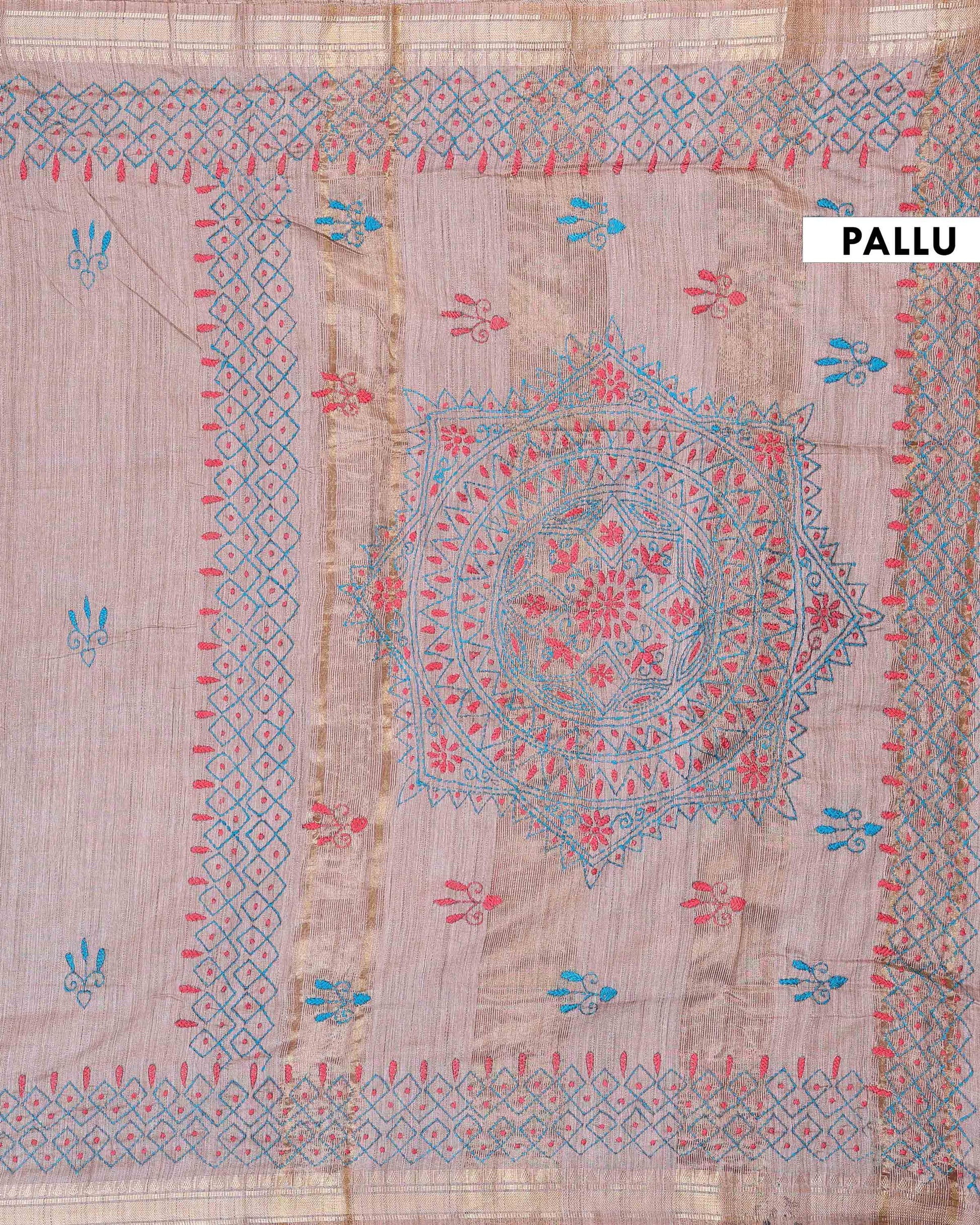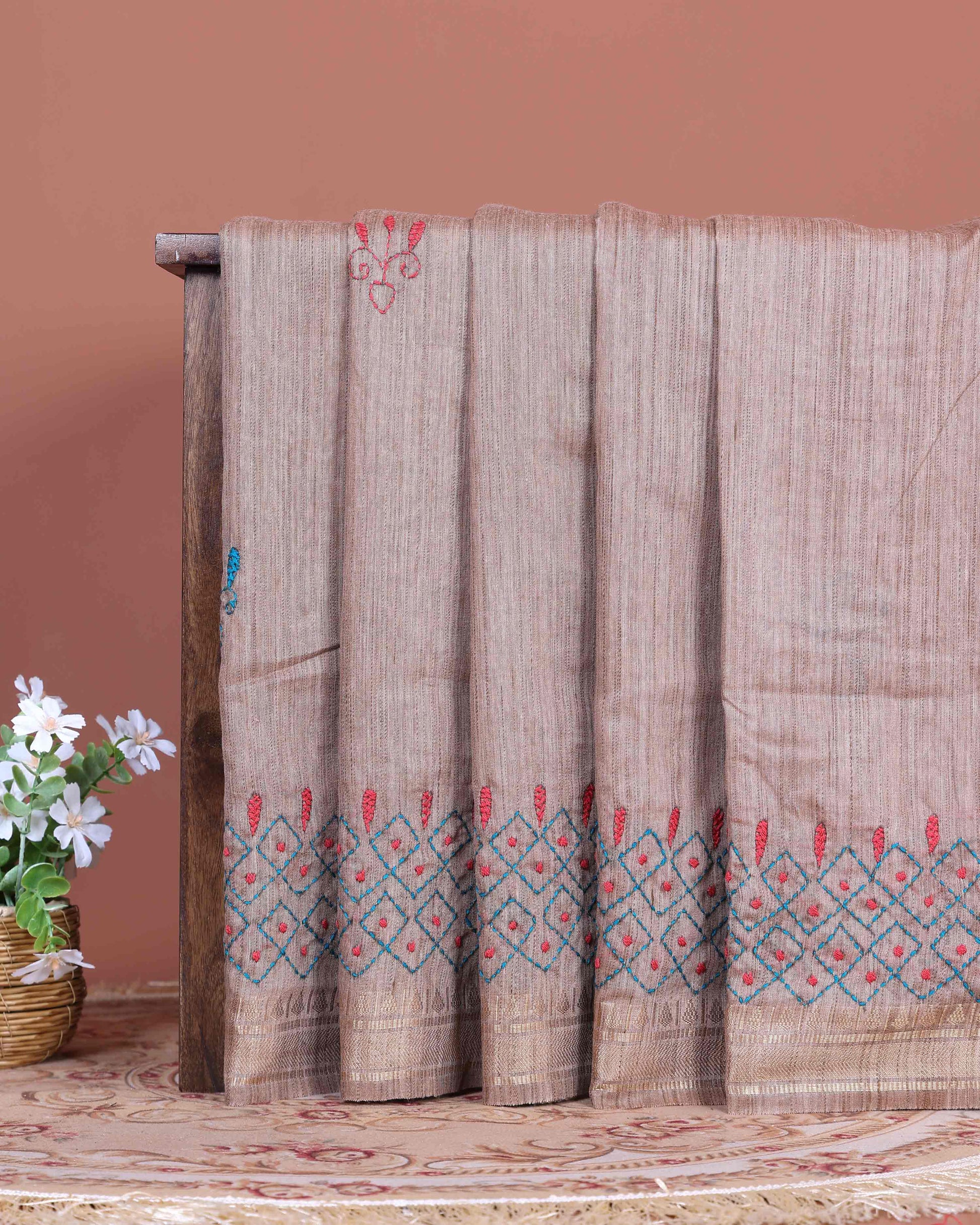 - This beautiful Light Brown Kantha saree features intricate traditional embroidery along the border and pallu
