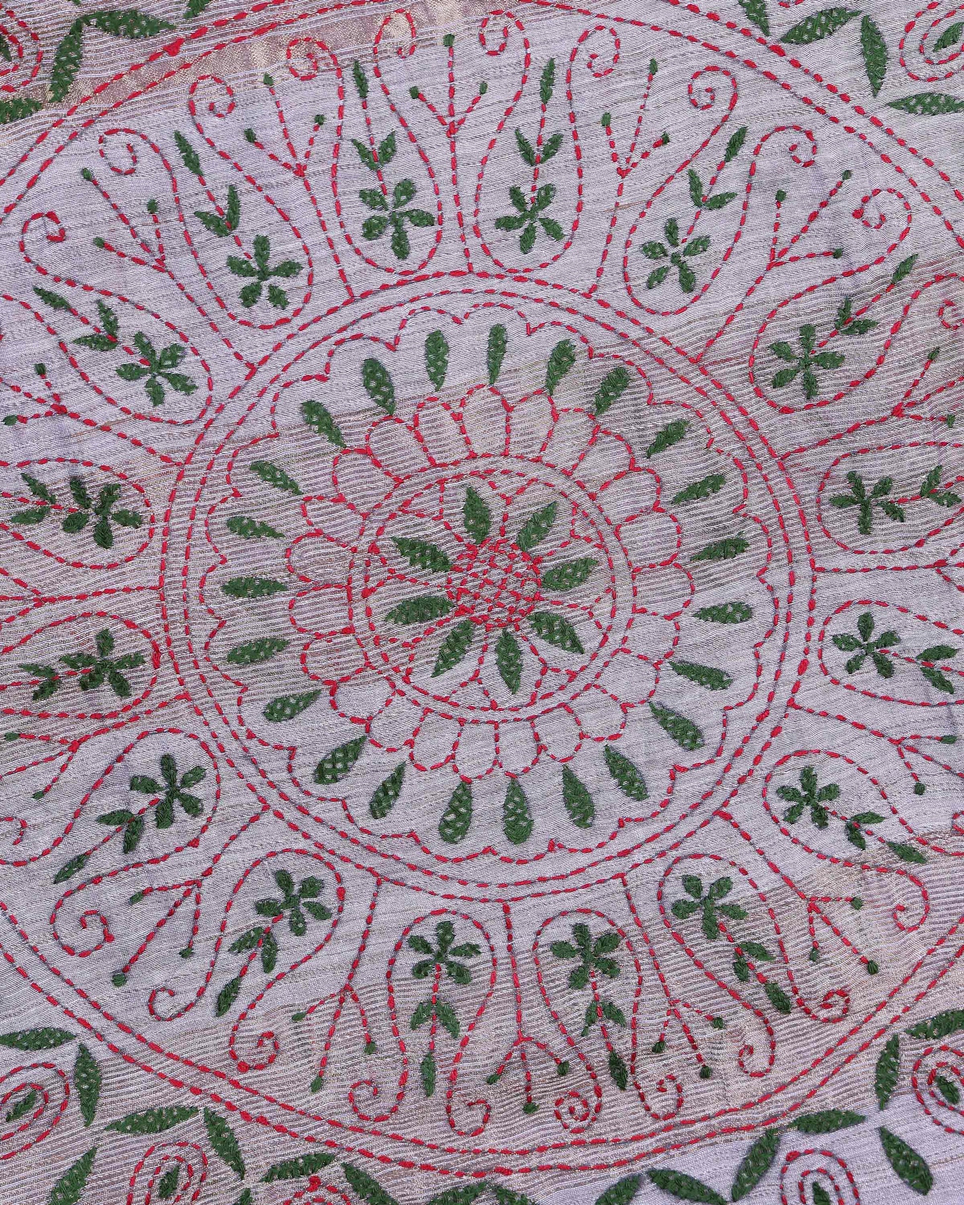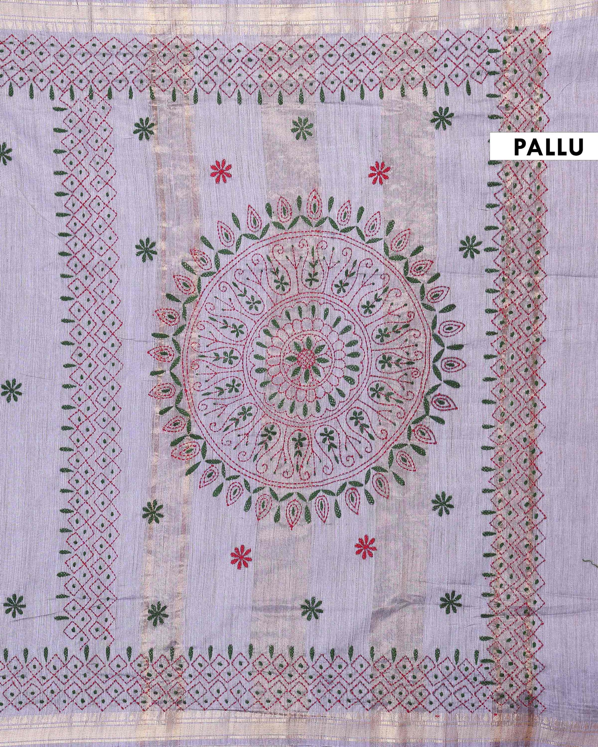 Elegant Kantha Hand Embroidered Saree with Intricate Floral Motif and Contrast Border - Light Grey