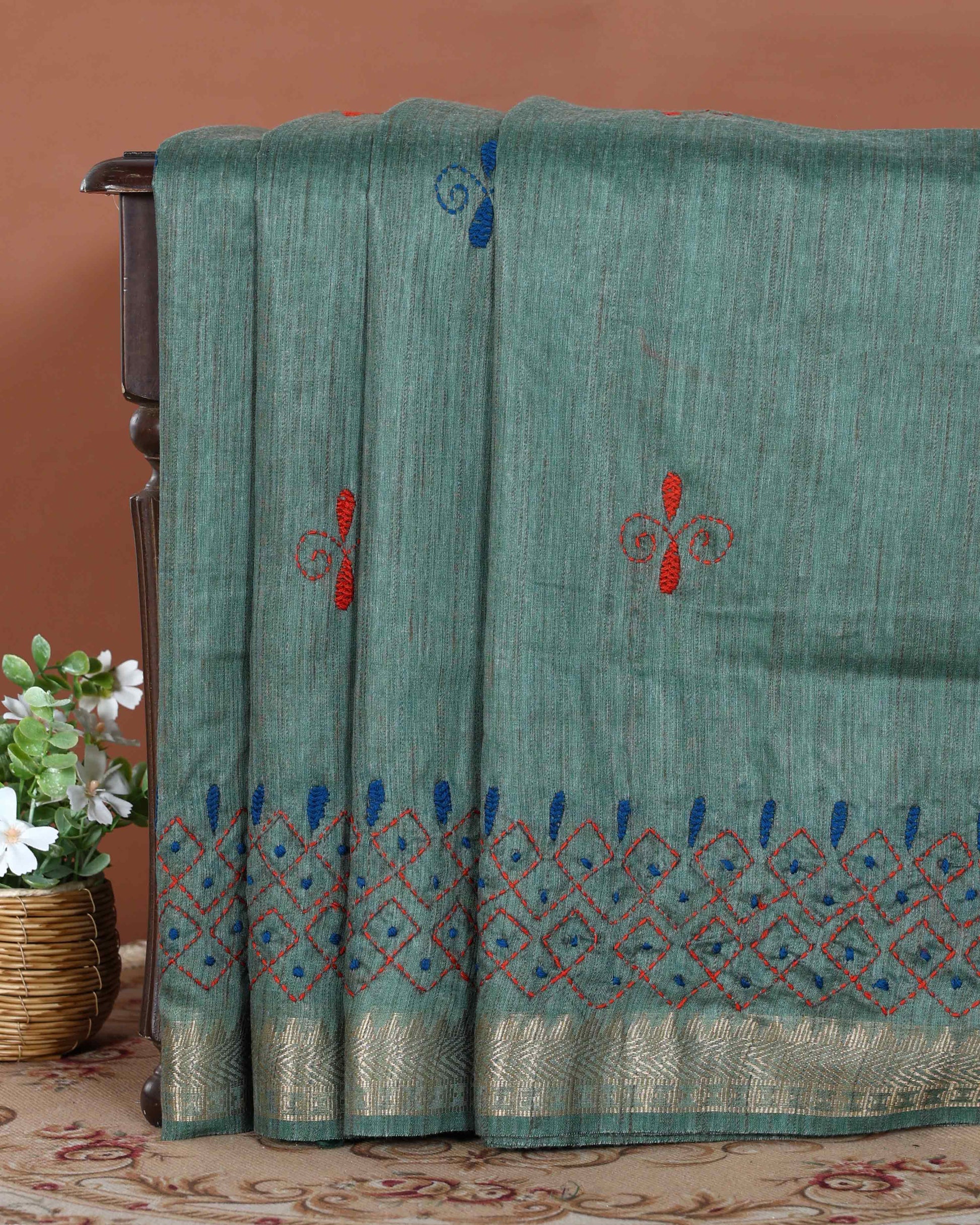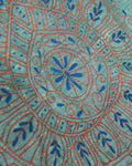 - This beautiful Green Kantha saree features intricate traditional embroidery along the border and pallu