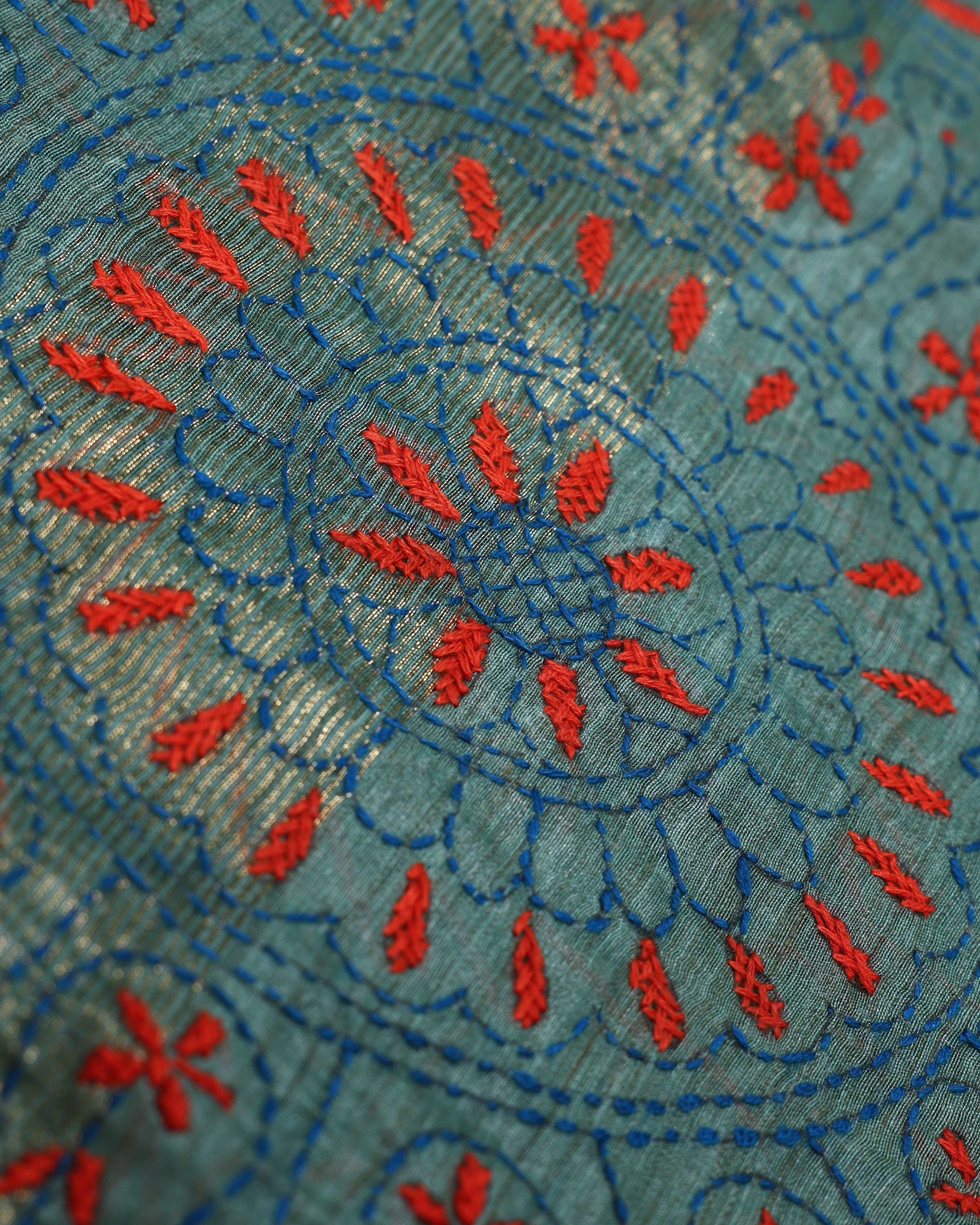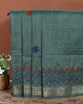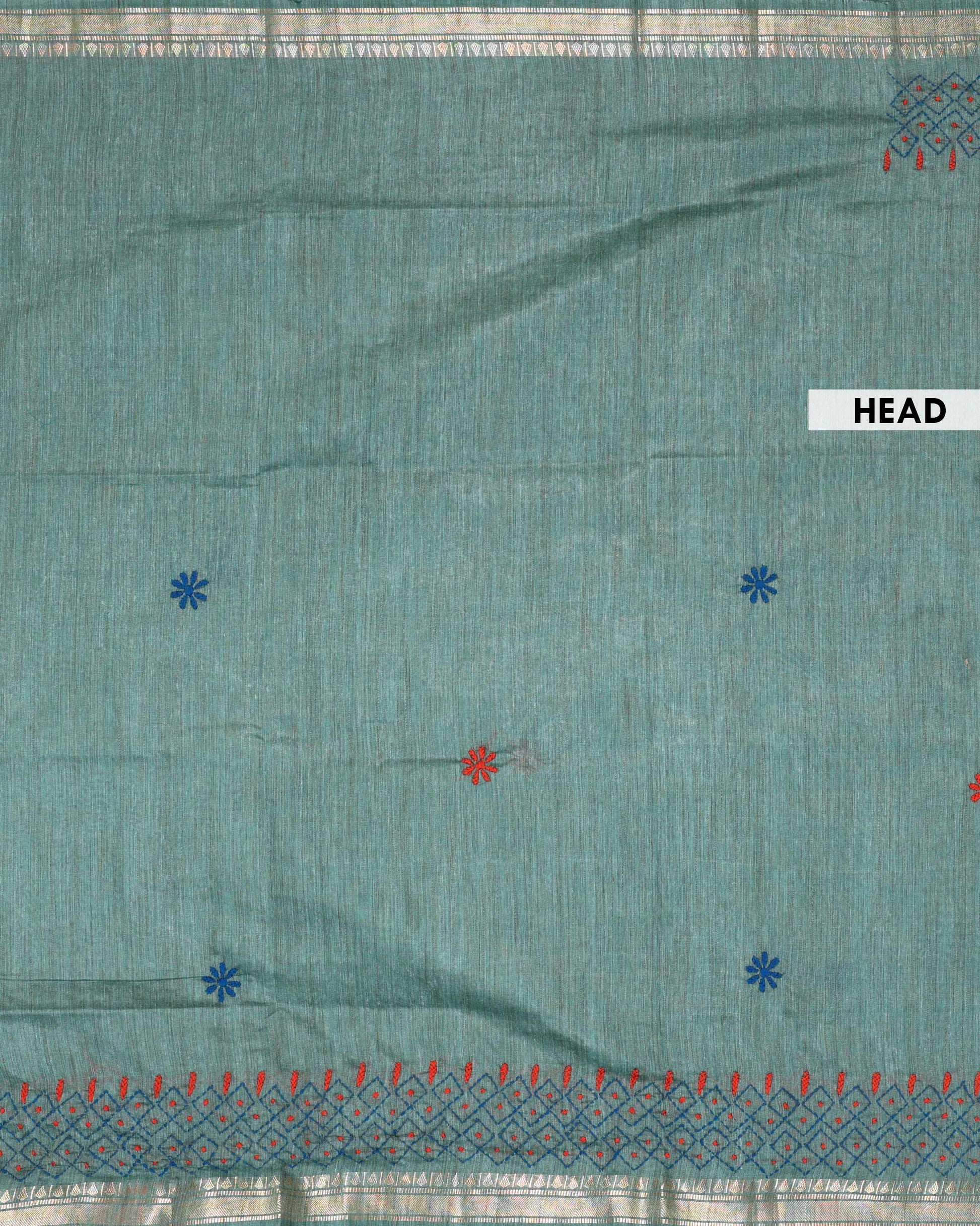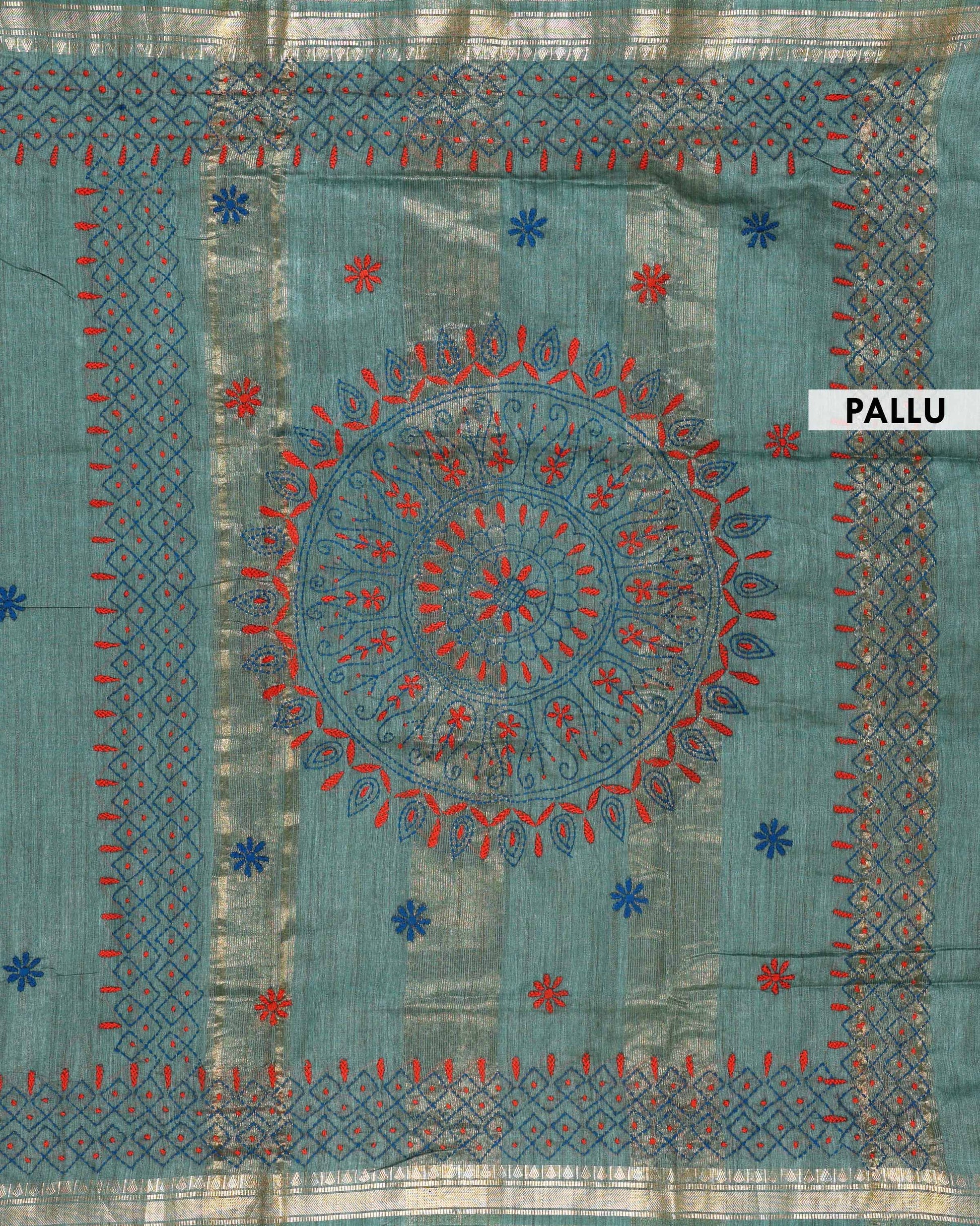 - This beautiful Green Kantha saree features intricate traditional embroidery along the border and pallu