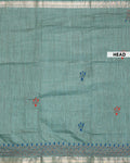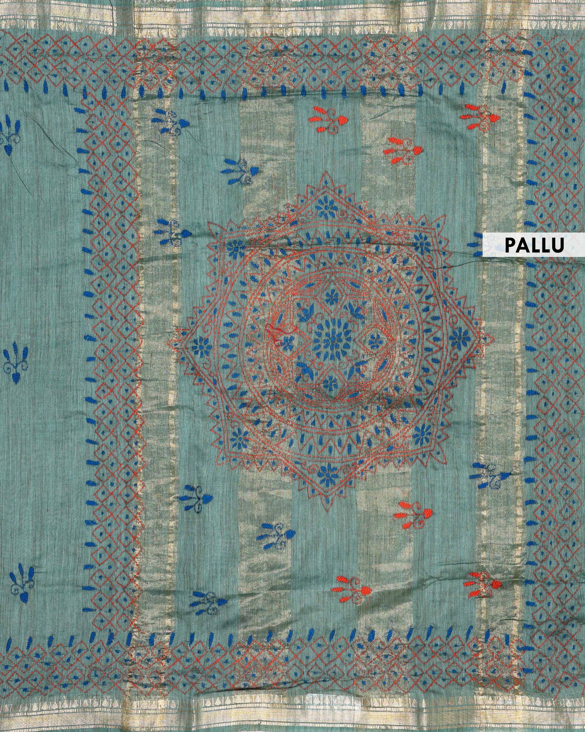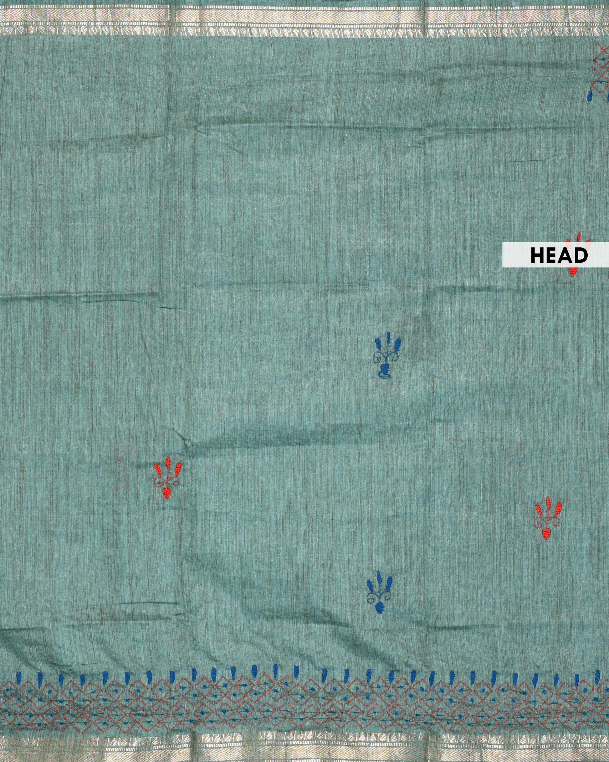 - This beautiful Green Kantha saree features intricate traditional embroidery along the border and pallu