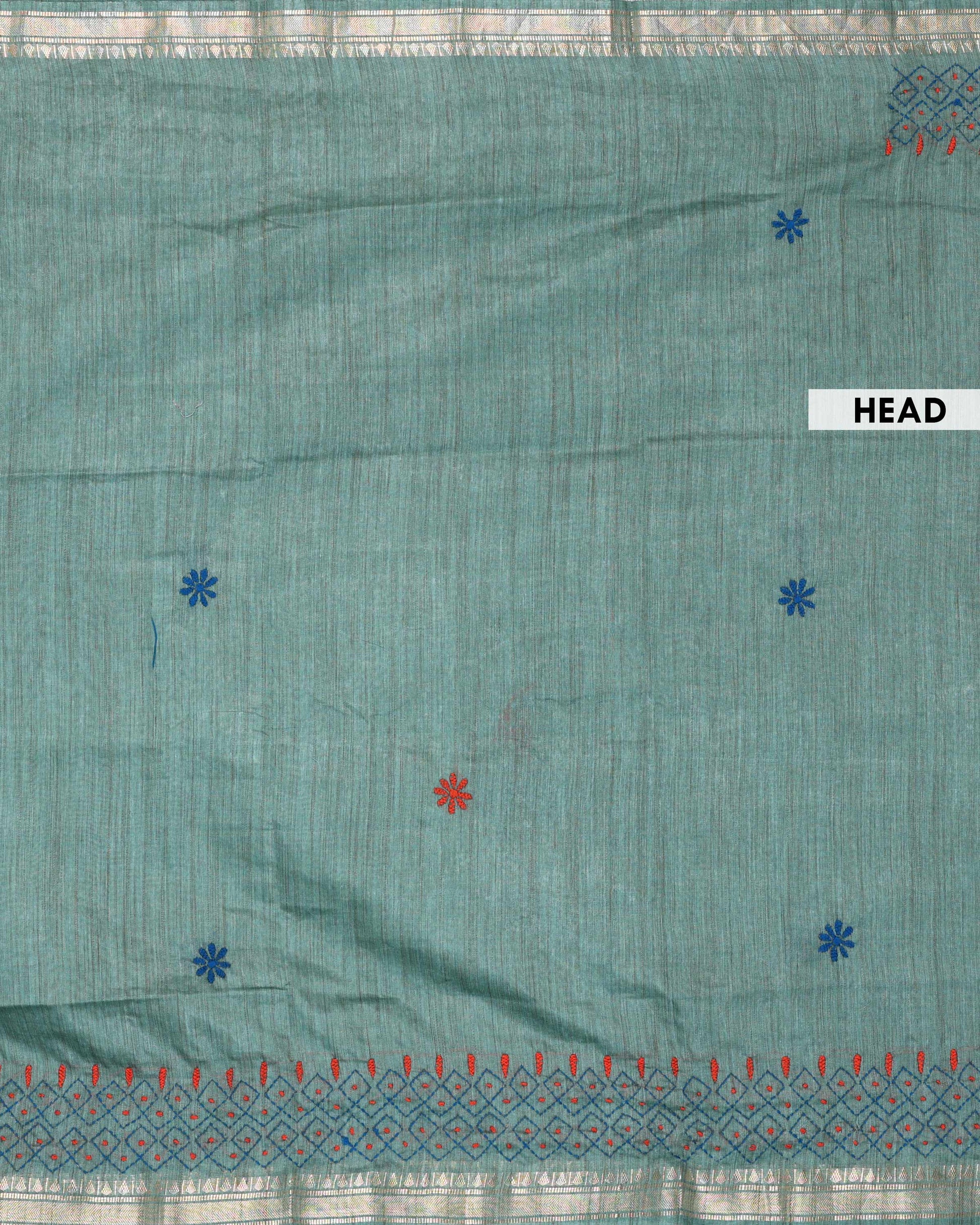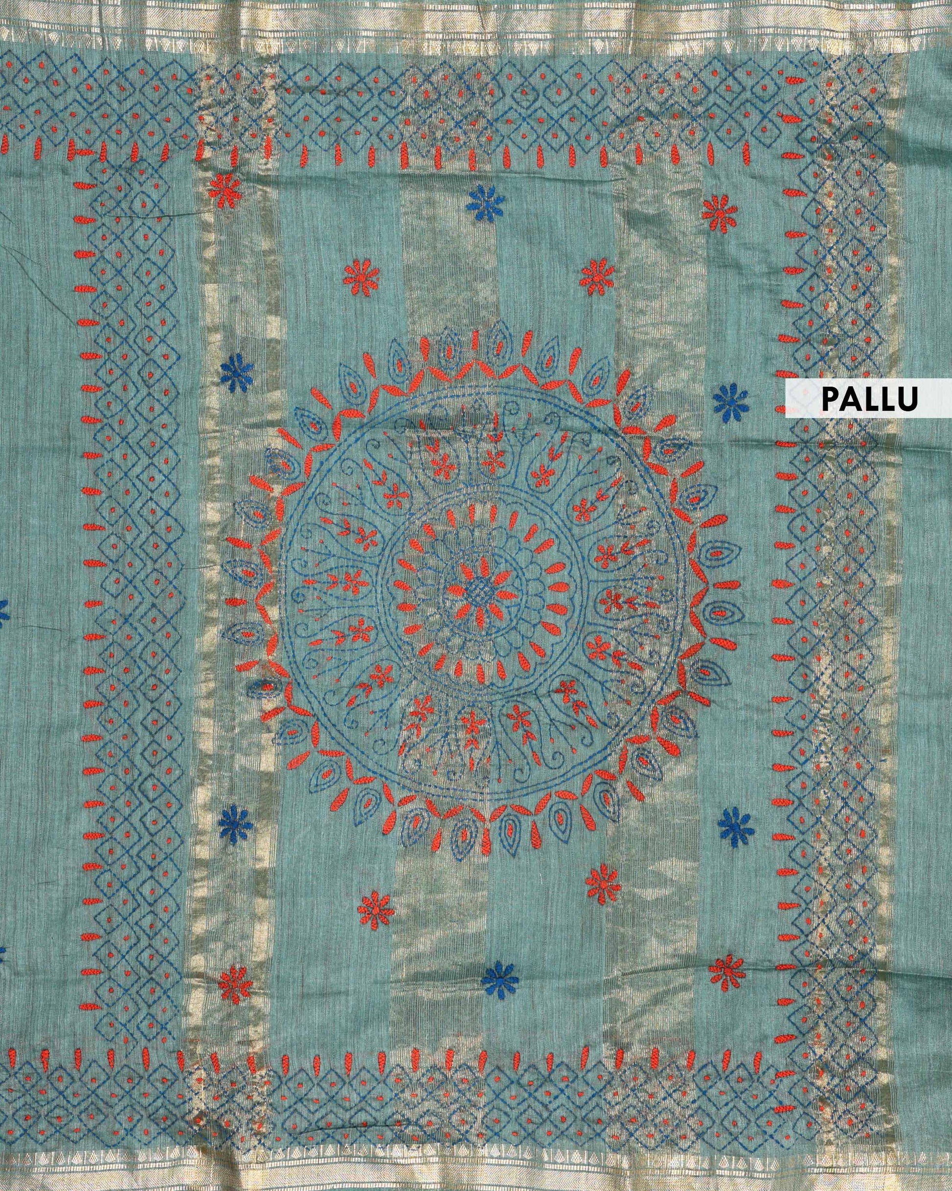 - This beautiful Green Kantha saree features intricate traditional embroidery along the border and pallu