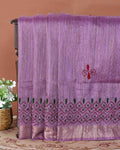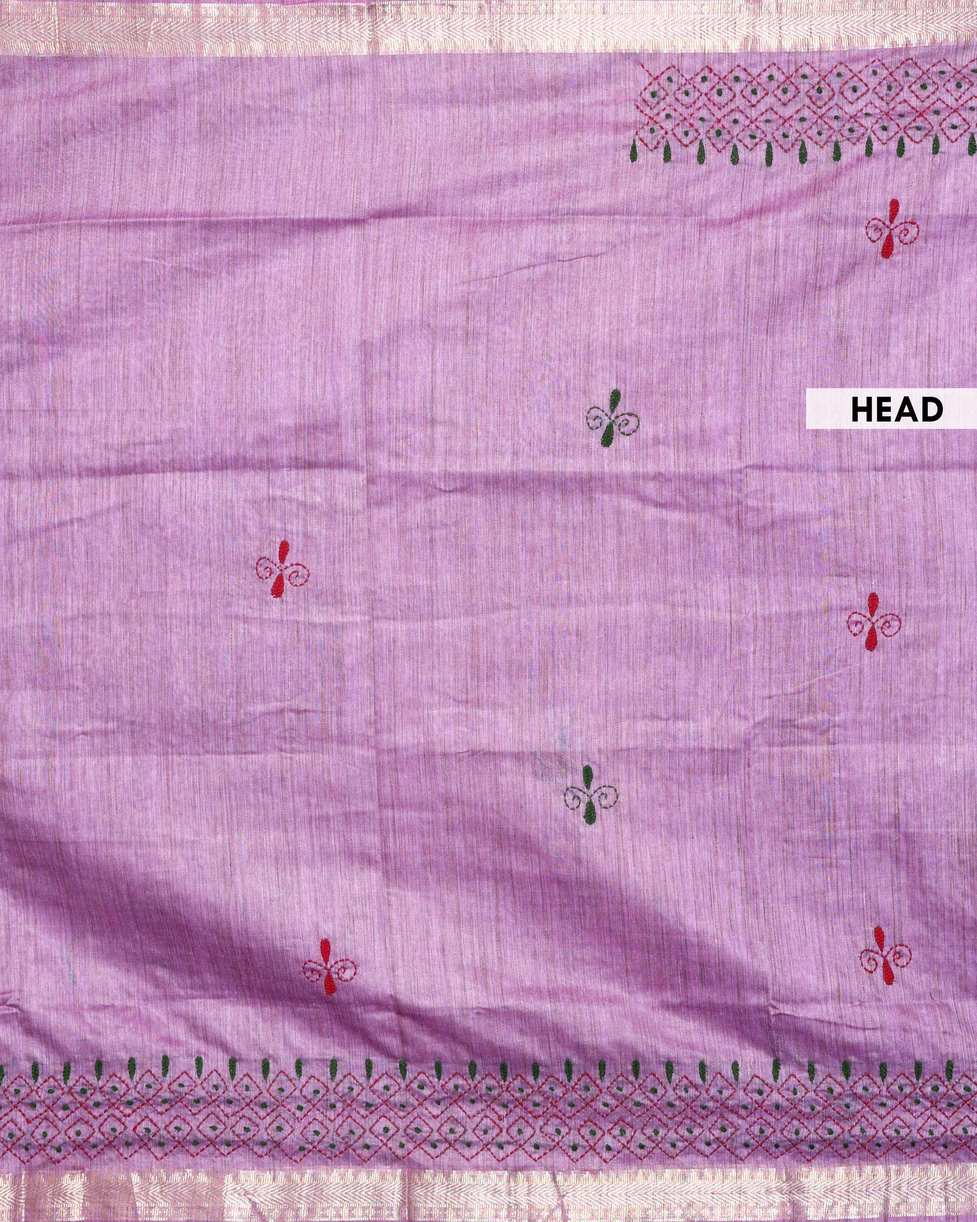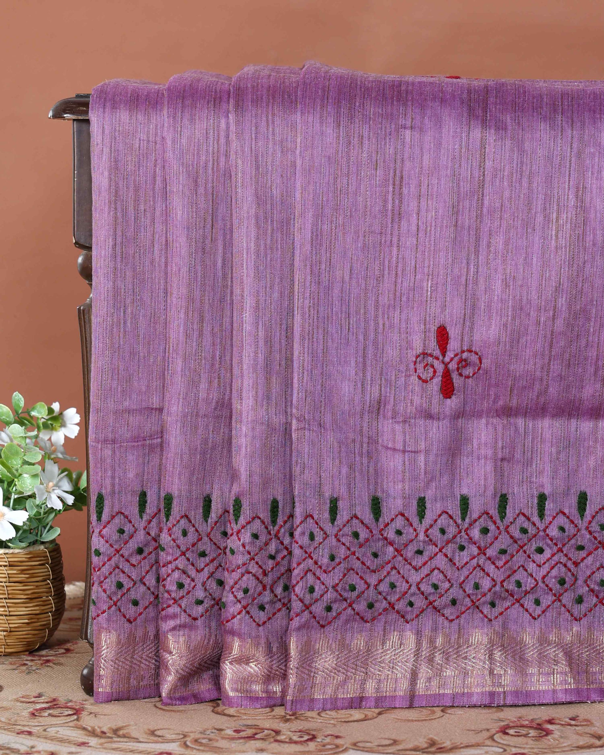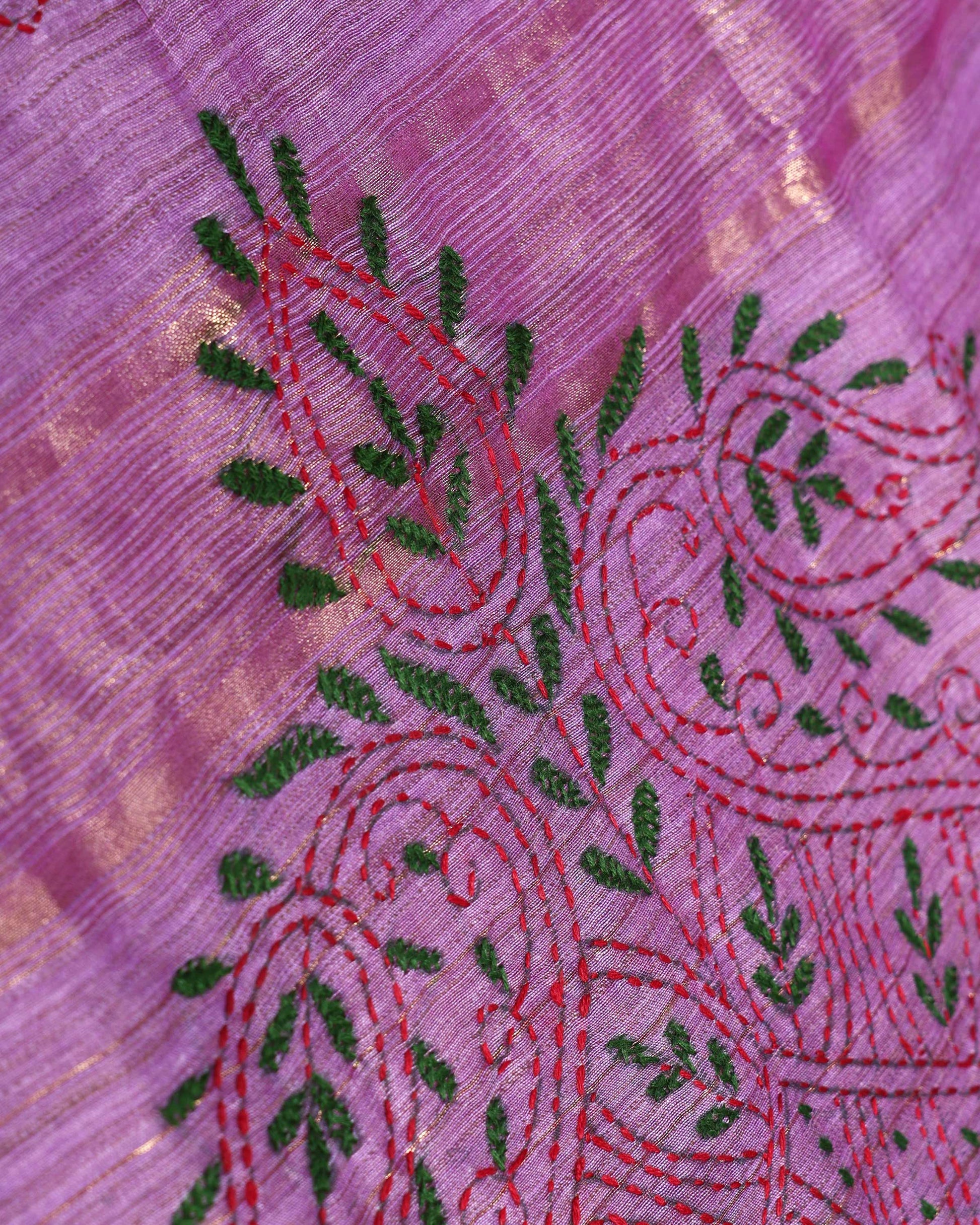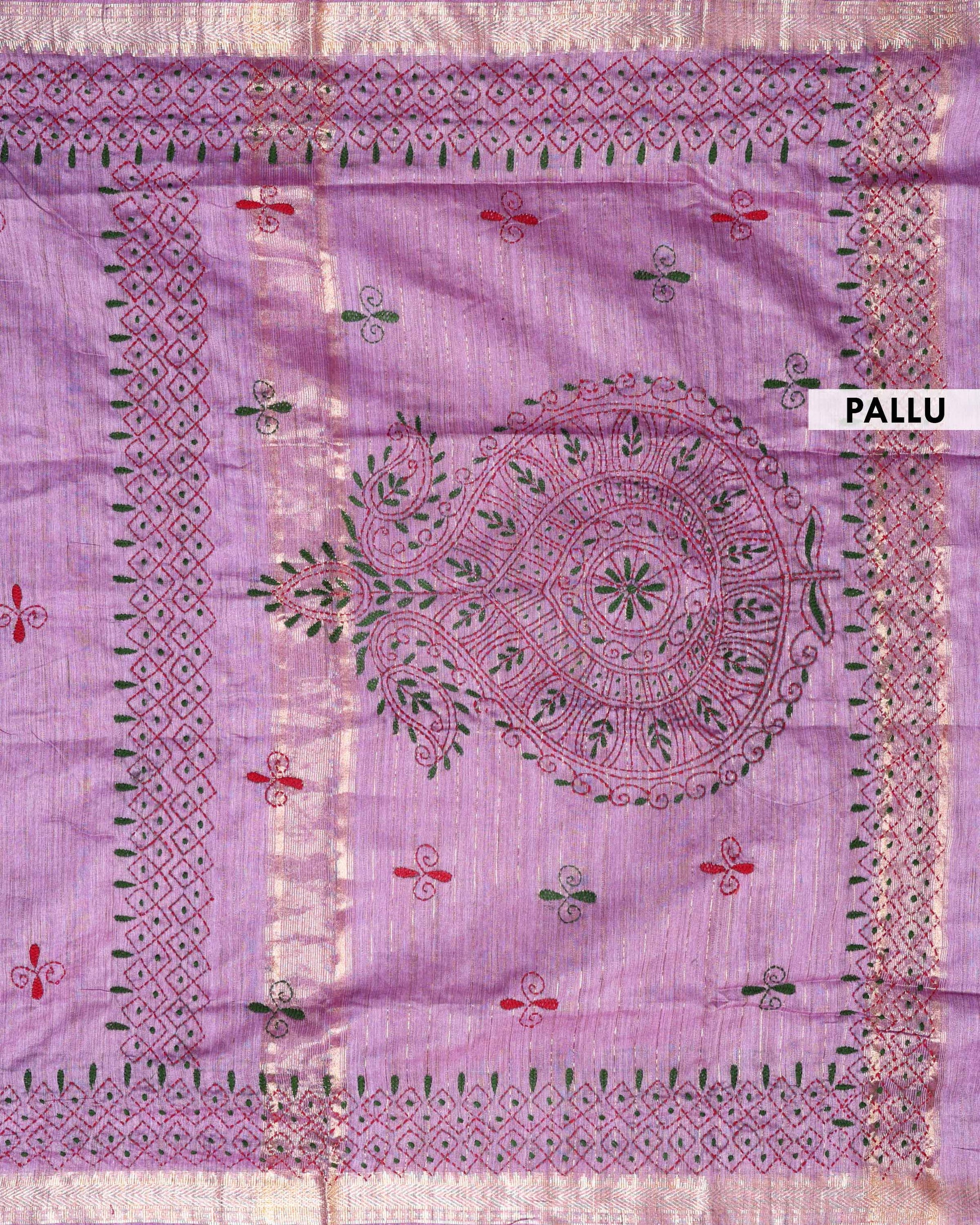 - This beautiful Purple Kantha saree features intricate traditional embroidery along the border and pallu