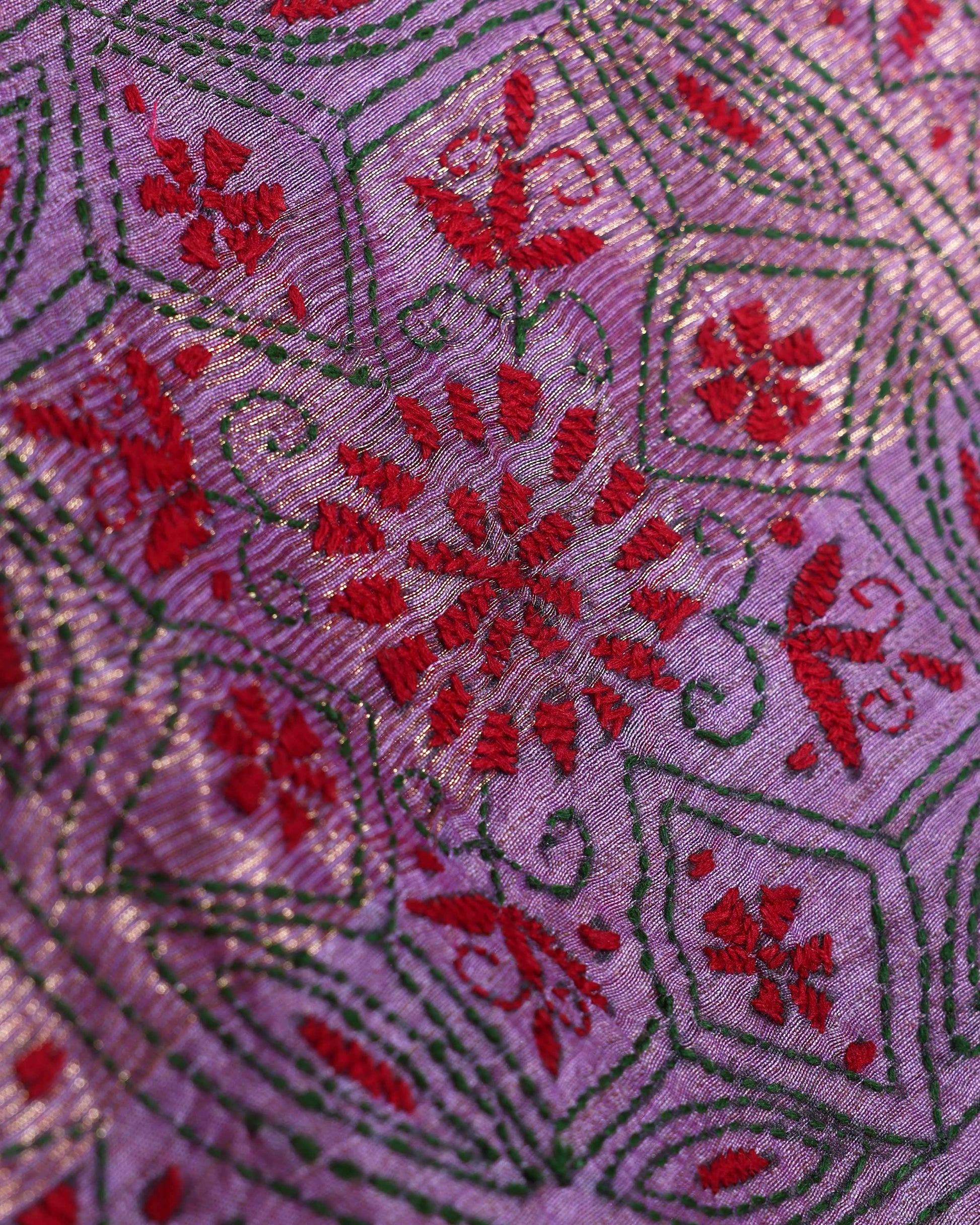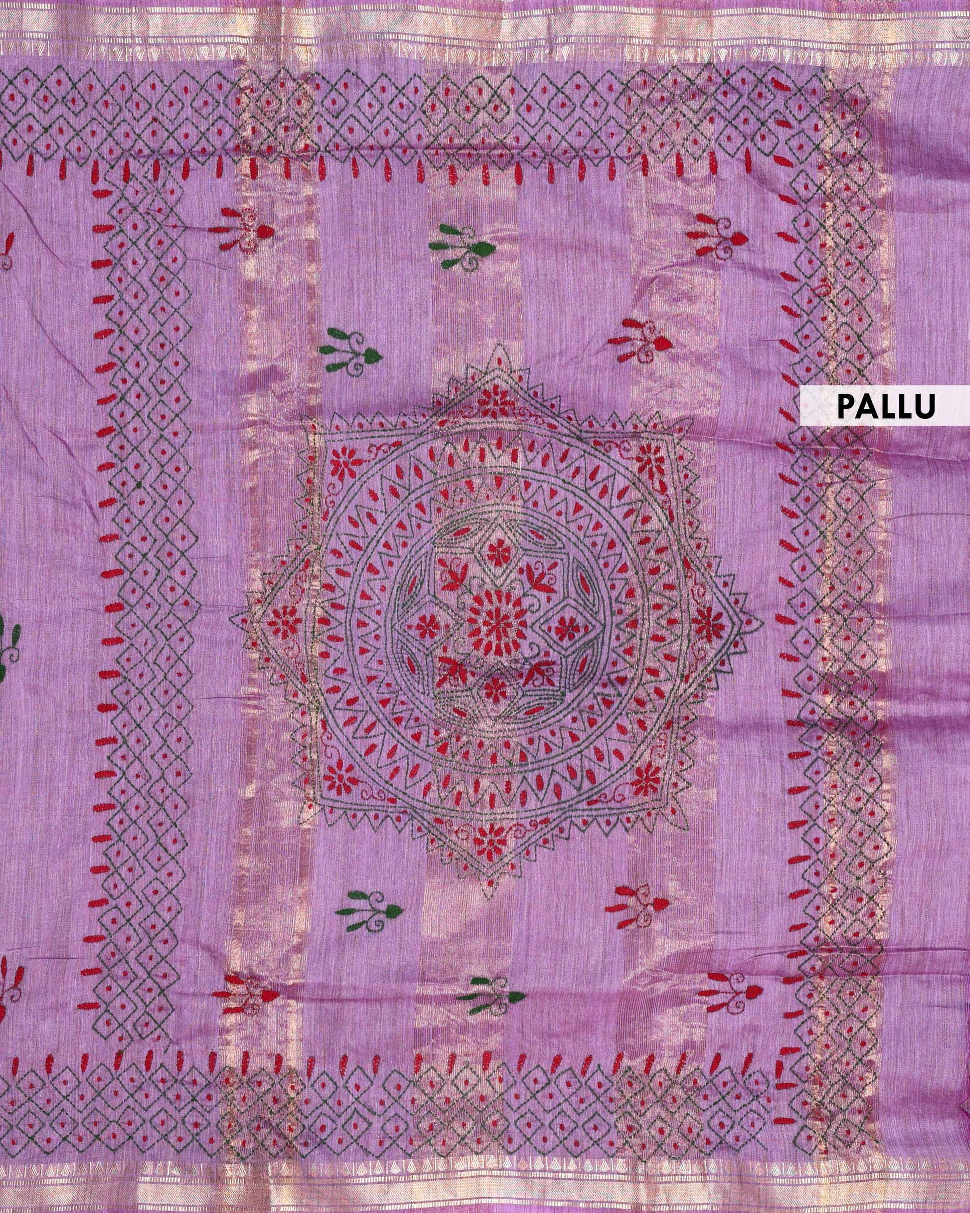 - This beautiful Purple Kantha saree features intricate traditional embroidery along the border and pallu