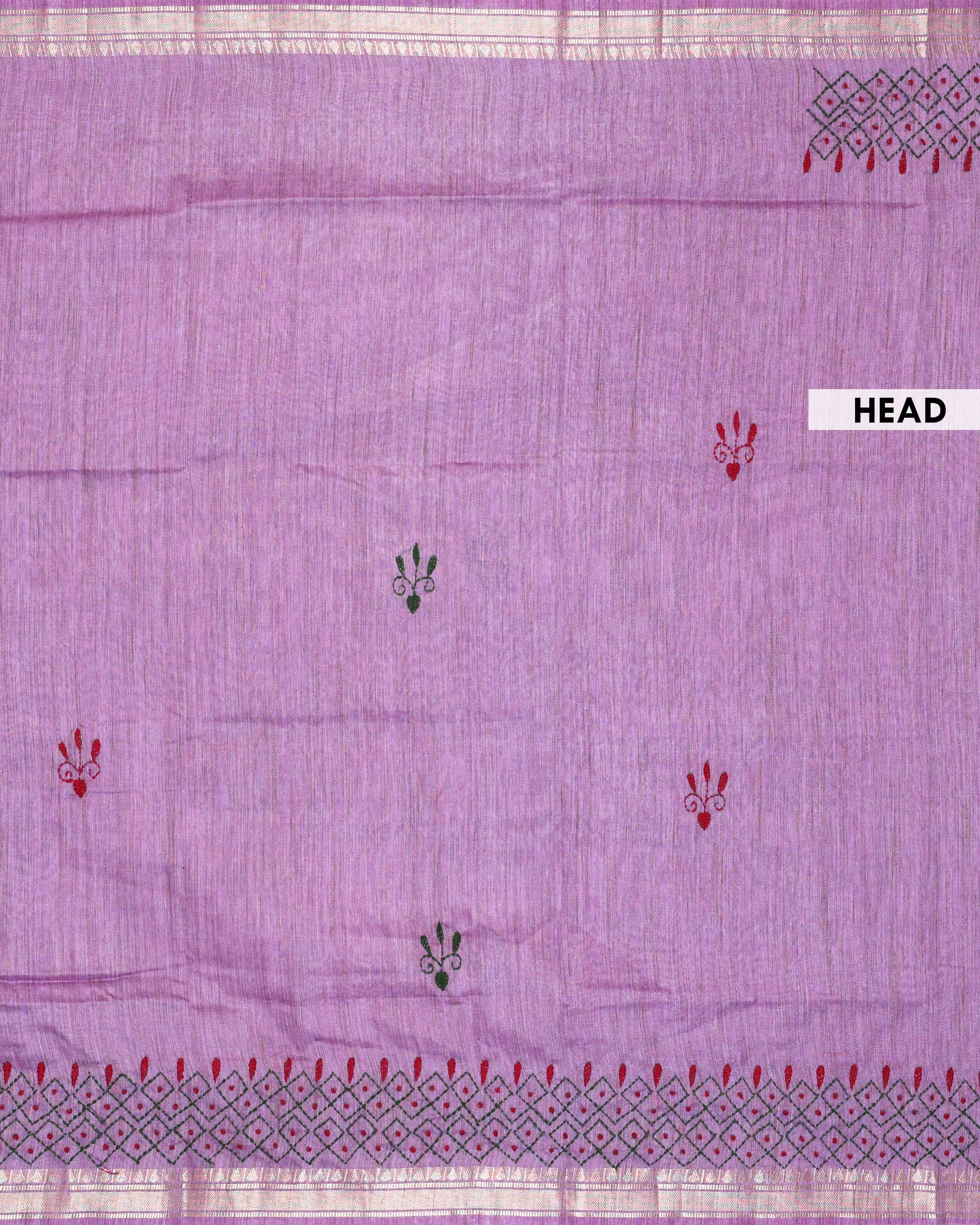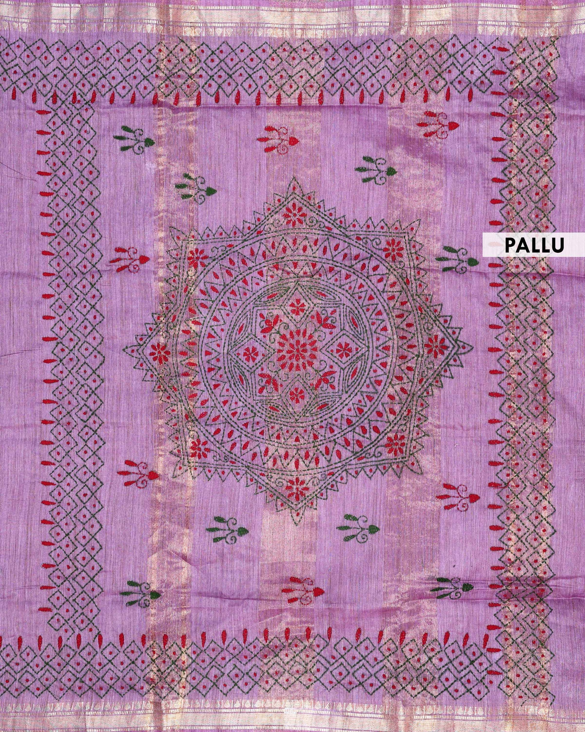- This beautiful Purple Kantha saree features intricate traditional embroidery along the border and pallu