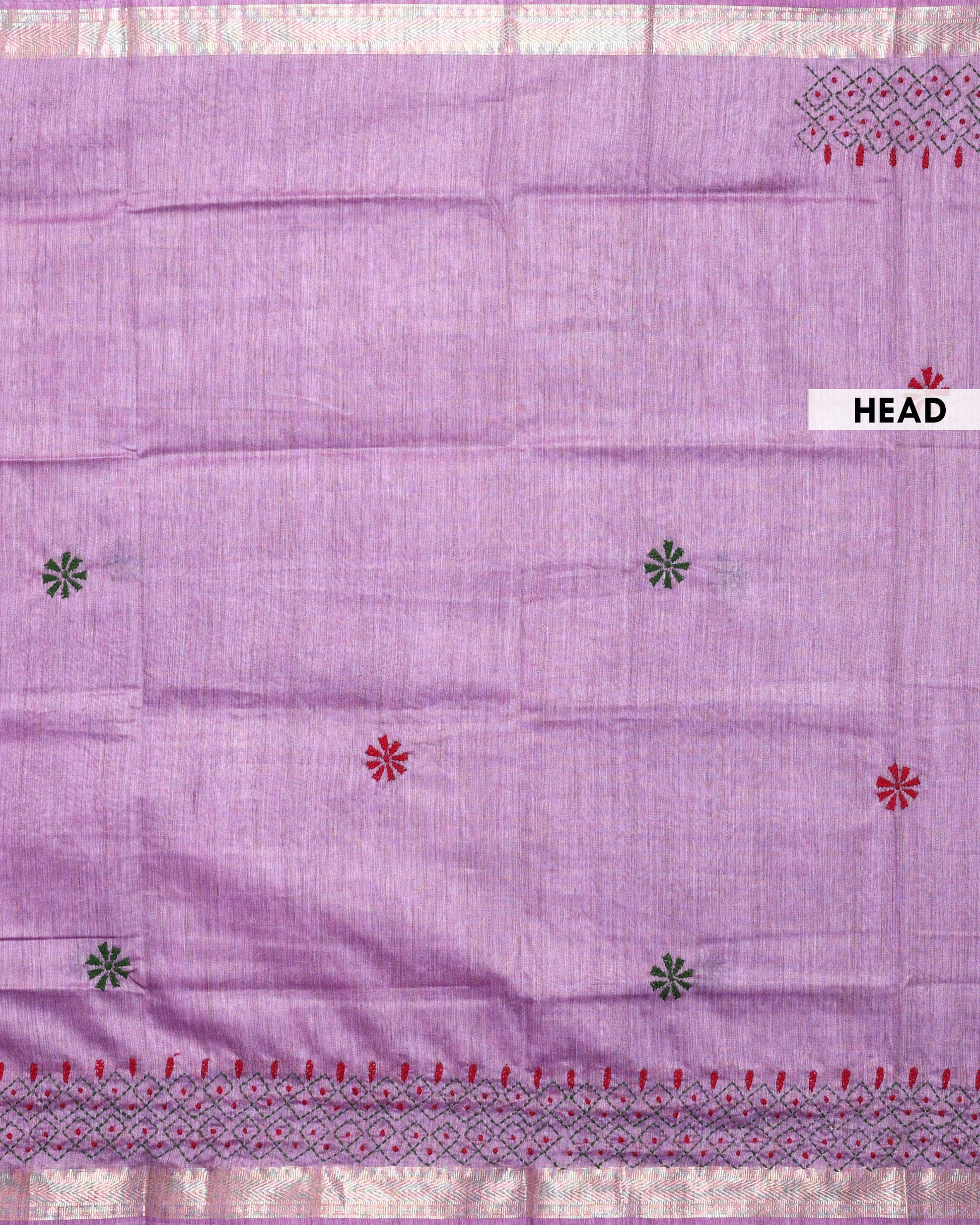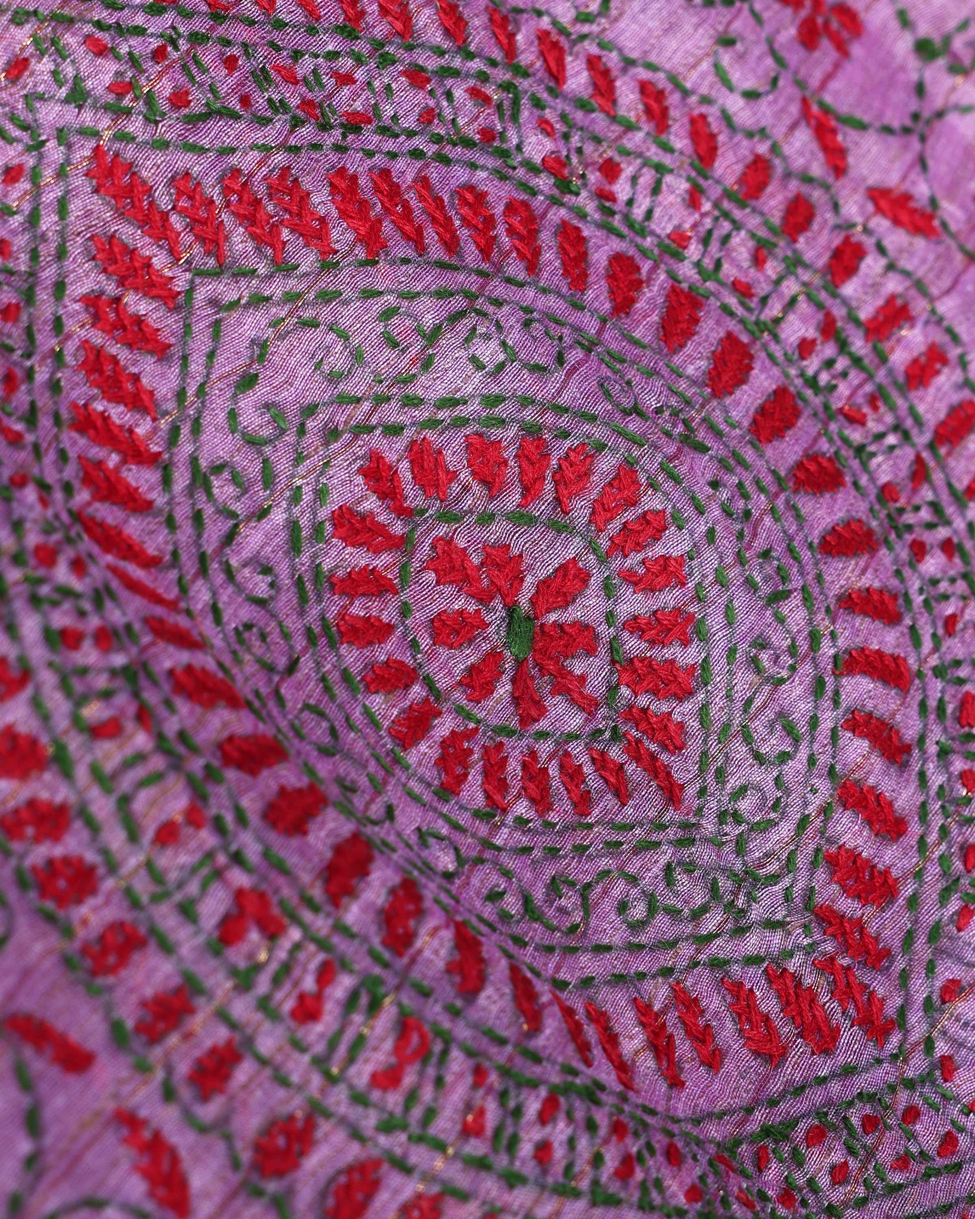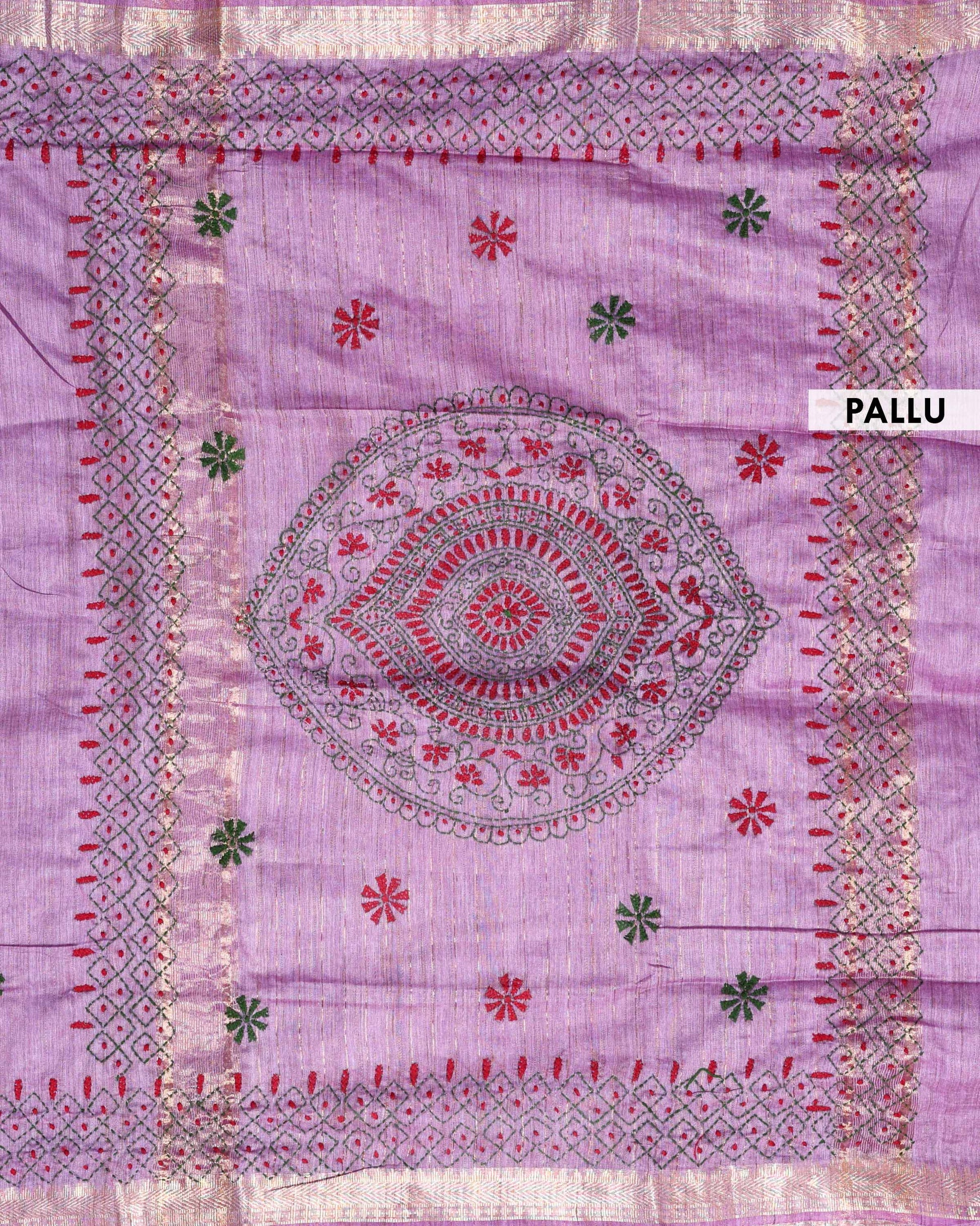 - This beautiful Purple Kantha saree features intricate traditional embroidery along the border and pallu
