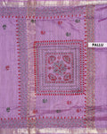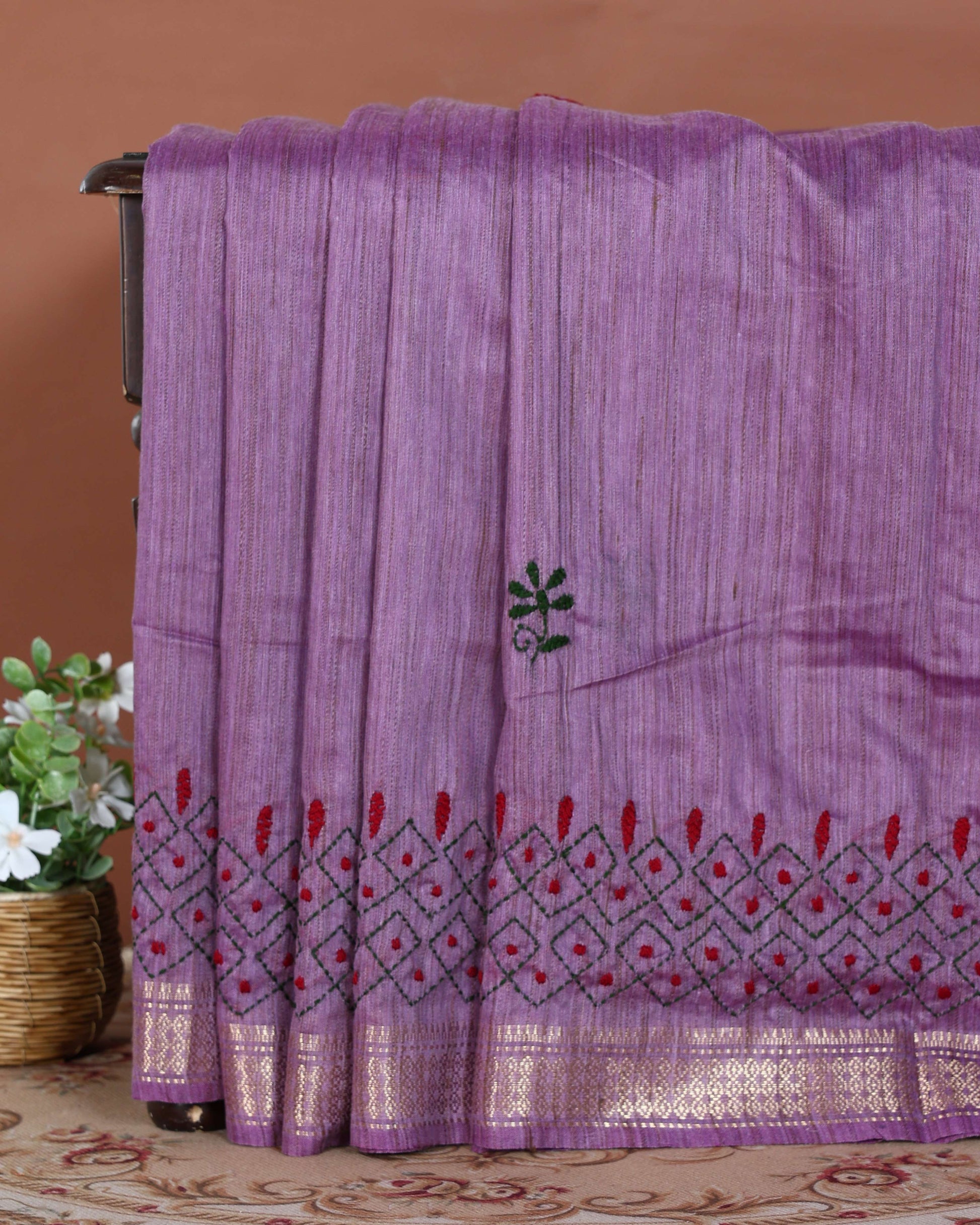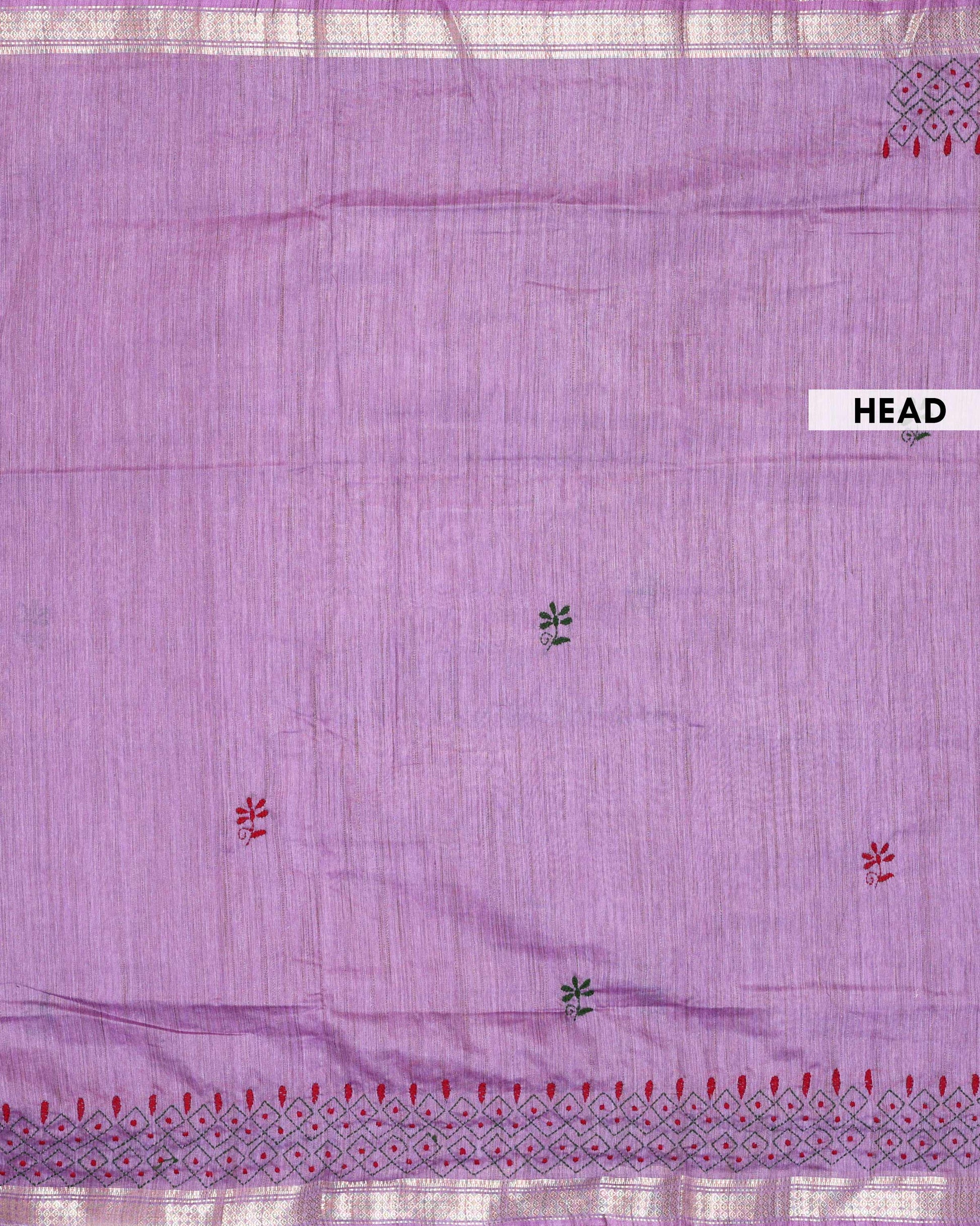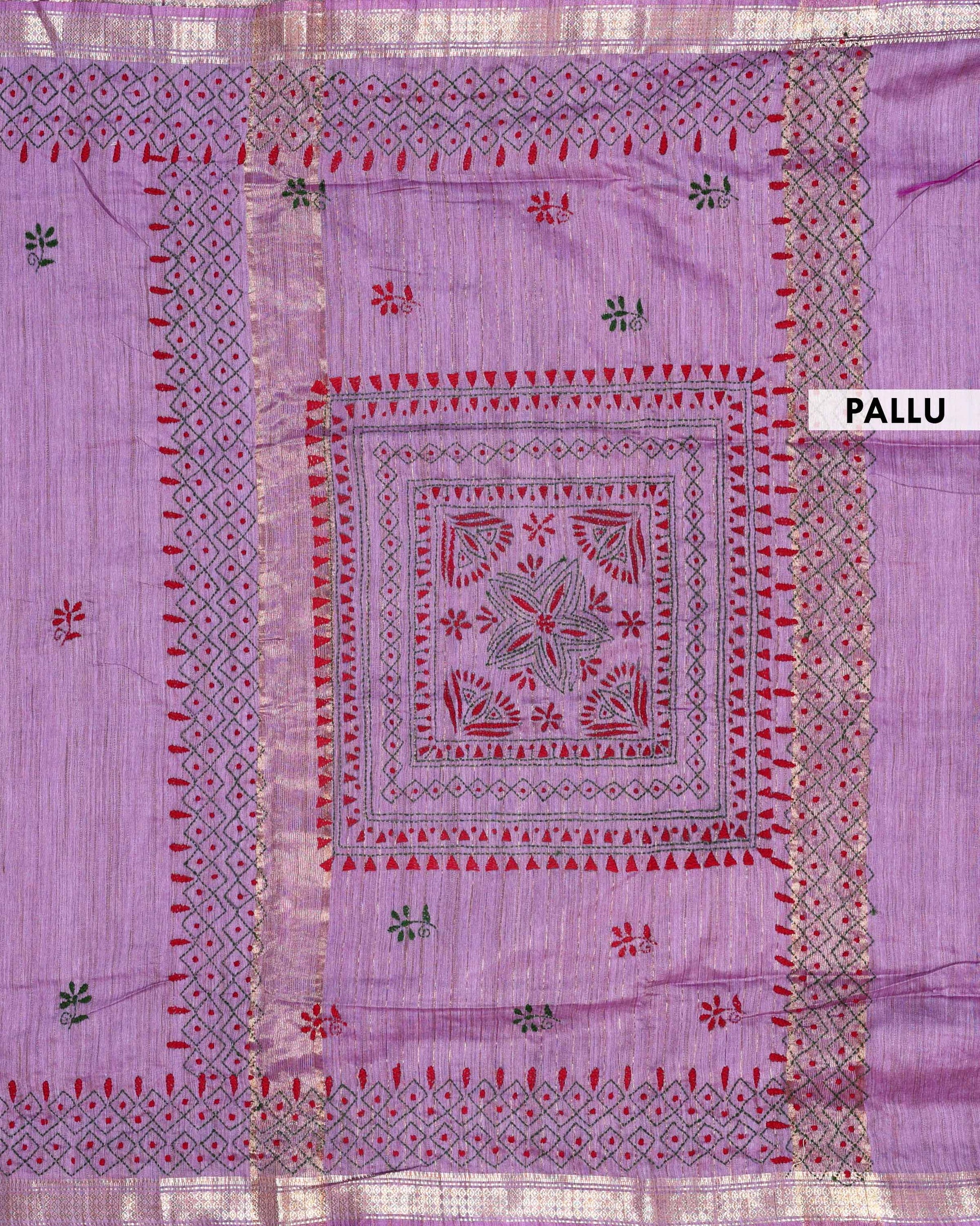 - This beautiful Purple Kantha saree features intricate traditional embroidery along the border and pallu