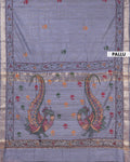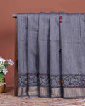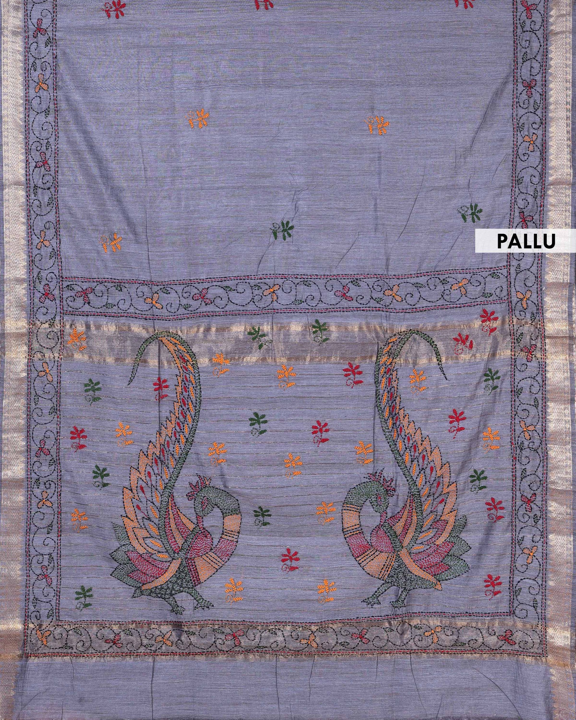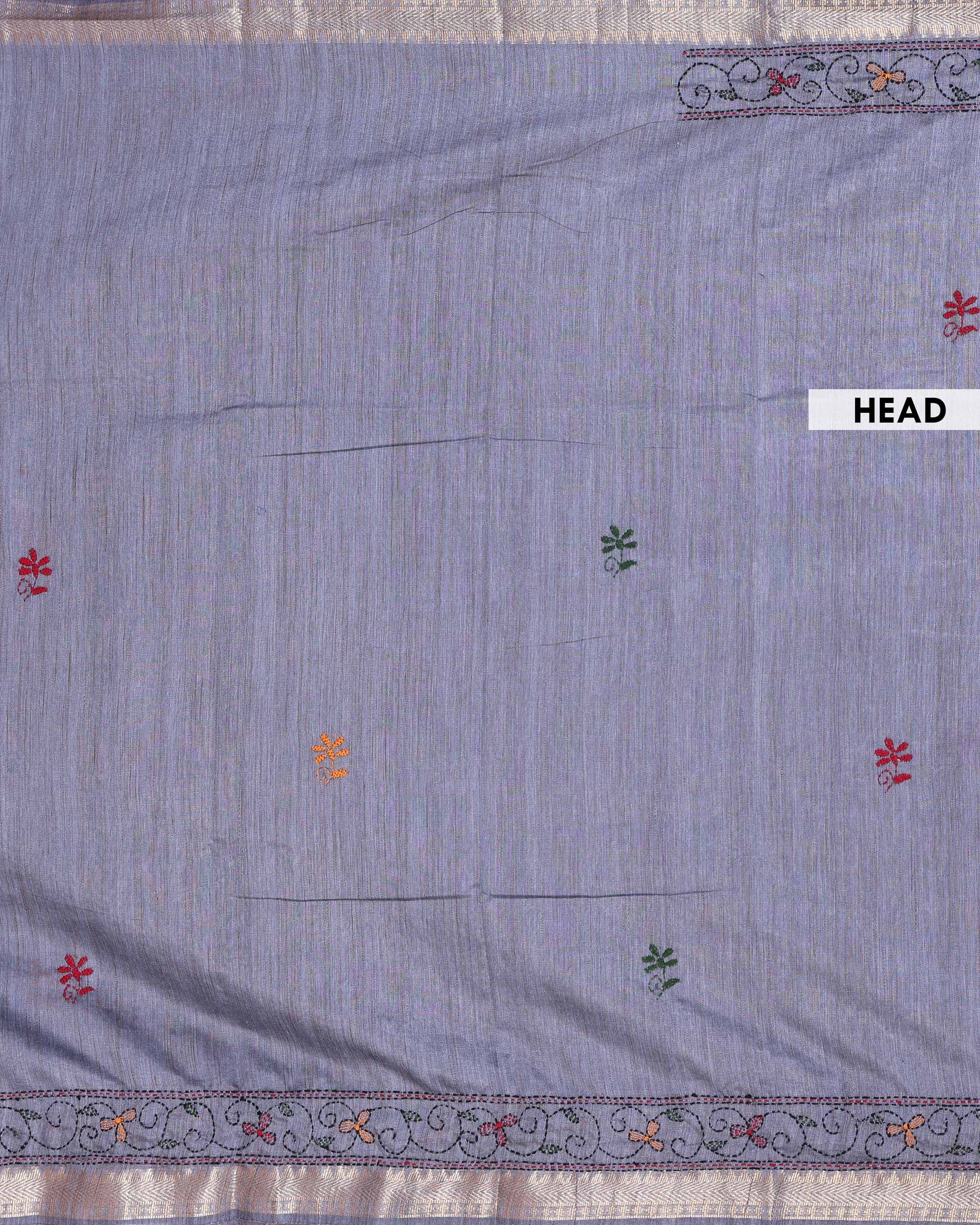 - Elevate any wardrobe with this stunning Dark Grey handloom Kantha saree featuring intricate floral and geometric hand embroidery along the border.