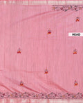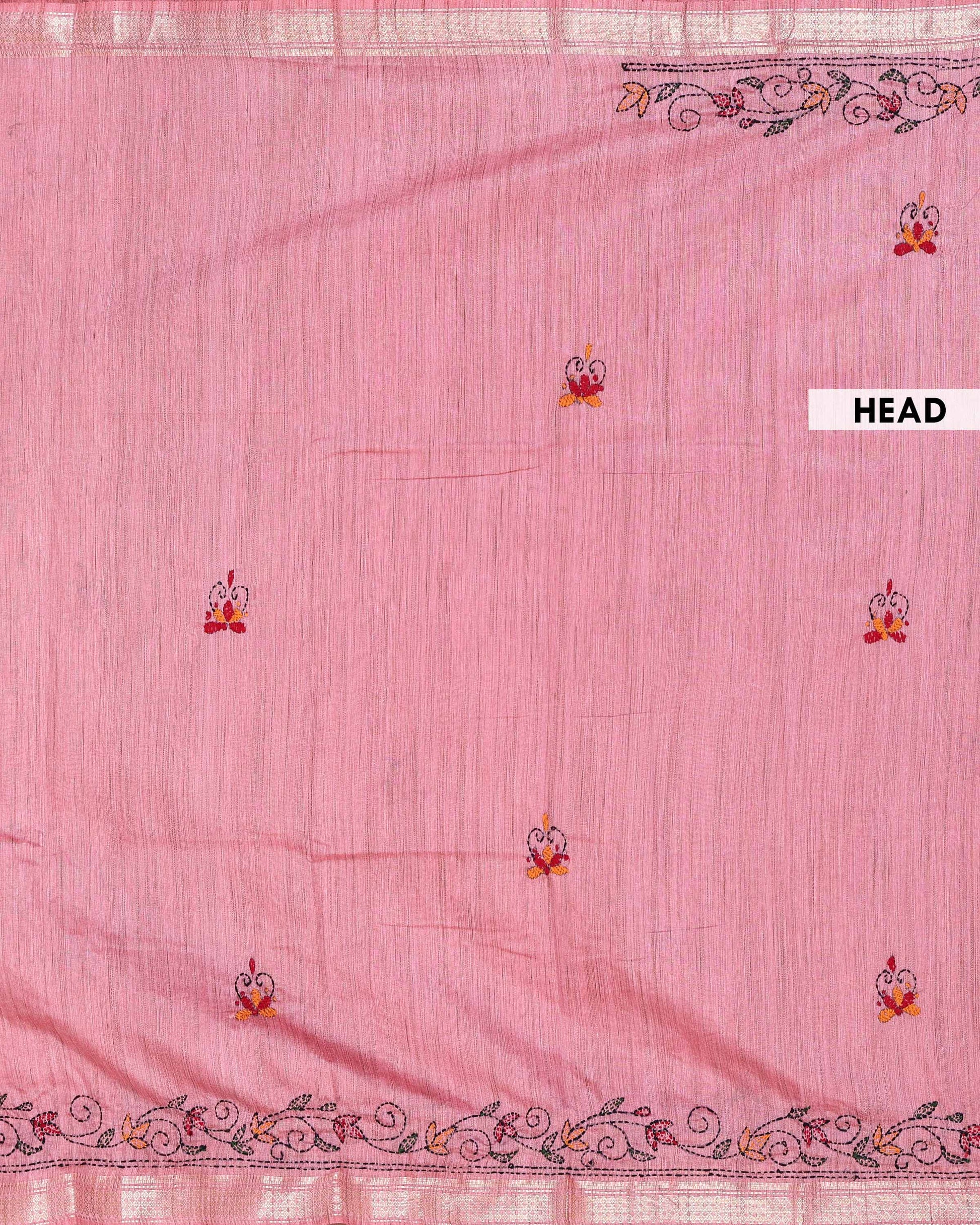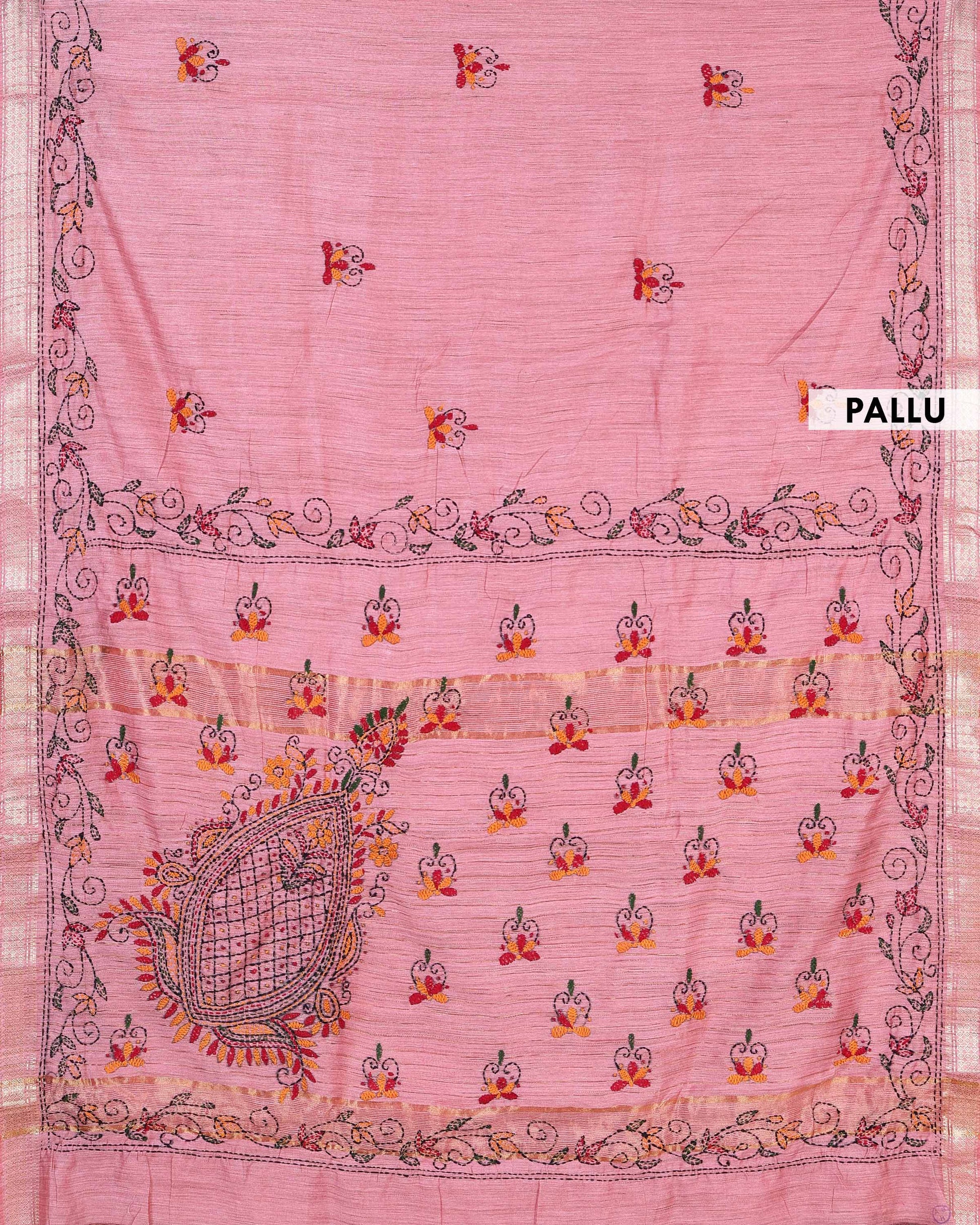 - Elevate any wardrobe with this stunning Dusty Pink handloom Kantha saree featuring intricate floral and geometric hand embroidery along the border.