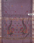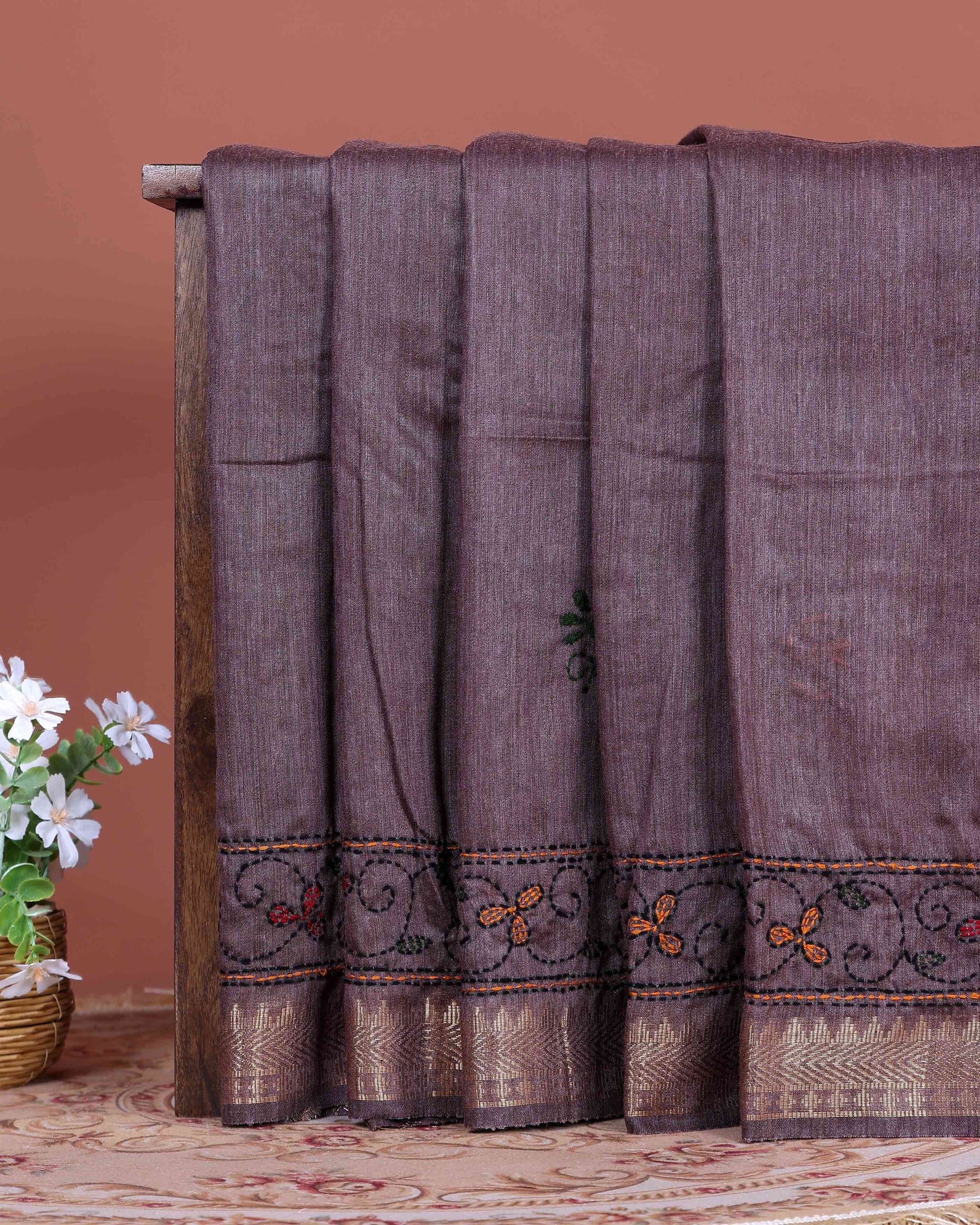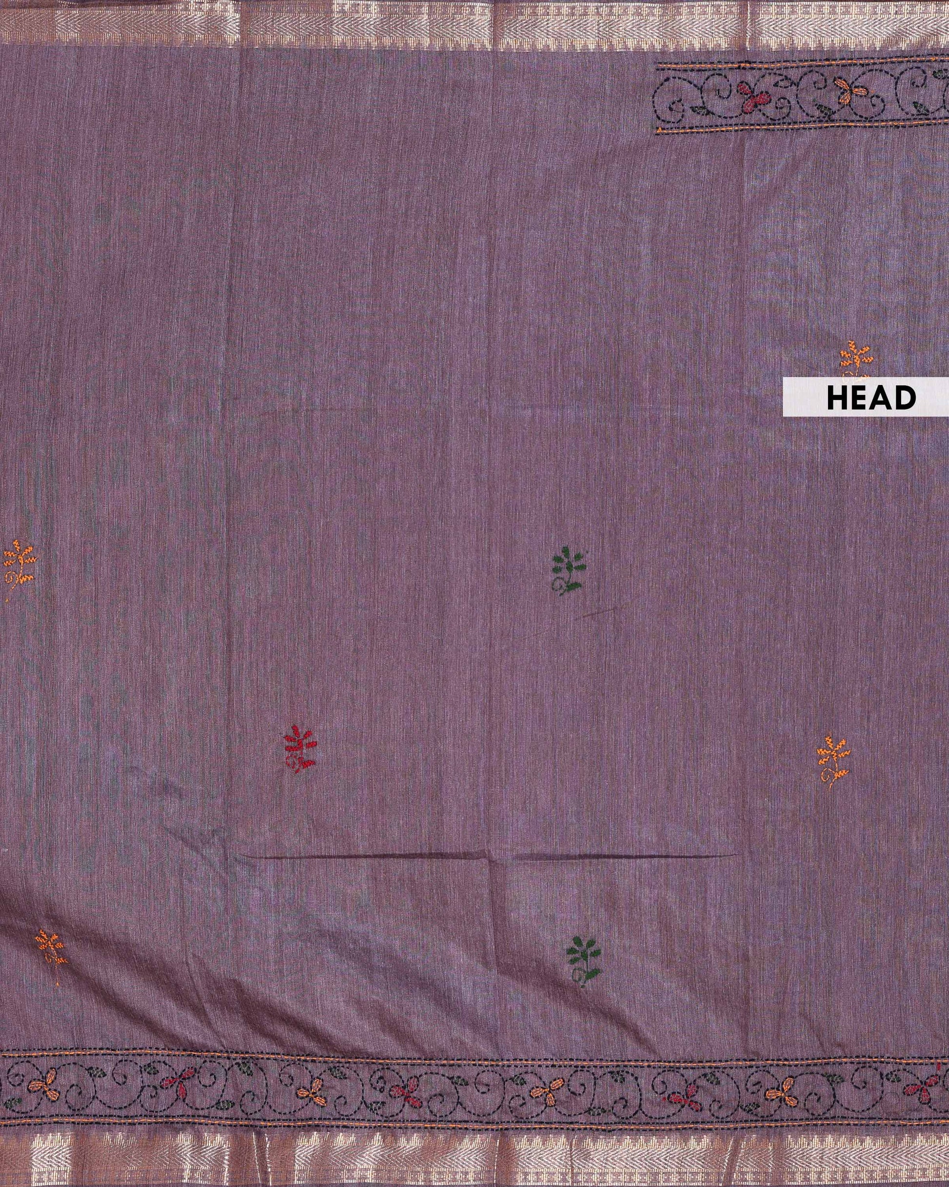 - Elevate any wardrobe with this stunning Dusty Purple handloom Kantha saree featuring intricate floral and geometric hand embroidery along the border.