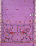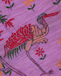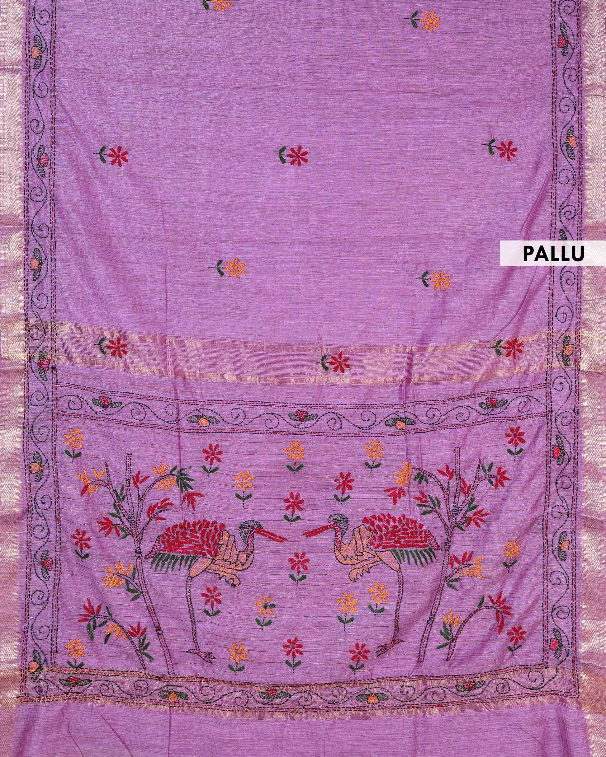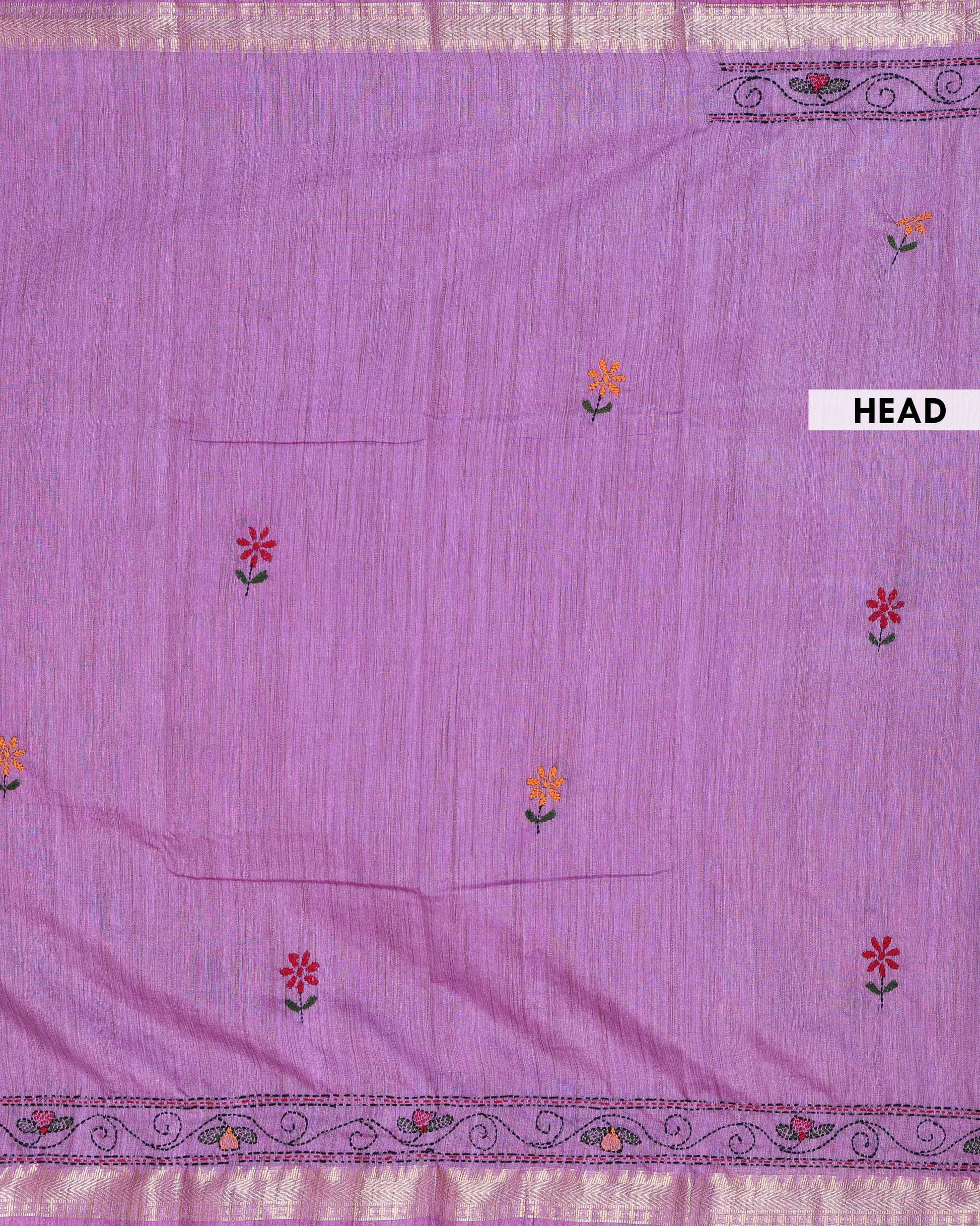 - Elevate any wardrobe with this stunning Lavender handloom Kantha saree featuring intricate floral and geometric hand embroidery along the border.