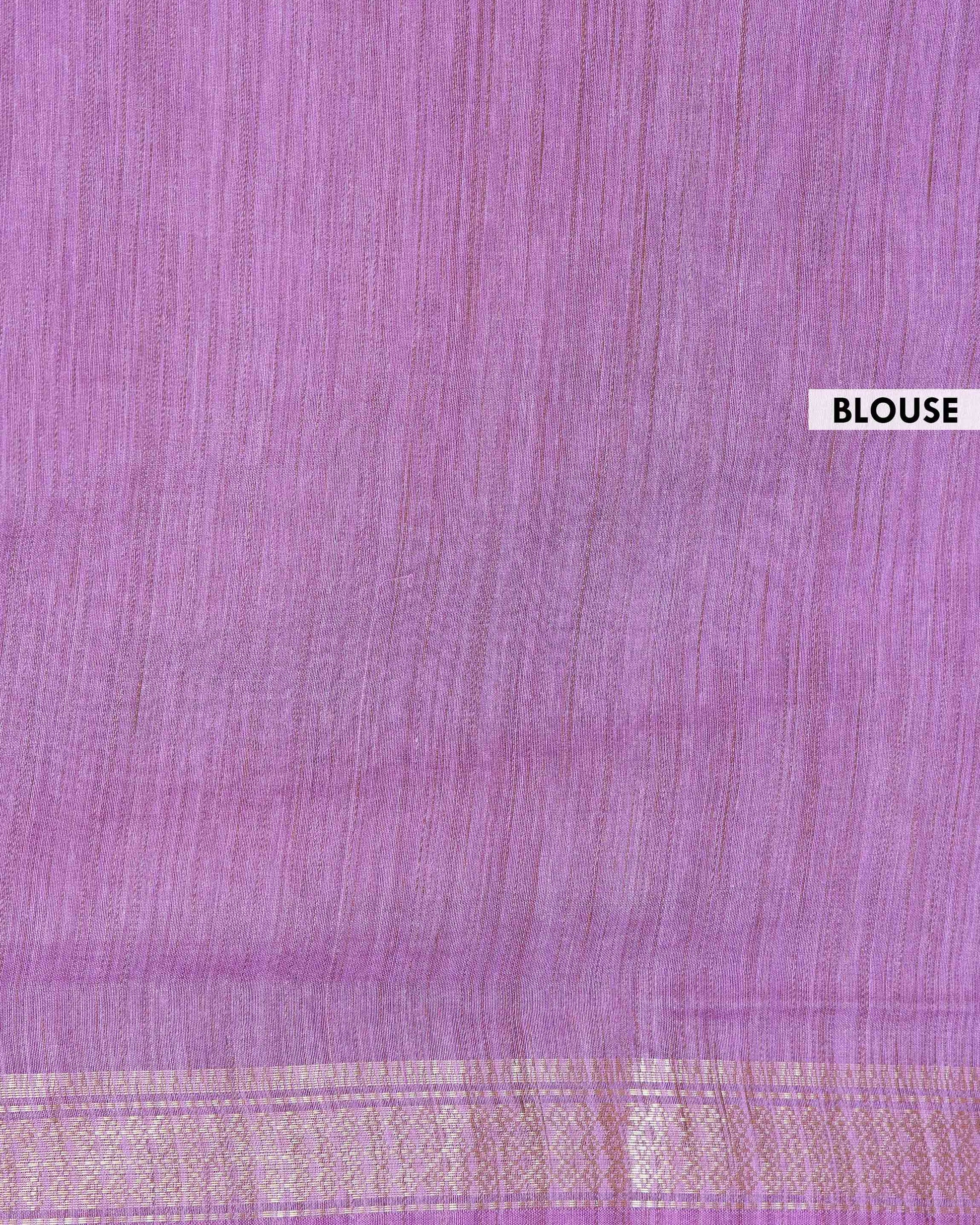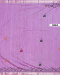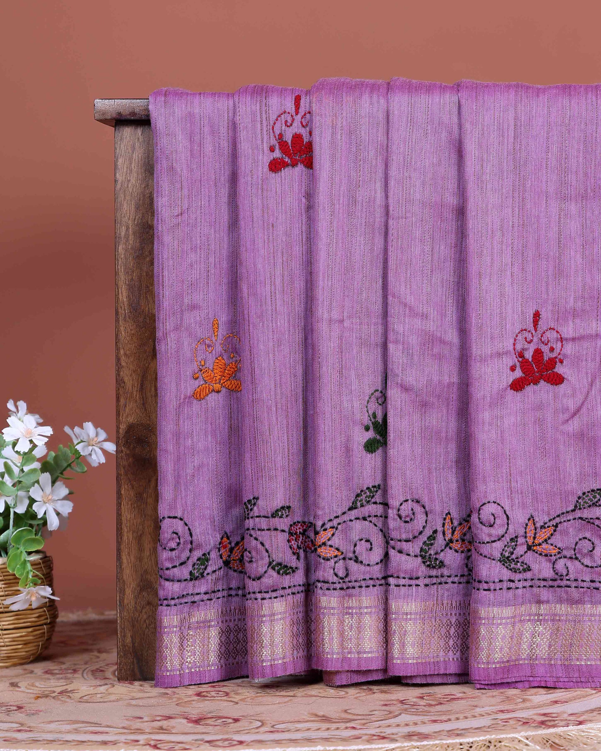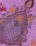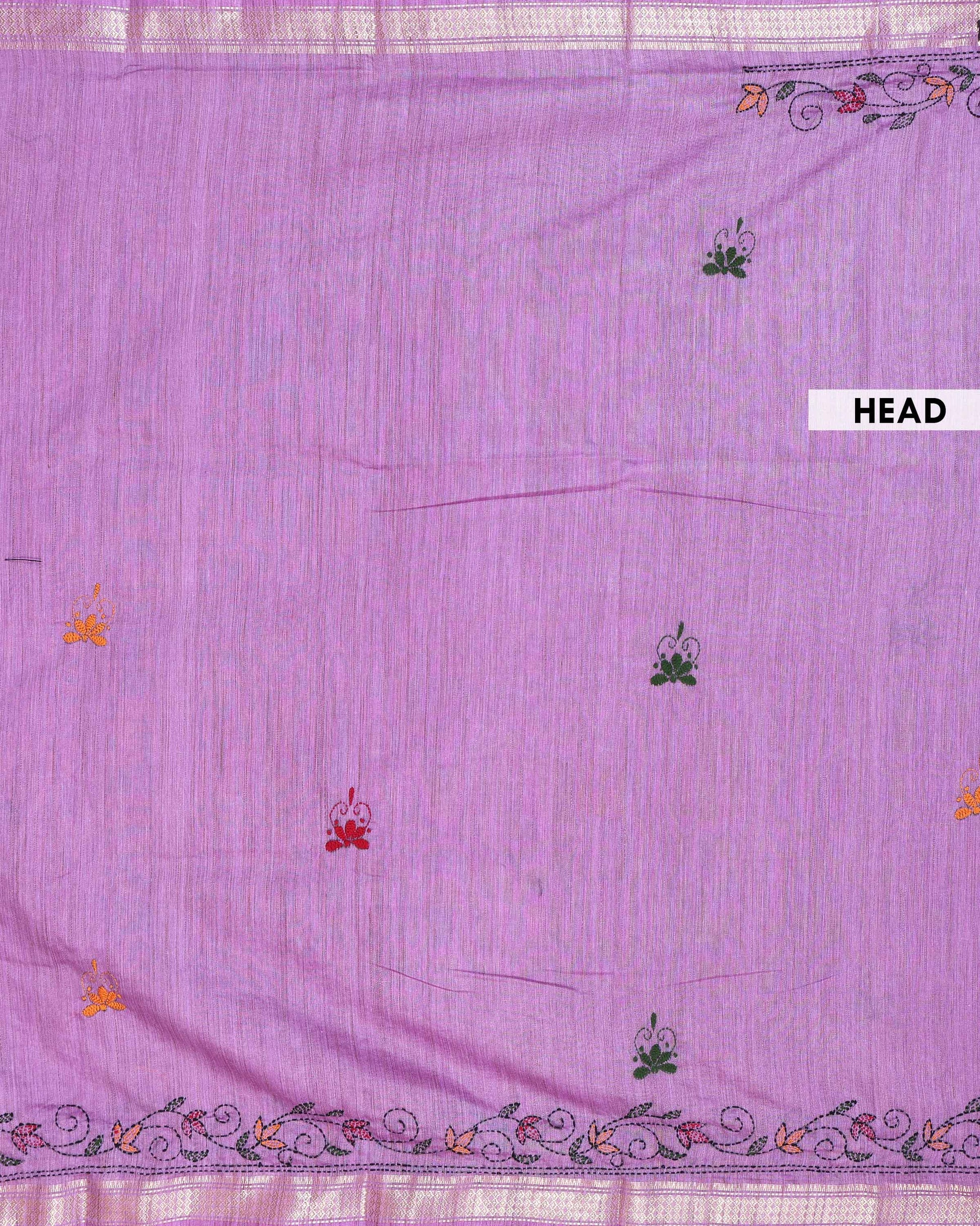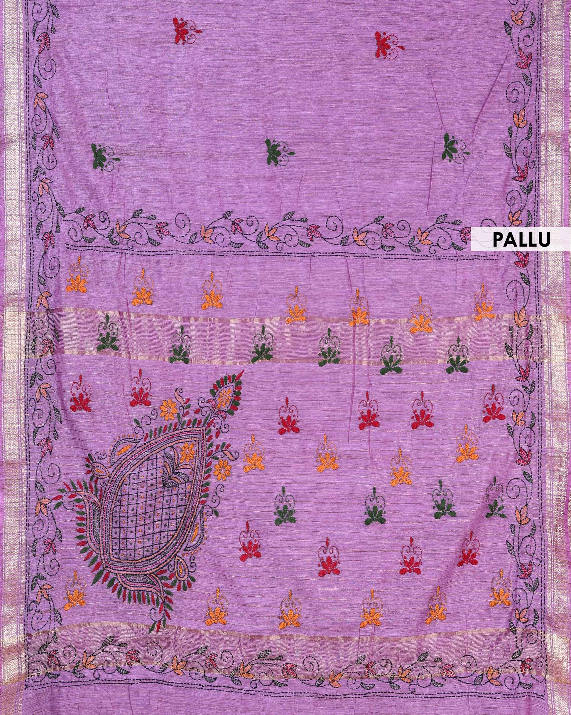 - Elevate any wardrobe with this stunning Lavender handloom Kantha saree featuring intricate floral and geometric hand embroidery along the border.