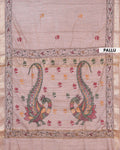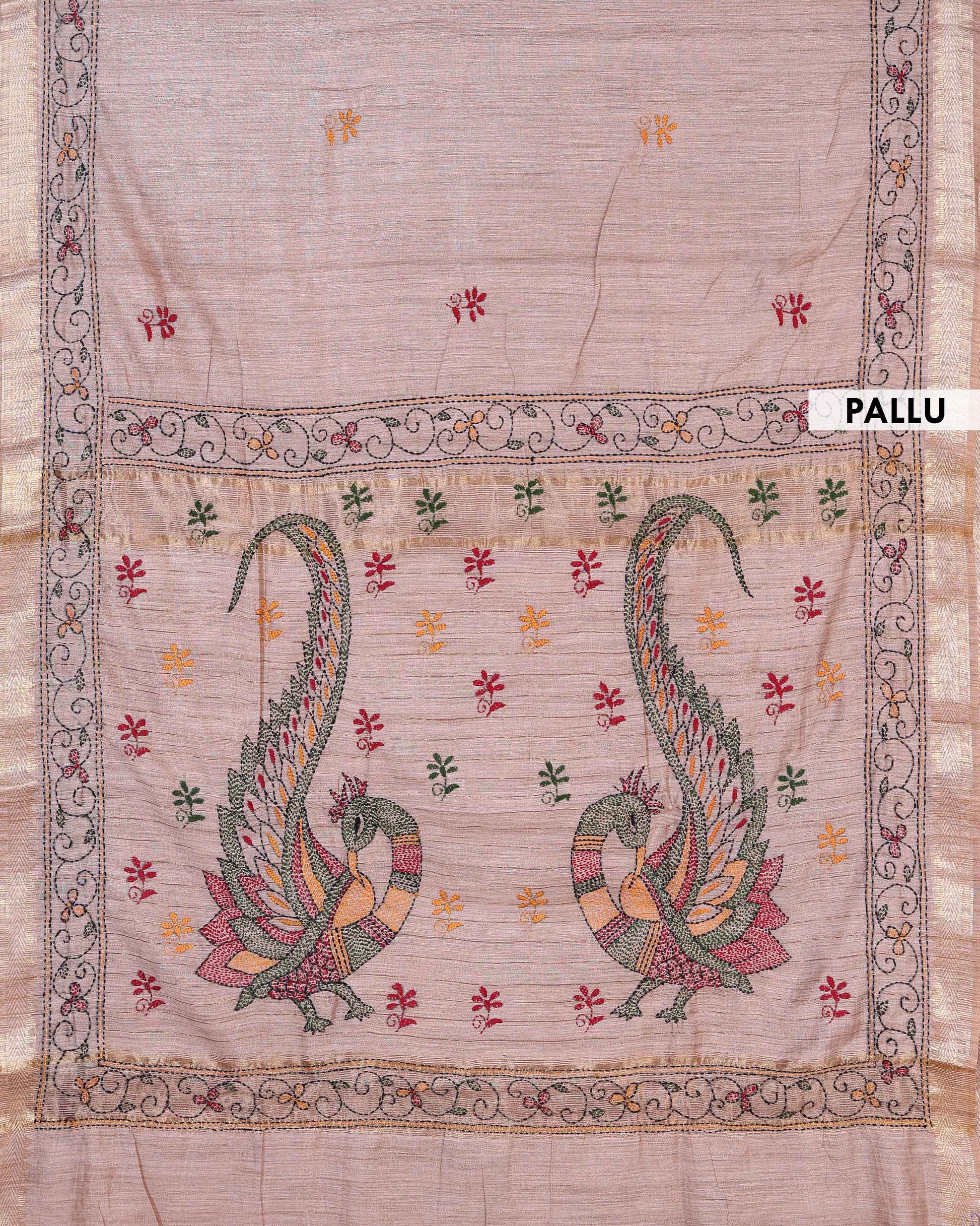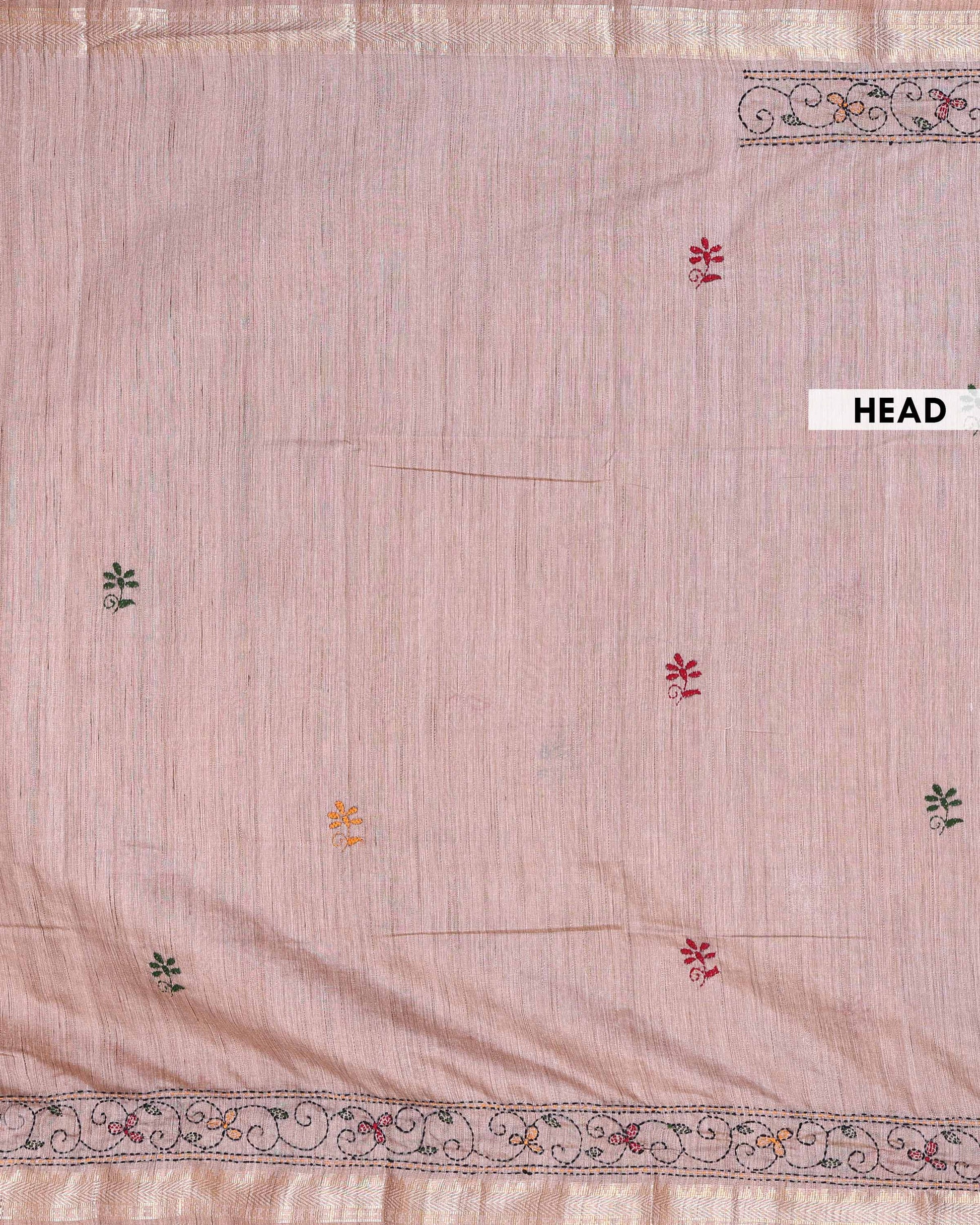 - Elevate any wardrobe with this stunning Light Brown handloom Kantha saree featuring intricate floral and geometric hand embroidery along the border.