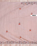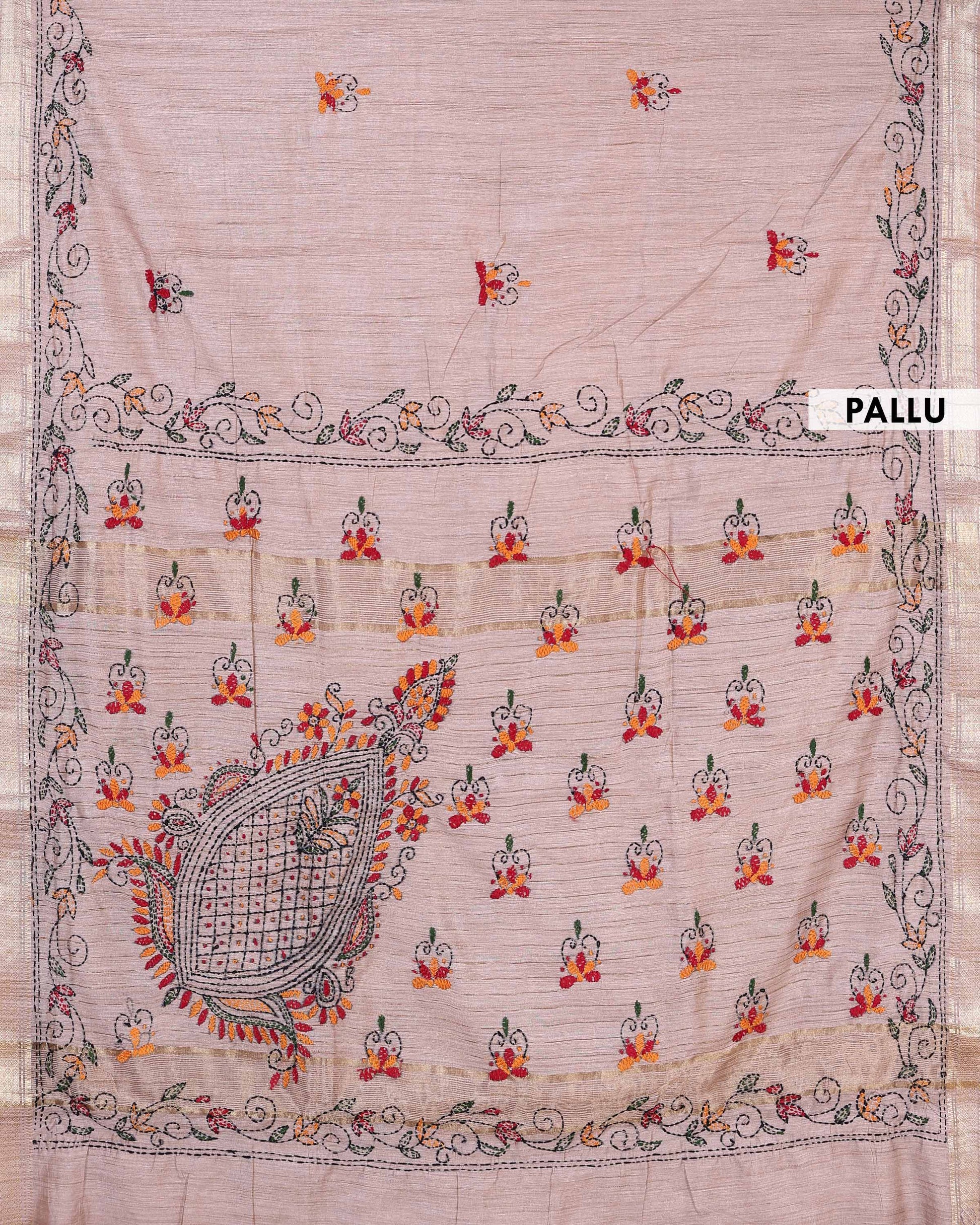 - Elevate any wardrobe with this stunning Light Brown handloom Kantha saree featuring intricate floral and geometric hand embroidery along the border.