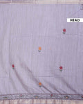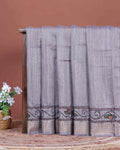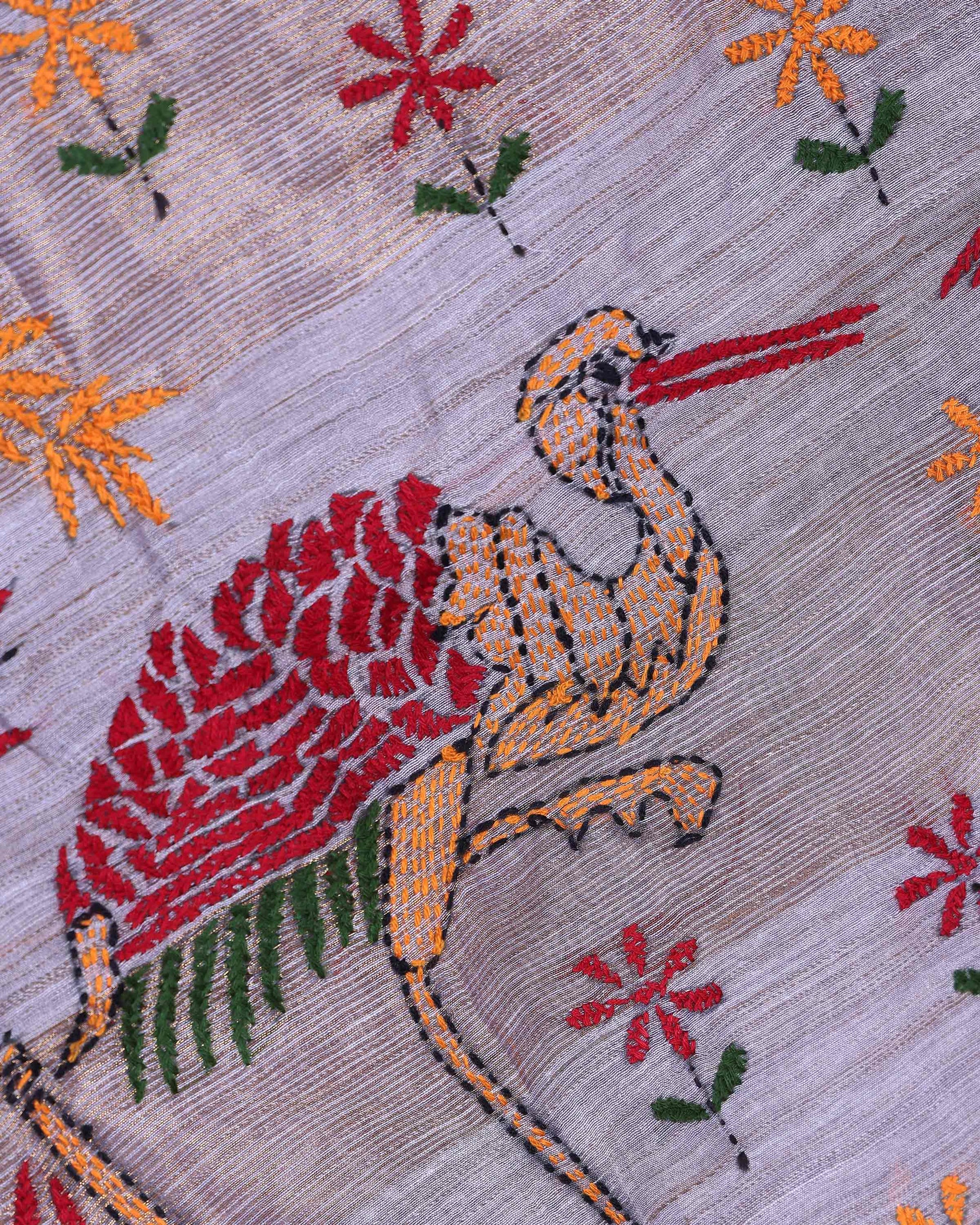 - This elegant light grey kantha saree features intricate kantha work with vibrant floral and geometric motifs along the border.