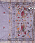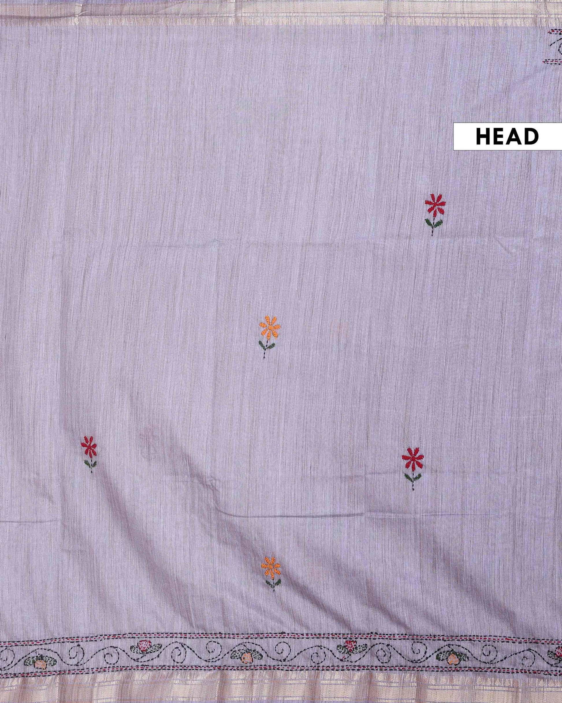 Elegant Kantha Hand Embroidered Saree with Traditional Floral Motifs and Woven Contrast Border - Light Grey