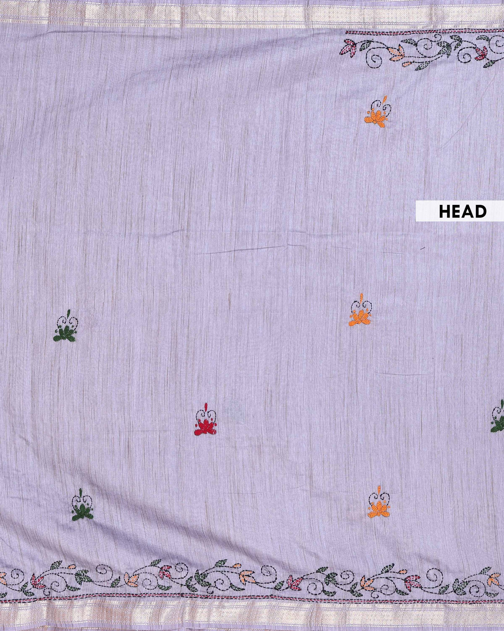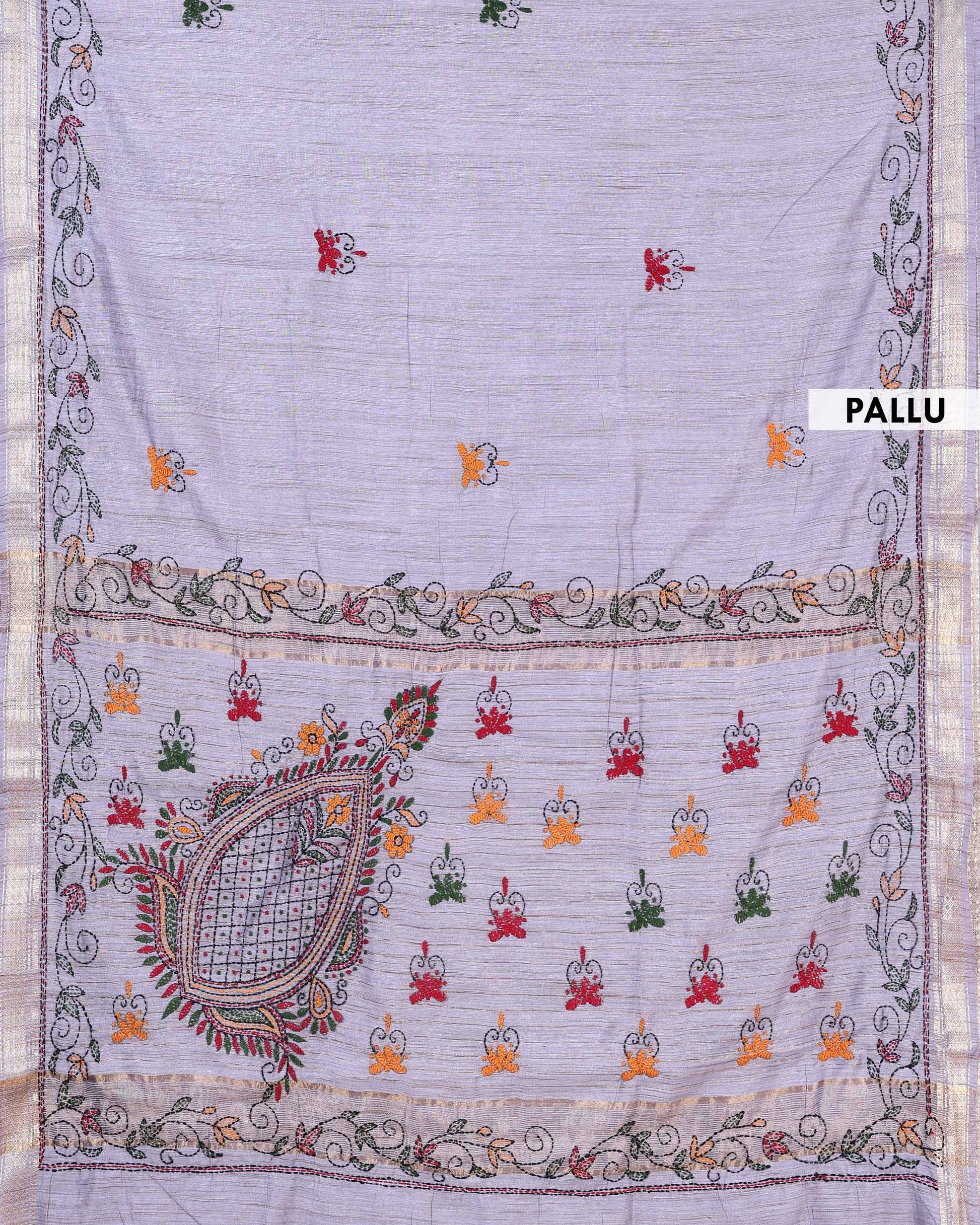 - Elevate any wardrobe with this stunning Light Grey handloom Kantha saree featuring intricate floral and geometric hand embroidery along the border.