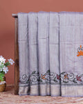 Elegant Kantha Hand Embroidered Saree with Traditional Floral Motifs and Woven Contrast Border - Light Grey