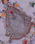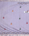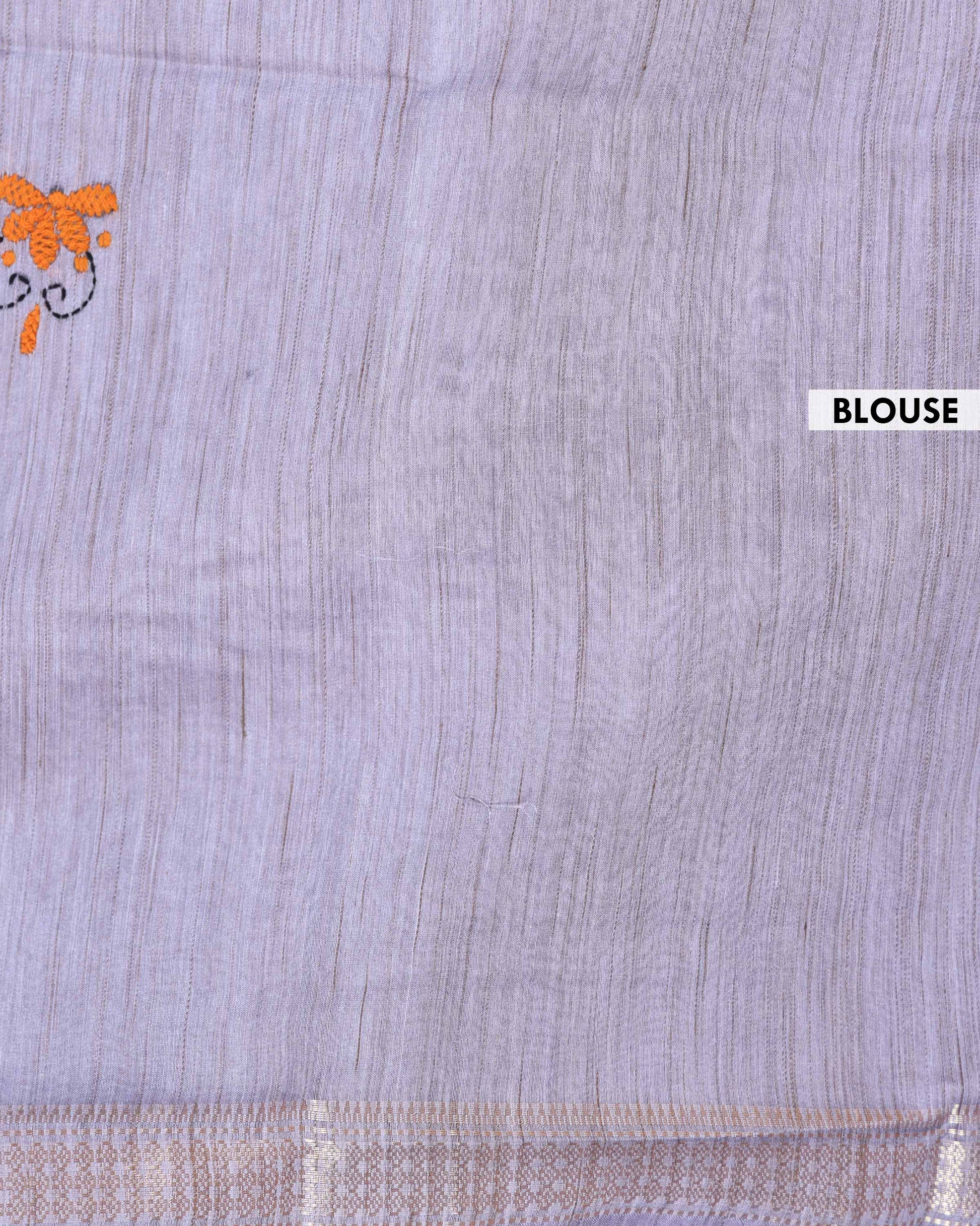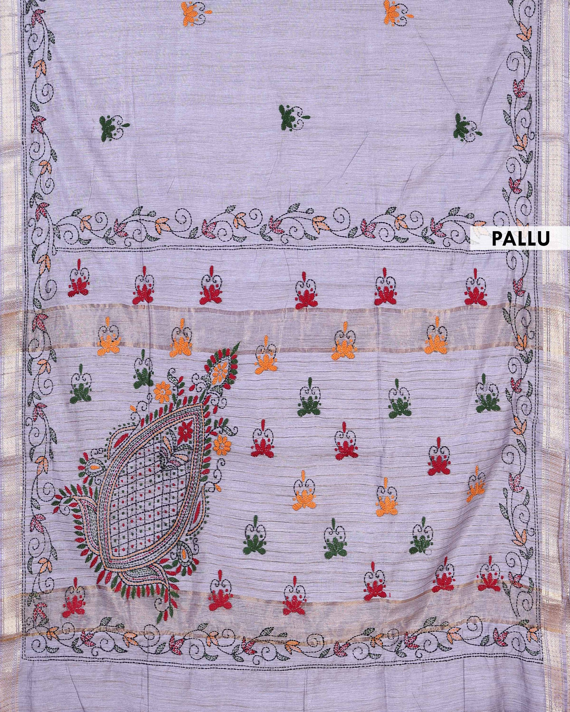 - Elevate any wardrobe with this stunning Light Grey handloom Kantha saree featuring intricate floral and geometric hand embroidery along the border.
