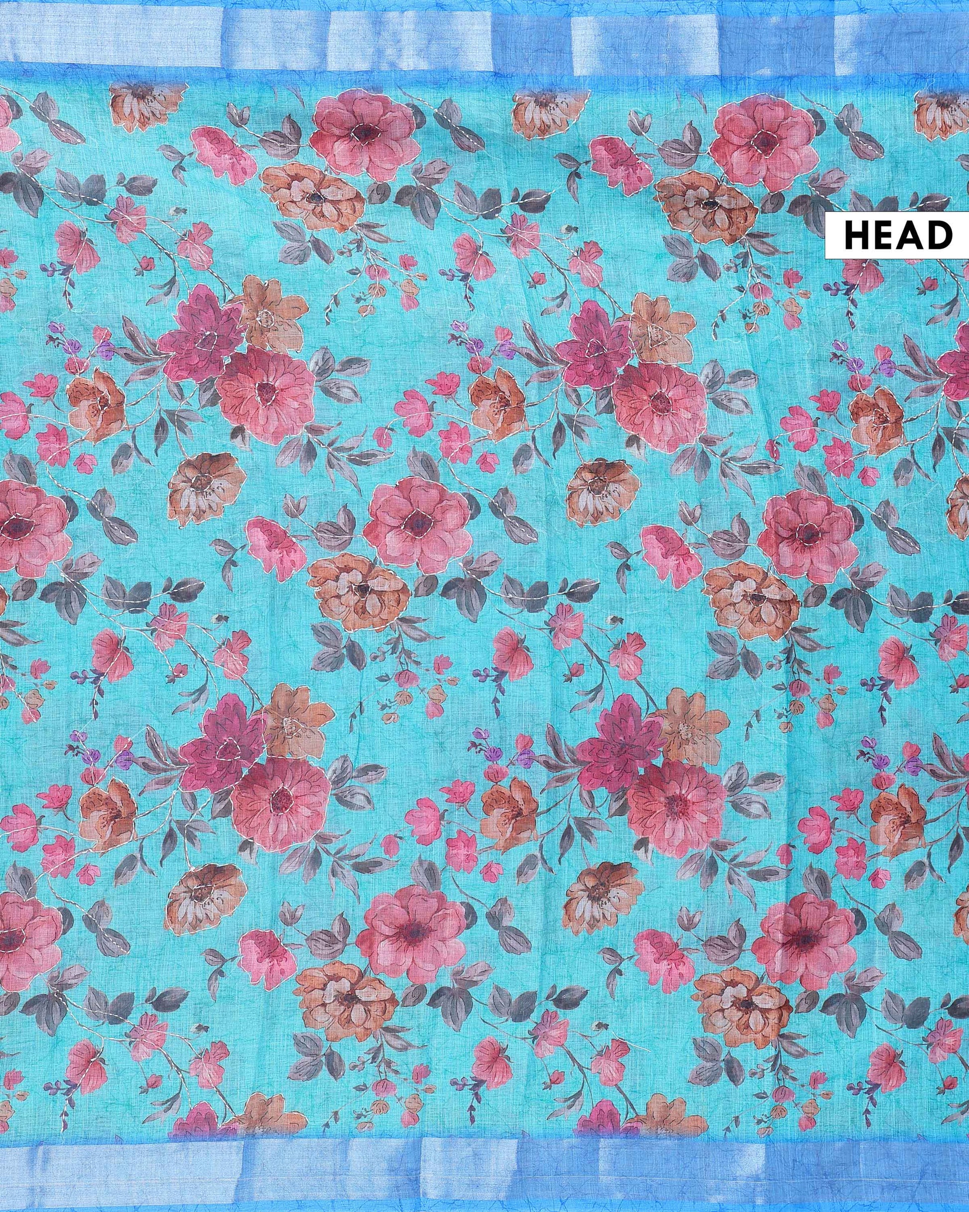 - This elegant Blue colored saree all over floral digital prints and a contrasting border, perfect for a chic and traditional look