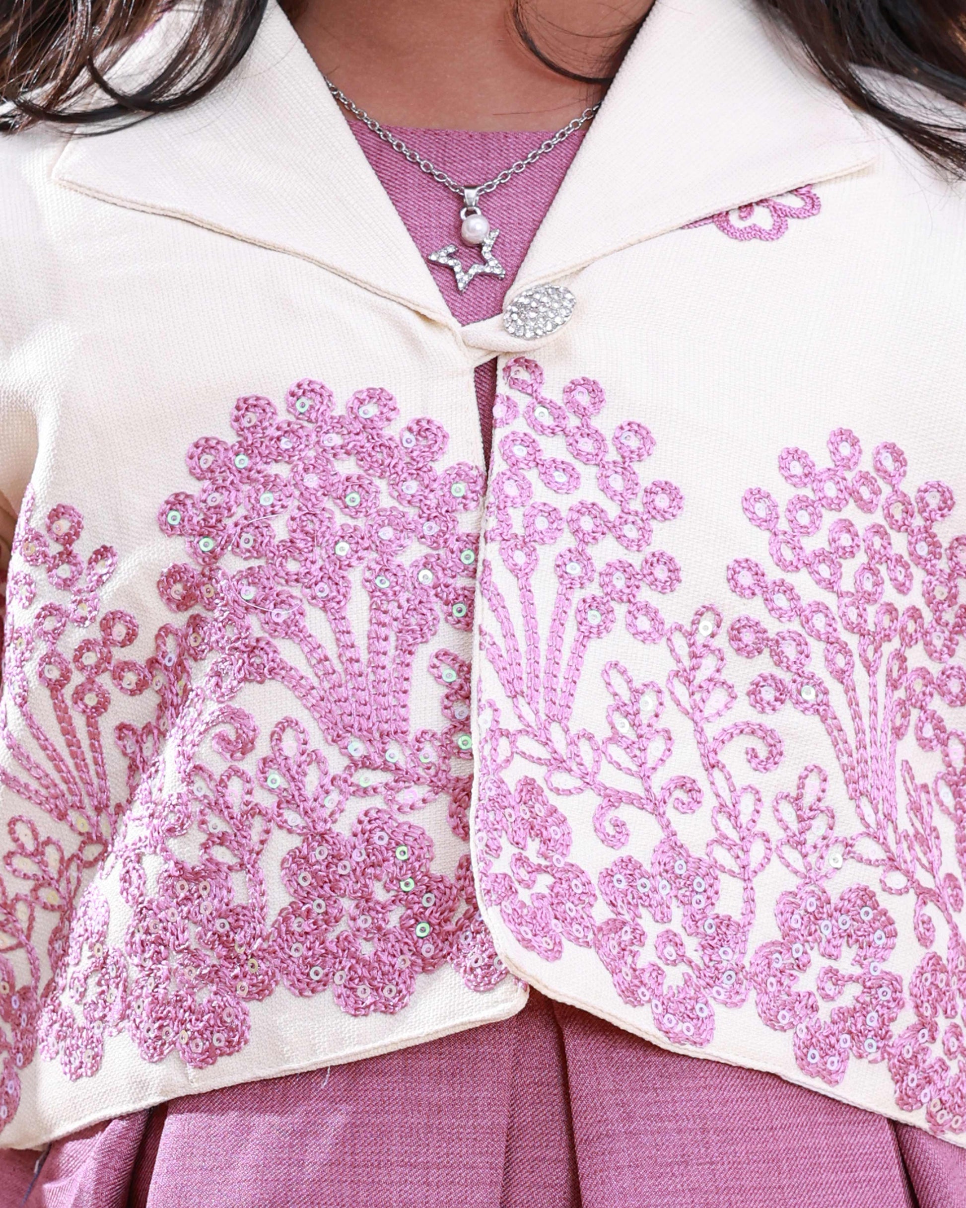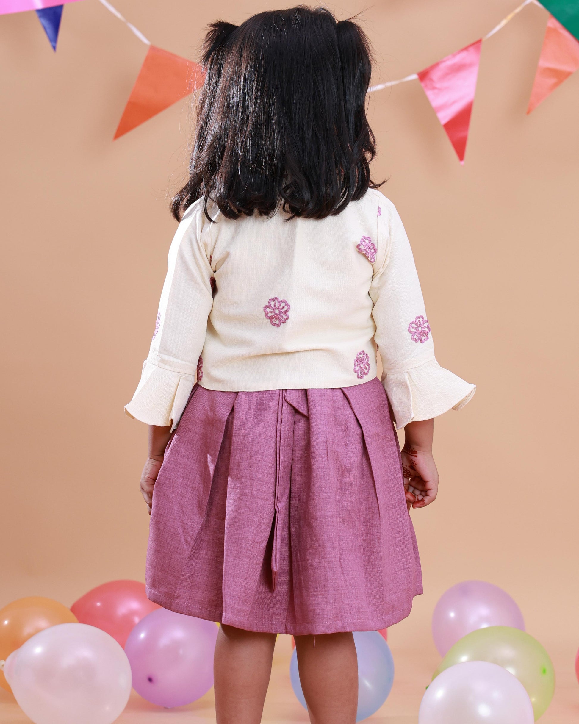 Elegant Kids' Ethnic Print Collared Frock with Pleated Skirt - Cream