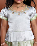 Traditional Kids Readymade Pattu Pavadai Set with Embellished Neck Blouse and Pleated Silk Skirt - Grey
