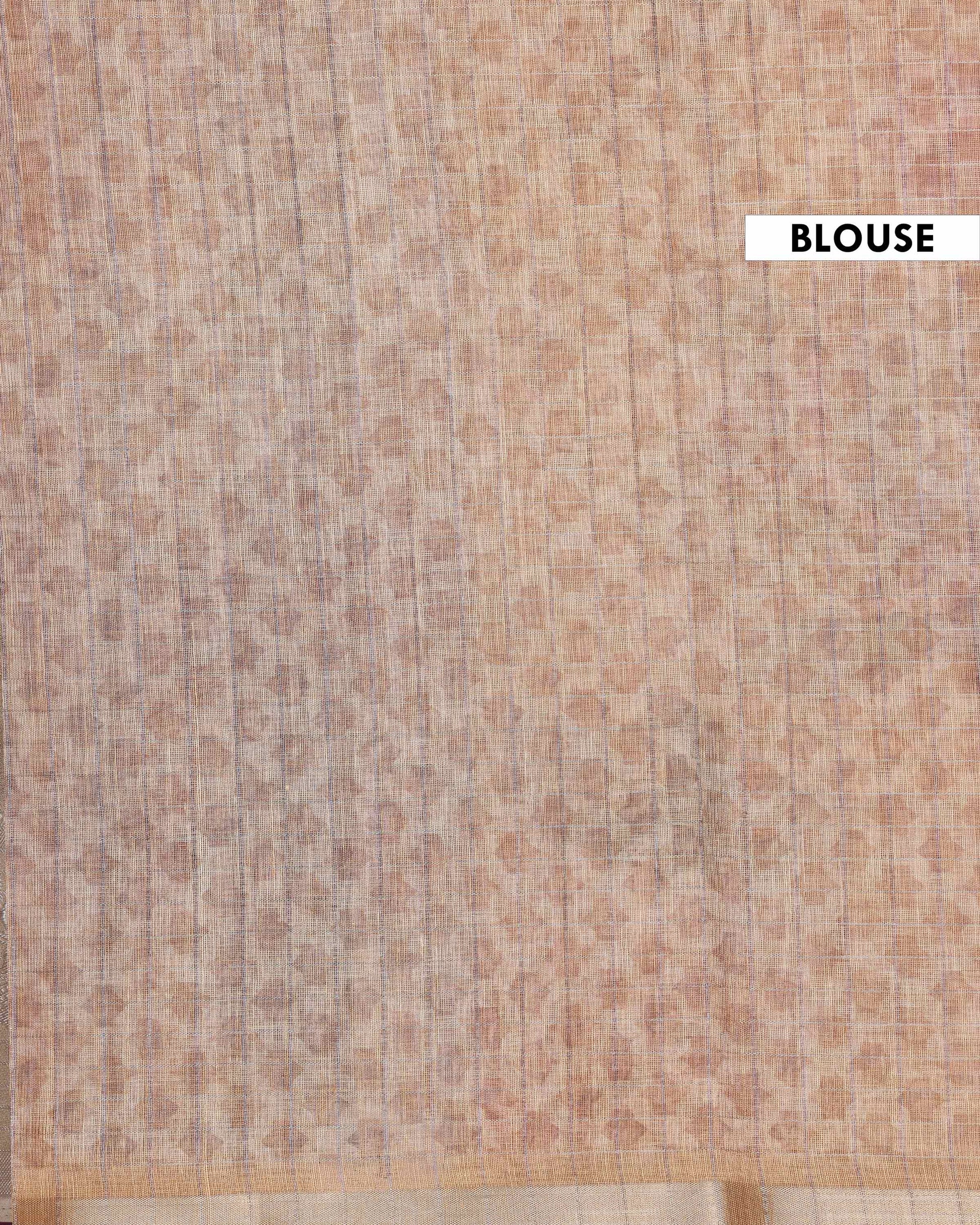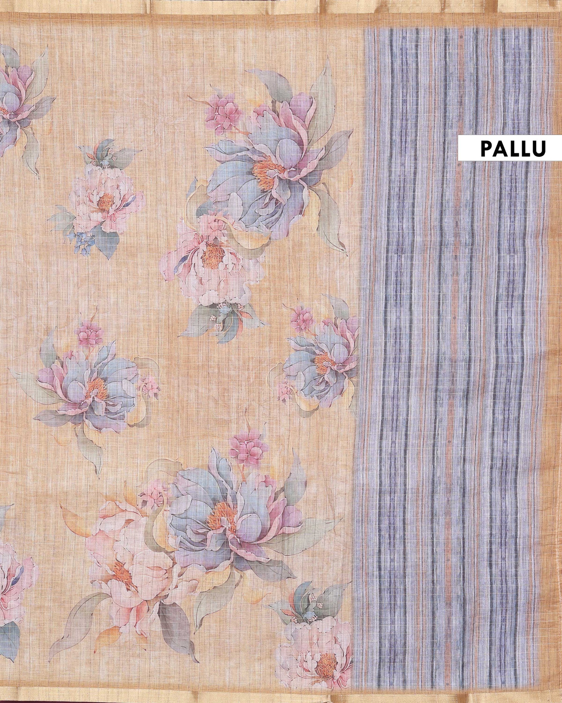 - Elegant linen blend saree crafted in a breathable textured weave, adorned with soft floral prints and finished with a subtle zari border for a refined touch.
