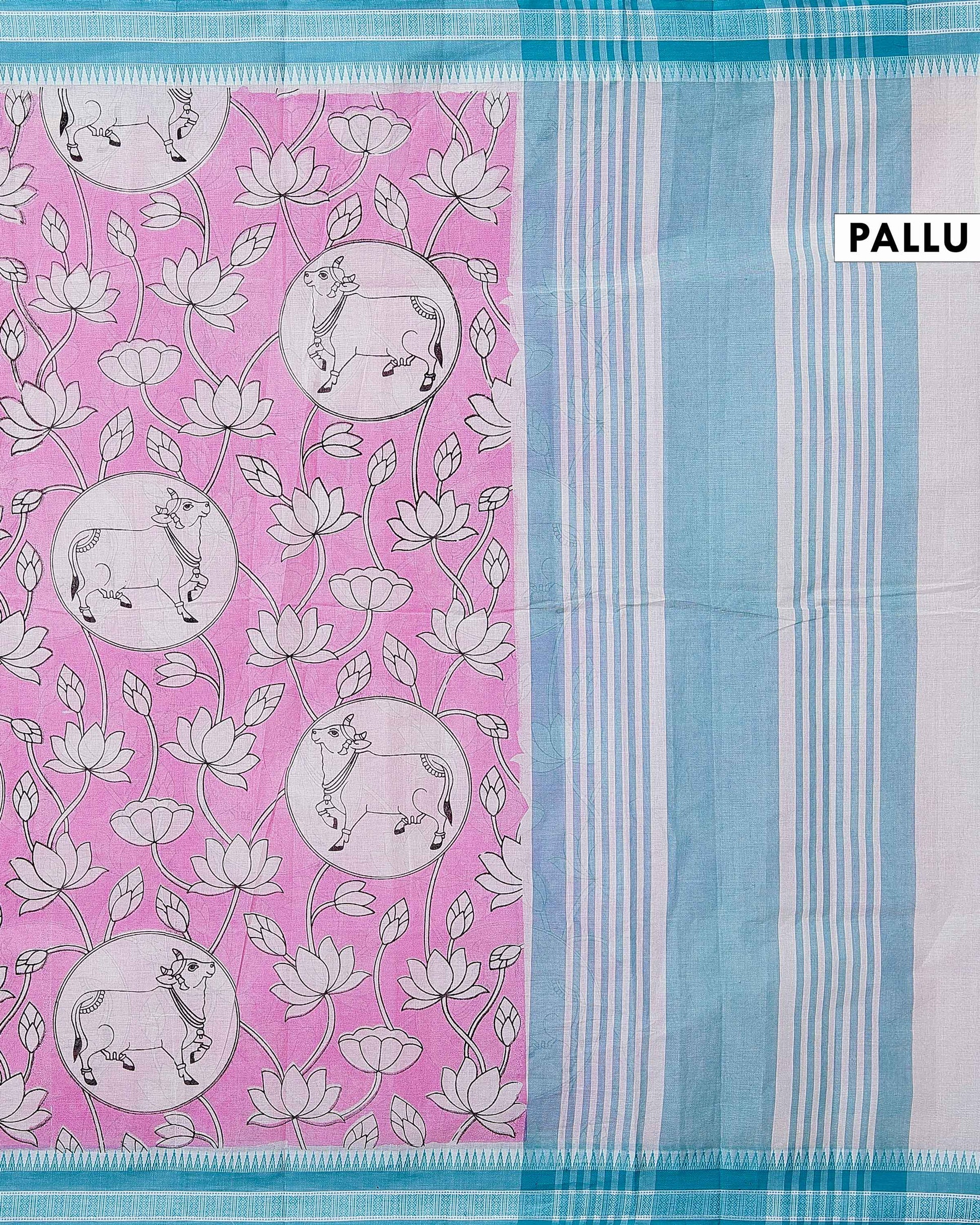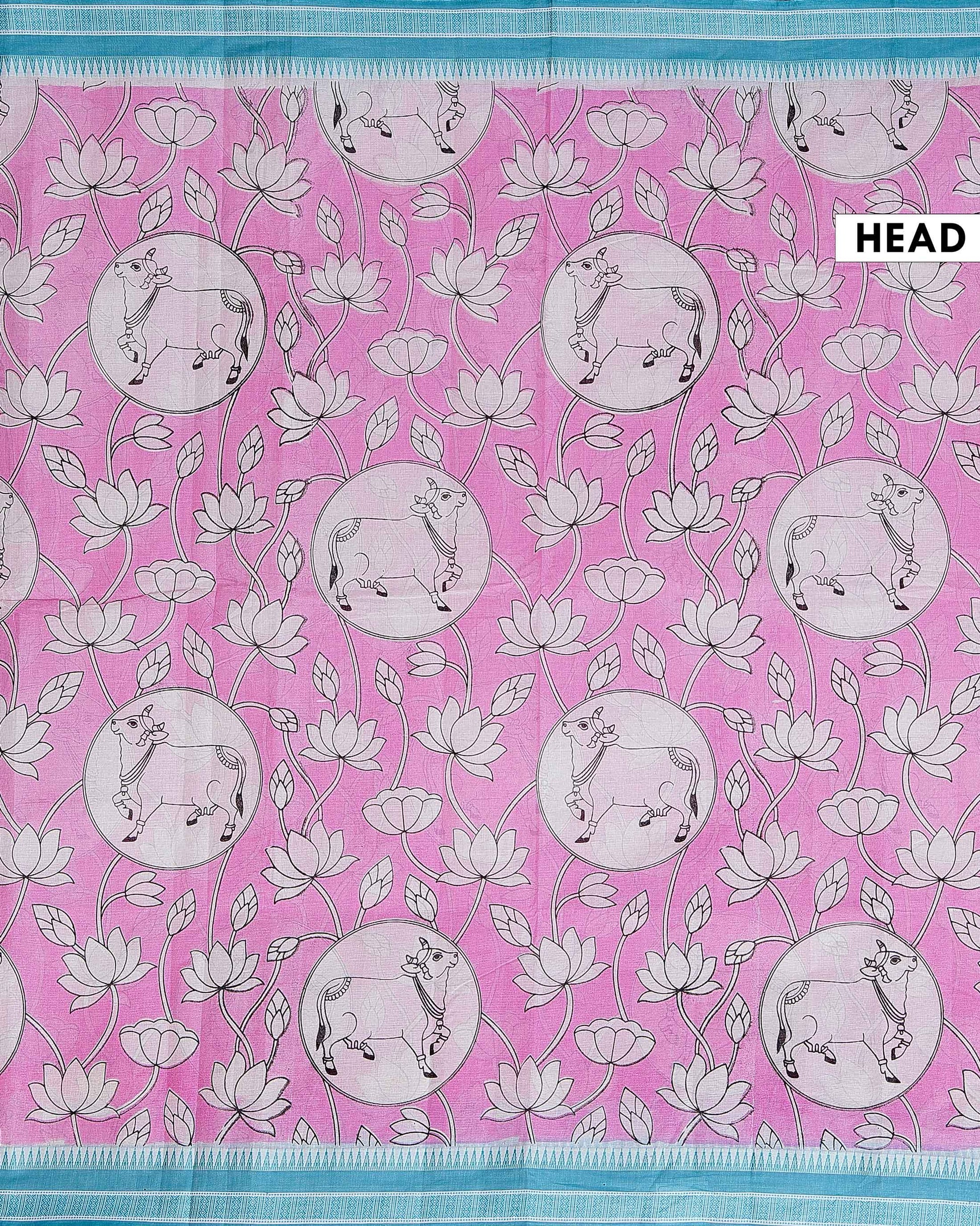 - Elegant Pink Semi Chanderi Saree traditional Kalamkari style lotus and cow motifs.