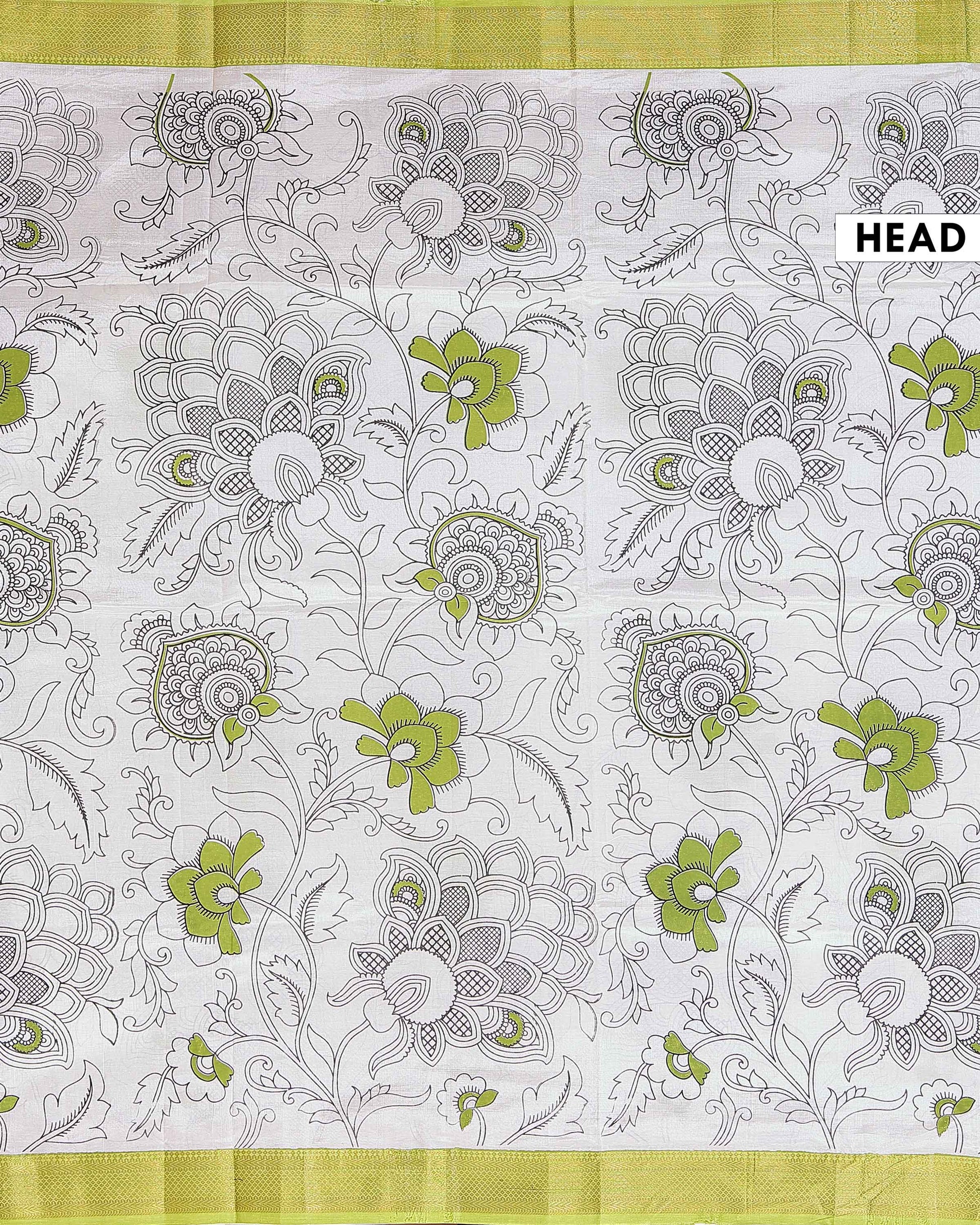 Traditional Mangalagiri Semi Chanderi Saree with Kalamkari Inspired Floral Motifs and a Contrast Zari Border - White