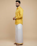 Elevate your traditional style with this men's Yellow Color shirt and White Color dhoti set, crafted from comfortable cotton