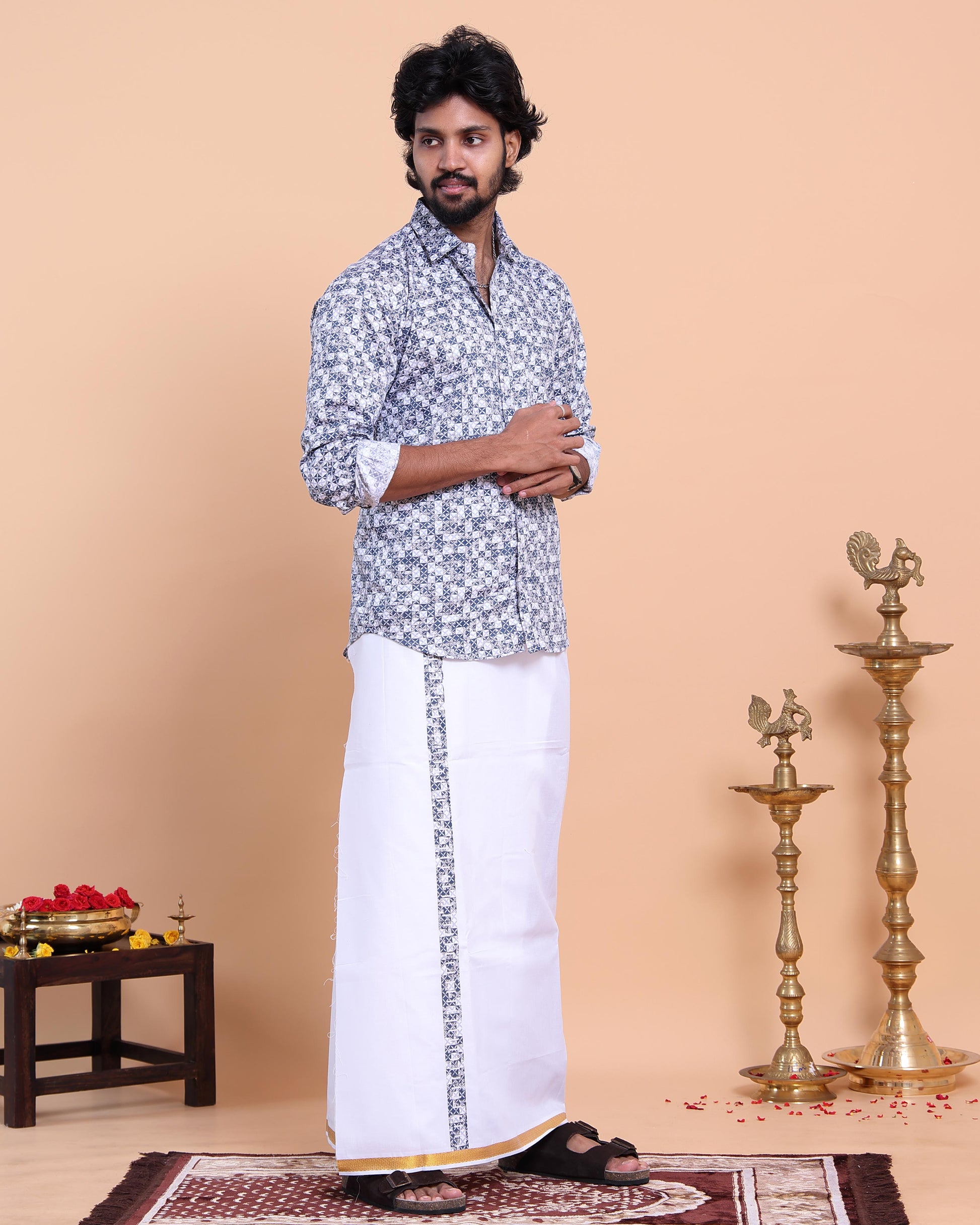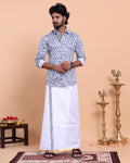 - Elevate your ethnic wardrobe with this elegant Blue printed shirt and traditional white dhoti set.