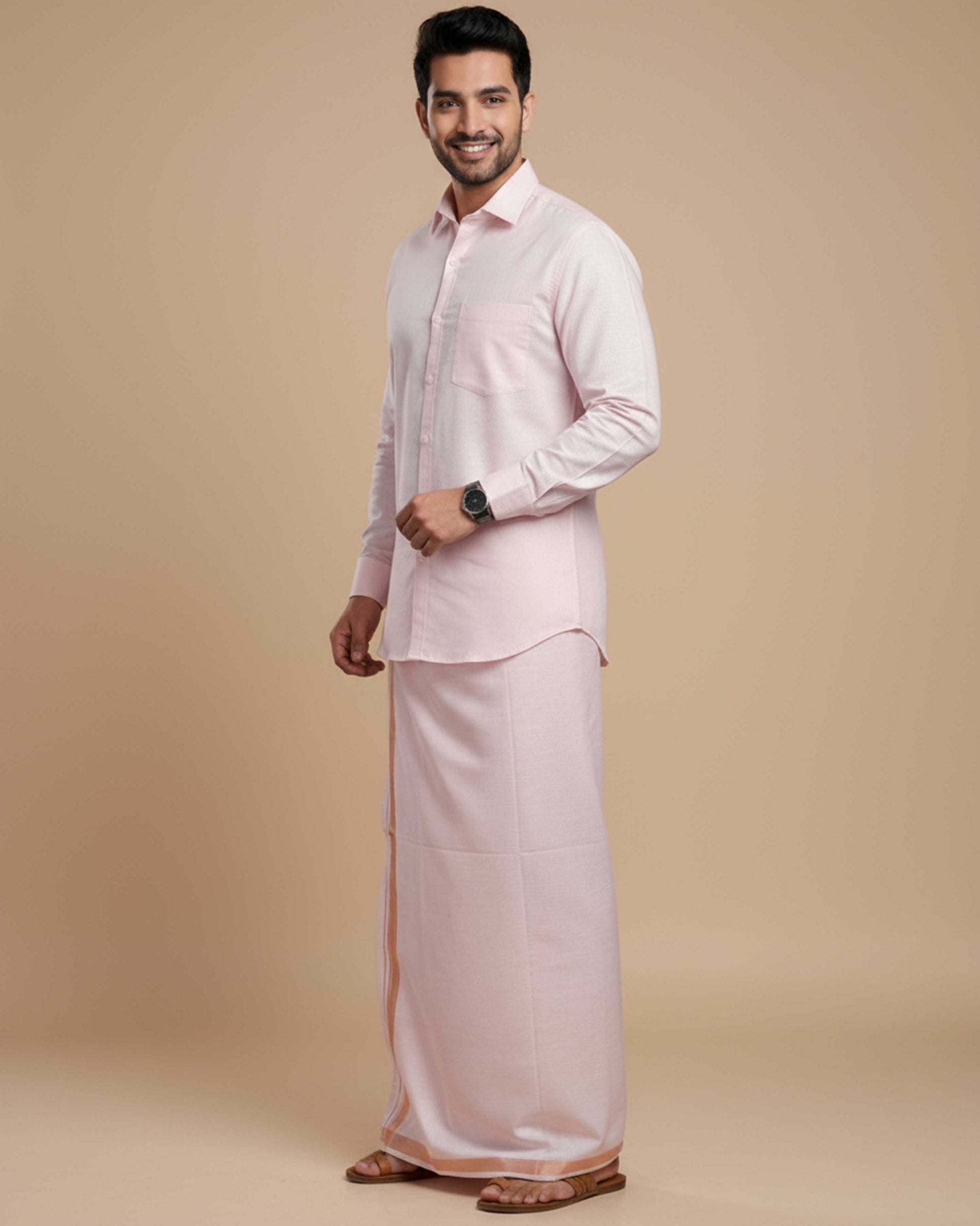 Elevate your traditional style with this men's Light Pink shirt and Light Pink dhoti set, crafted from comfortable cotton