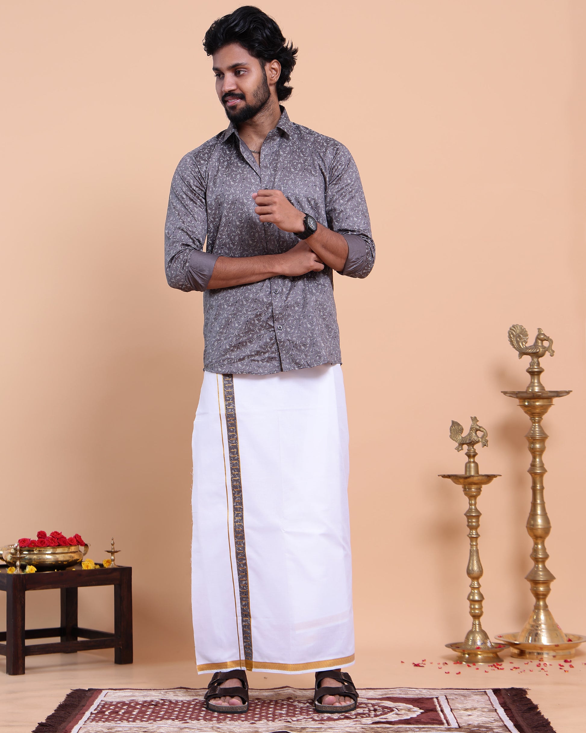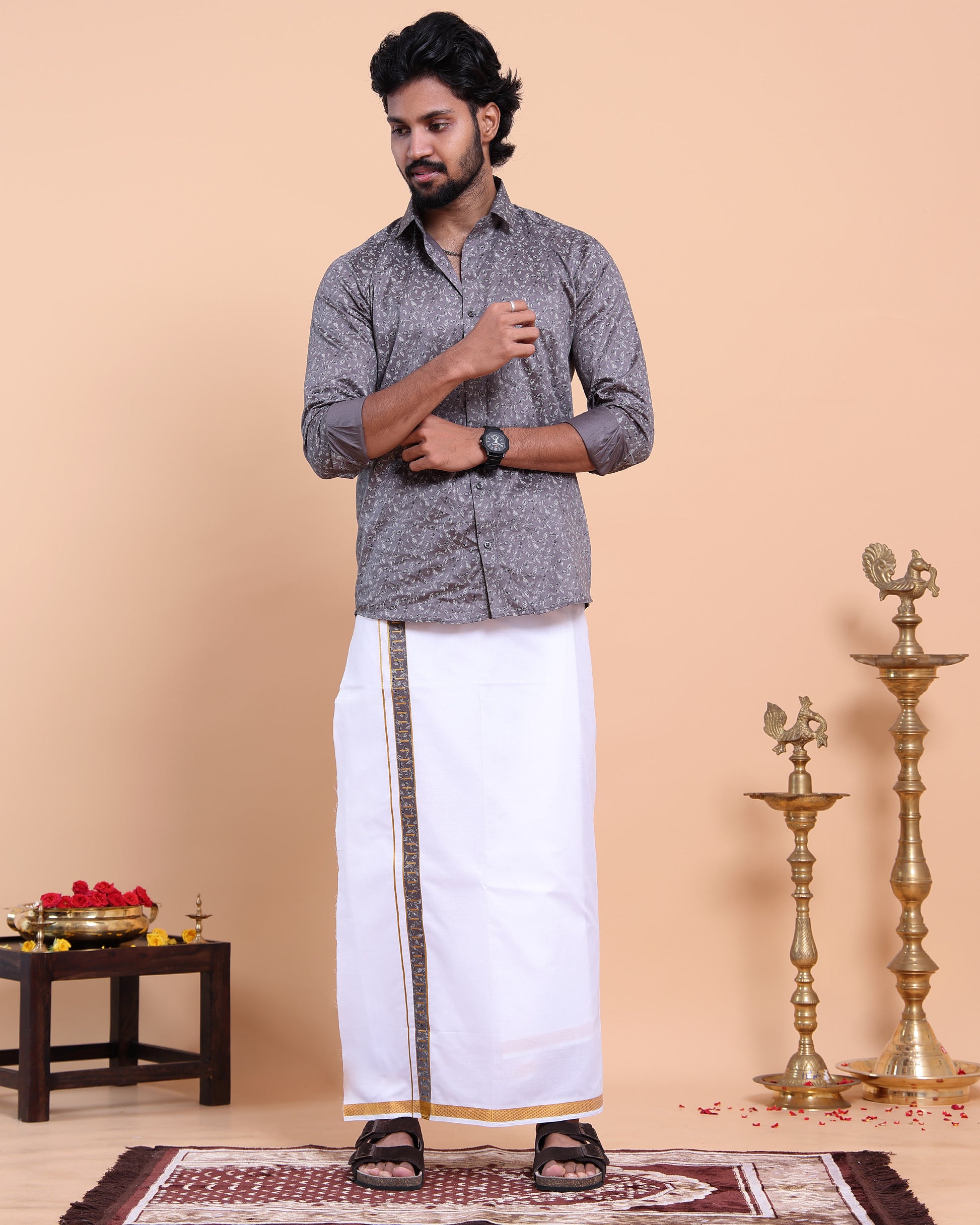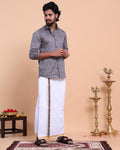 - Elevate your ethnic wardrobe with this elegant grey printed shirt and traditional white dhoti set.