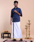 Elevate your traditional style with this men's Blue Color shirt and White Color dhoti set, crafted from comfortable cotton