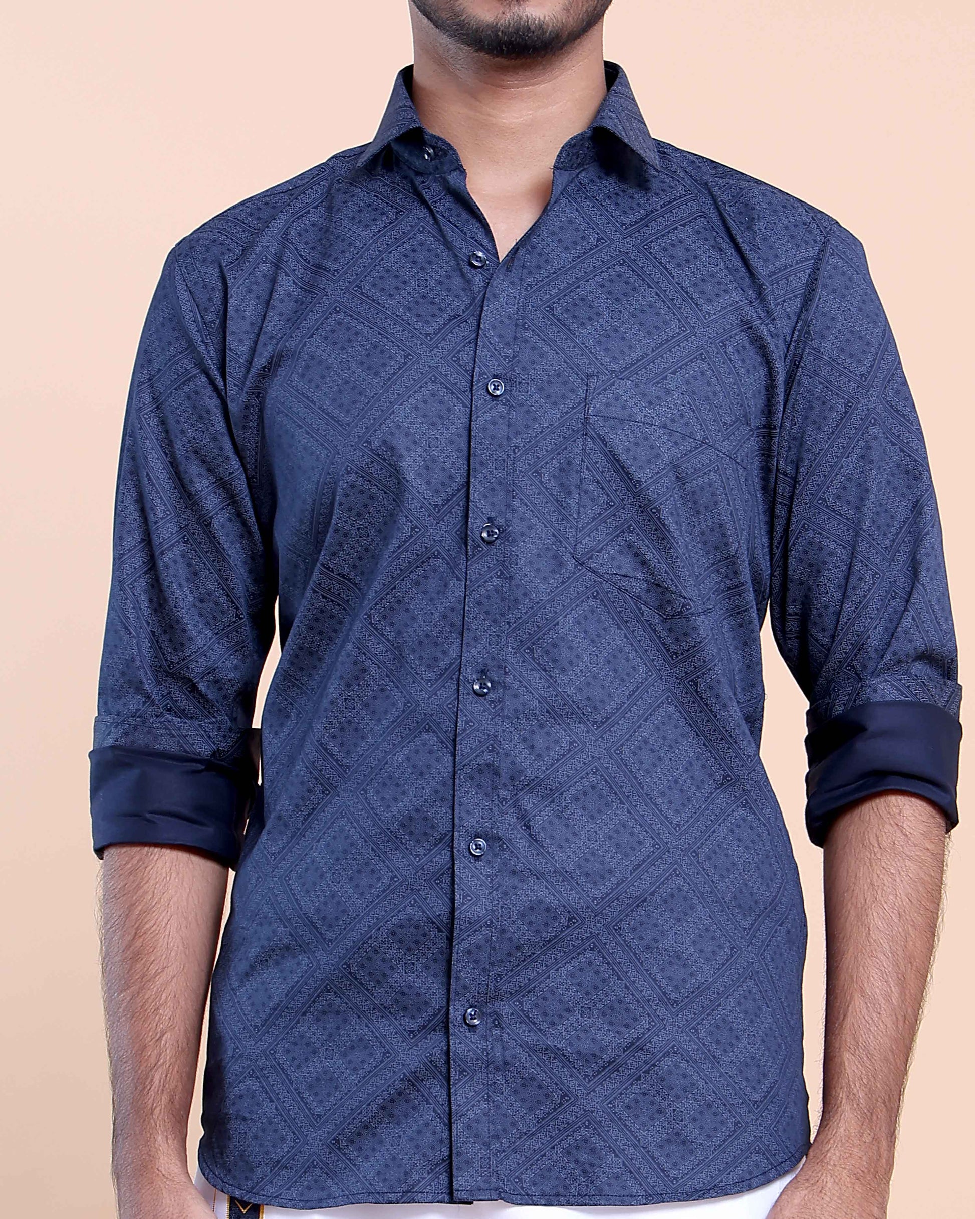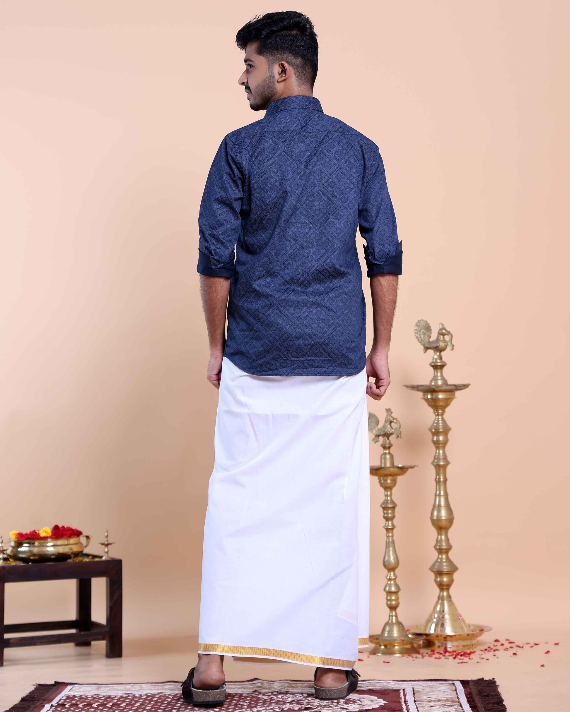 Elevate your traditional style with this men's Blue Color shirt and White Color dhoti set, crafted from comfortable cotton