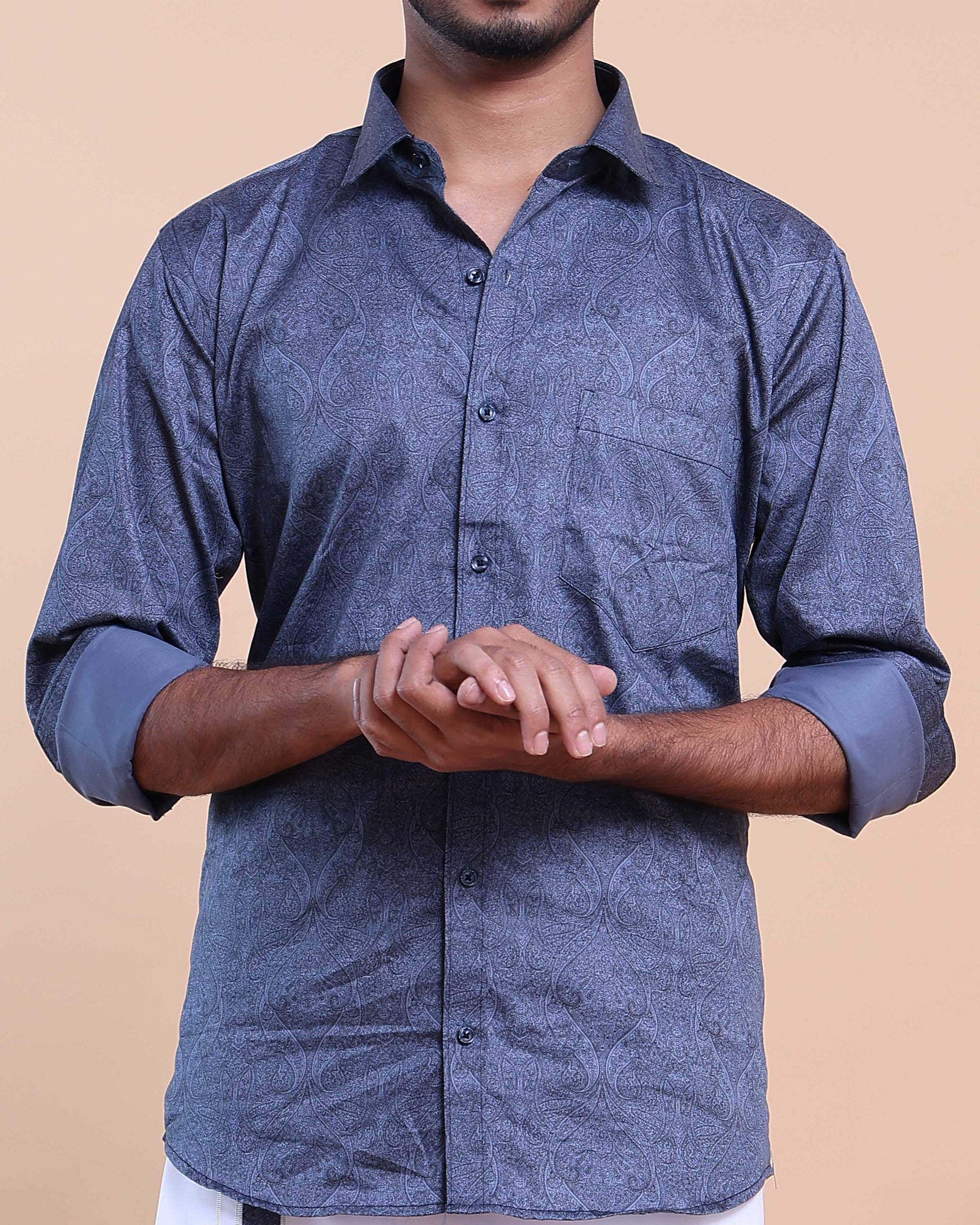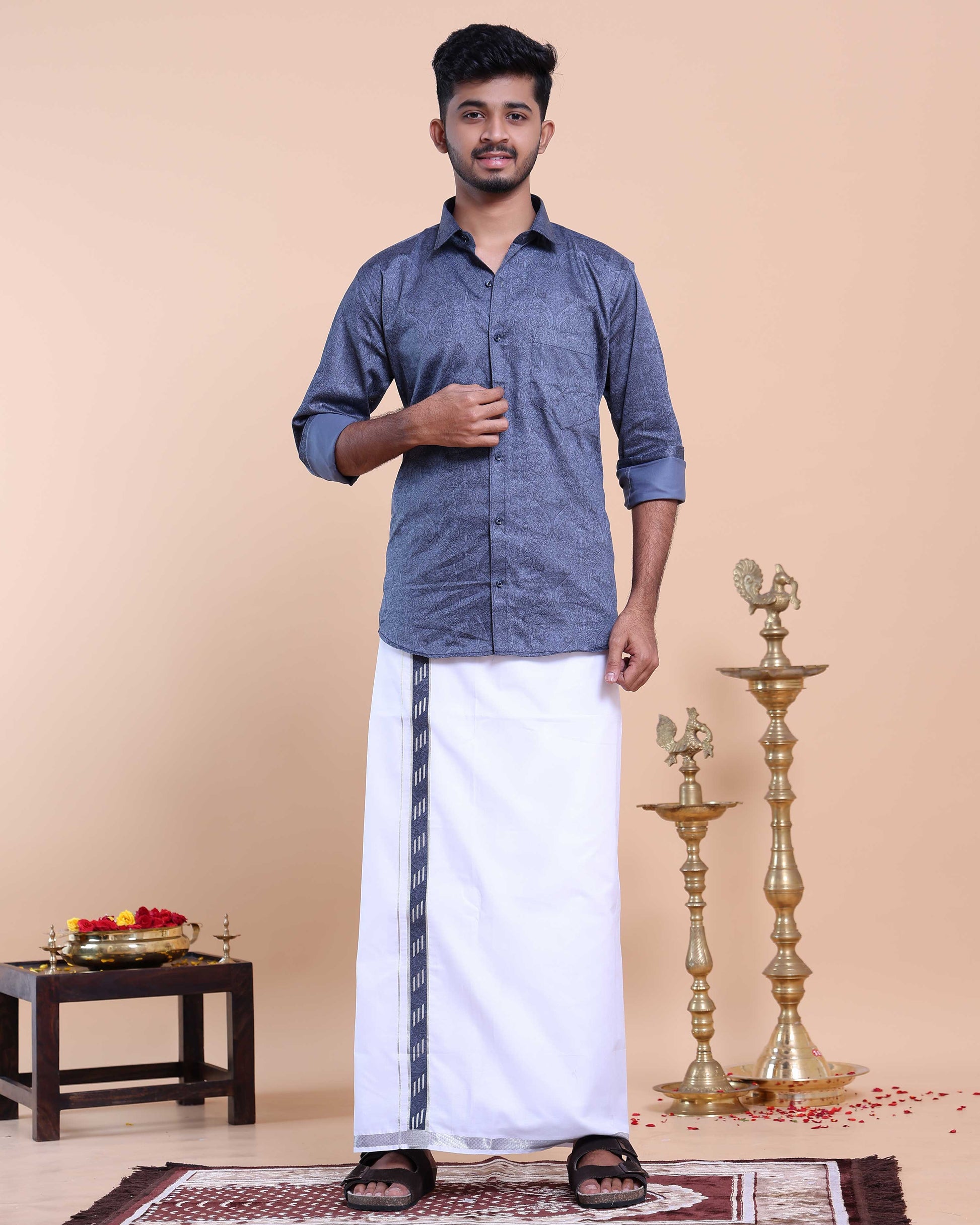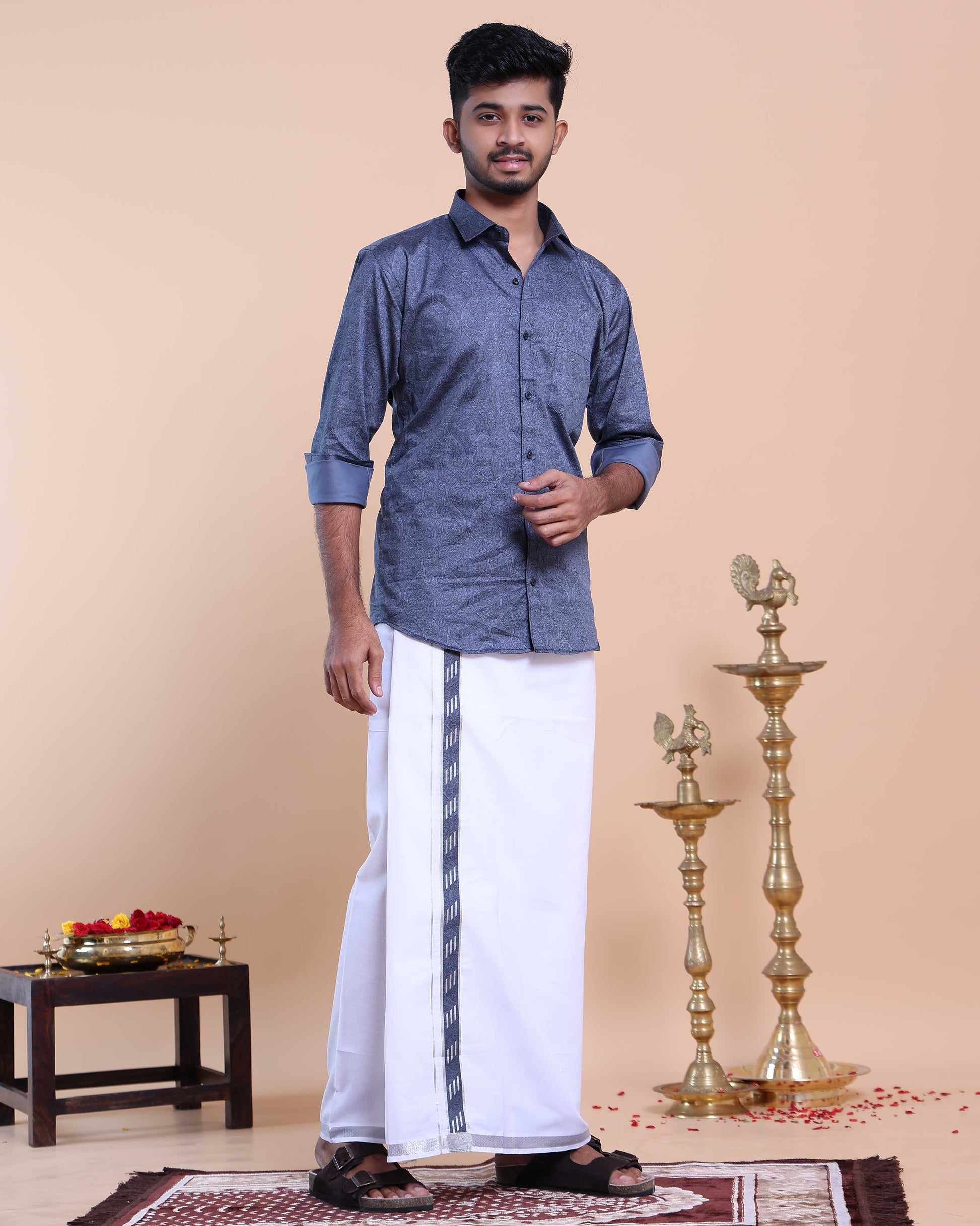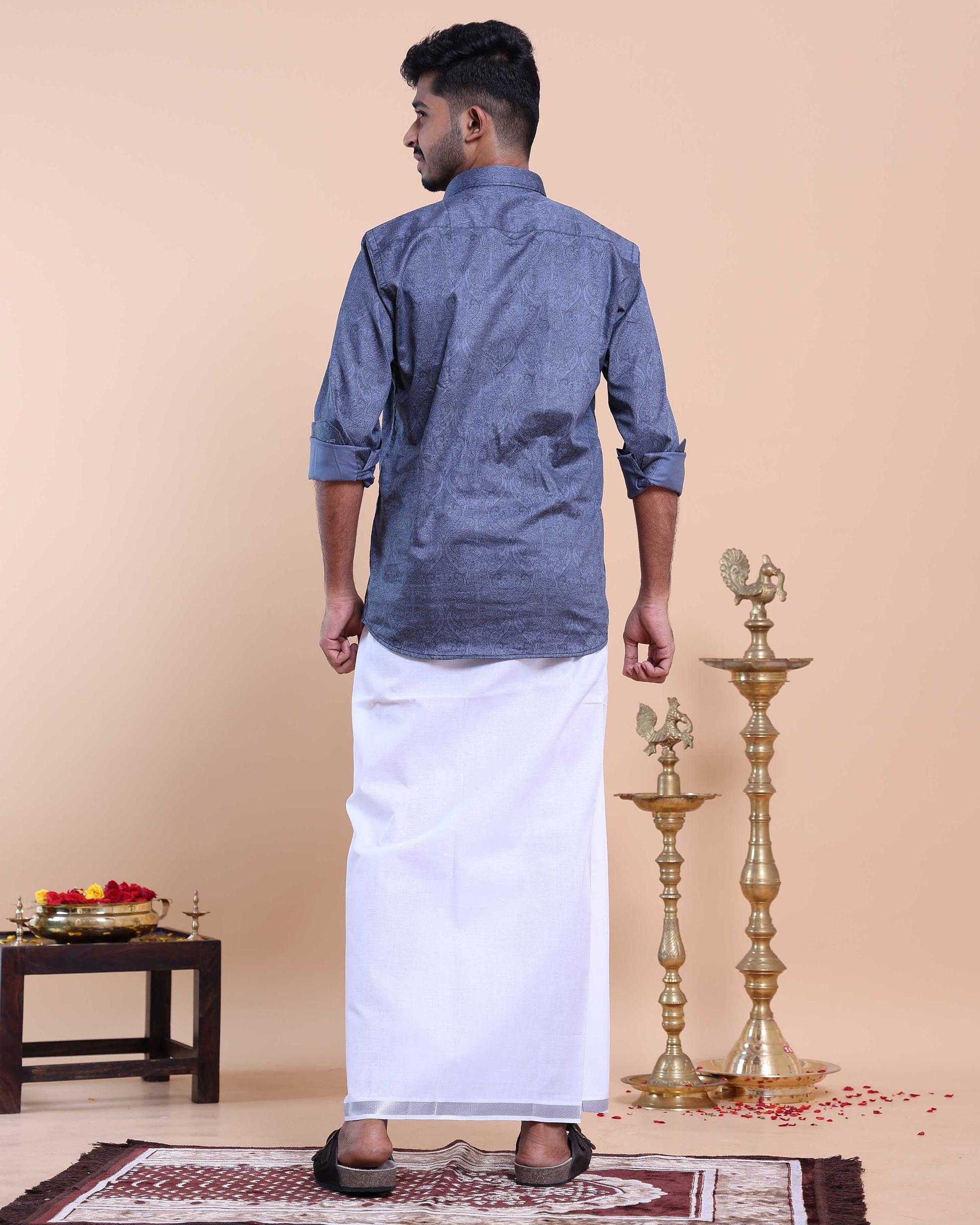 Elevate your traditional style with this men's Blue Color shirt and White Color dhoti set, crafted from comfortable cotton