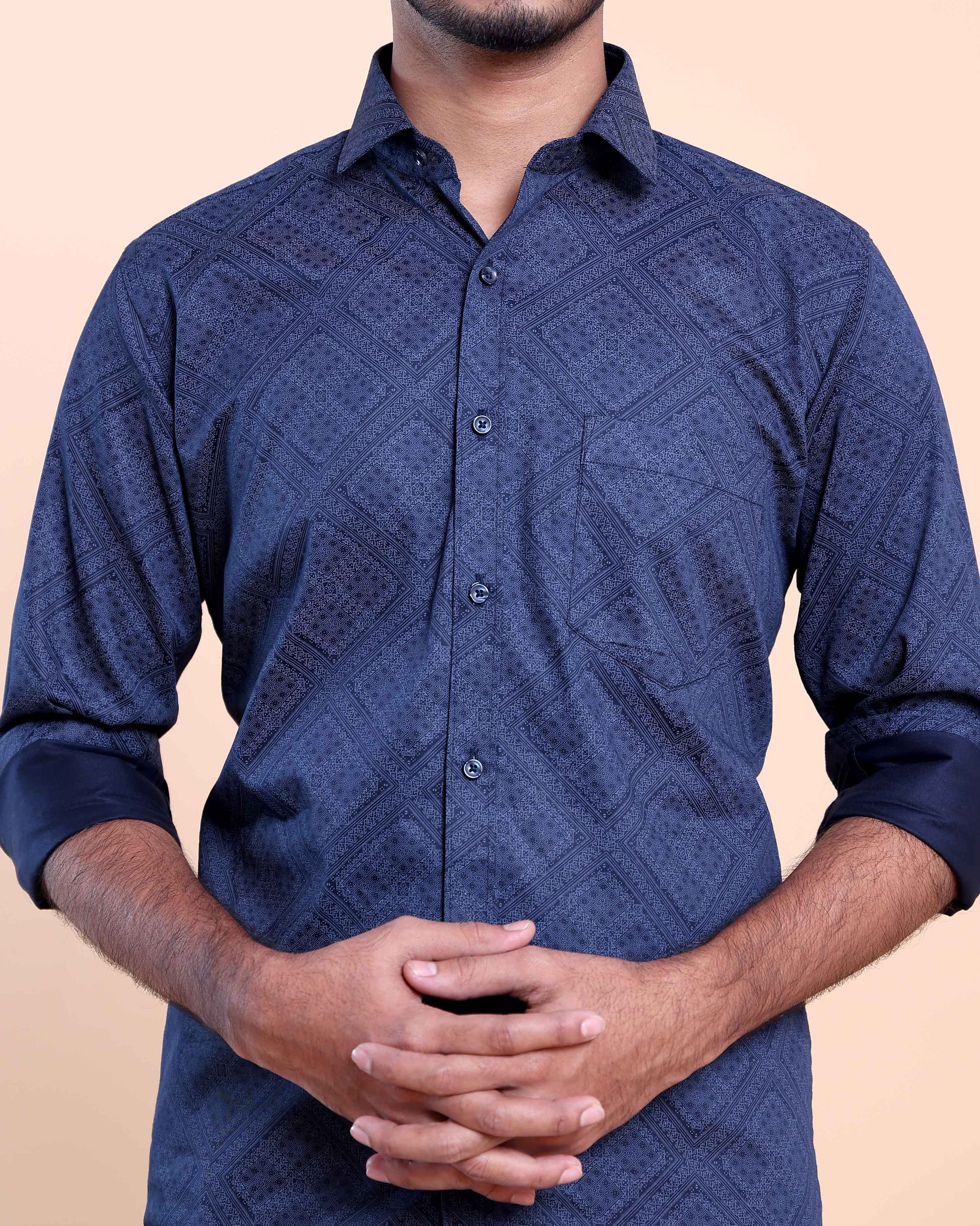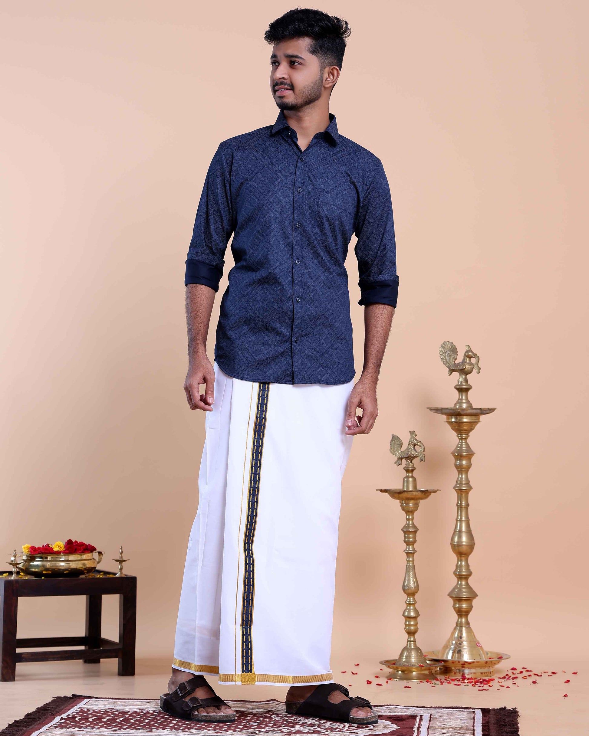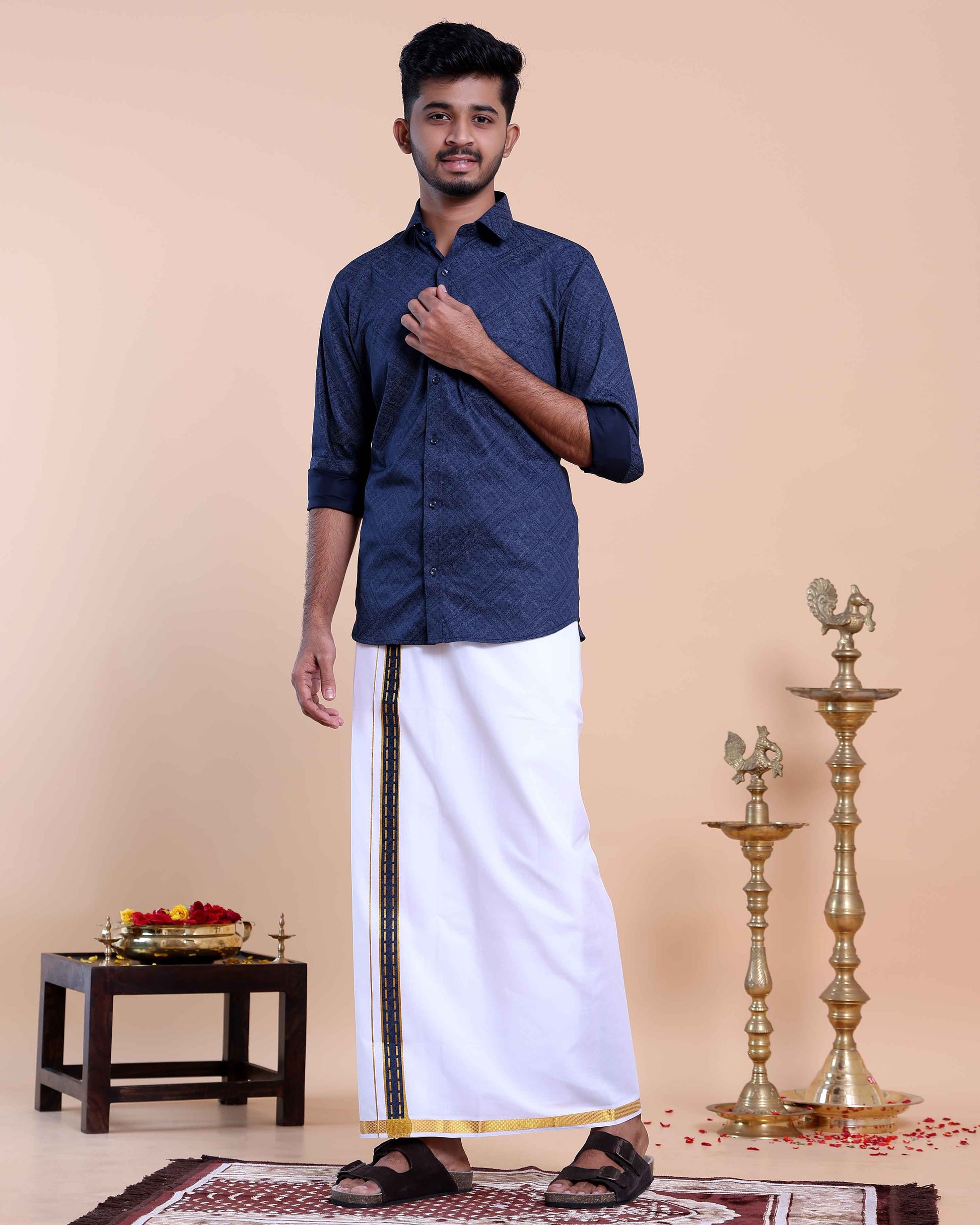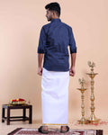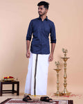 Elevate your traditional style with this men's Blue Color shirt and White Color dhoti set, crafted from comfortable cotton