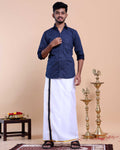 Elevate your traditional style with this men's Blue Color shirt and White Color dhoti set, crafted from comfortable cotton