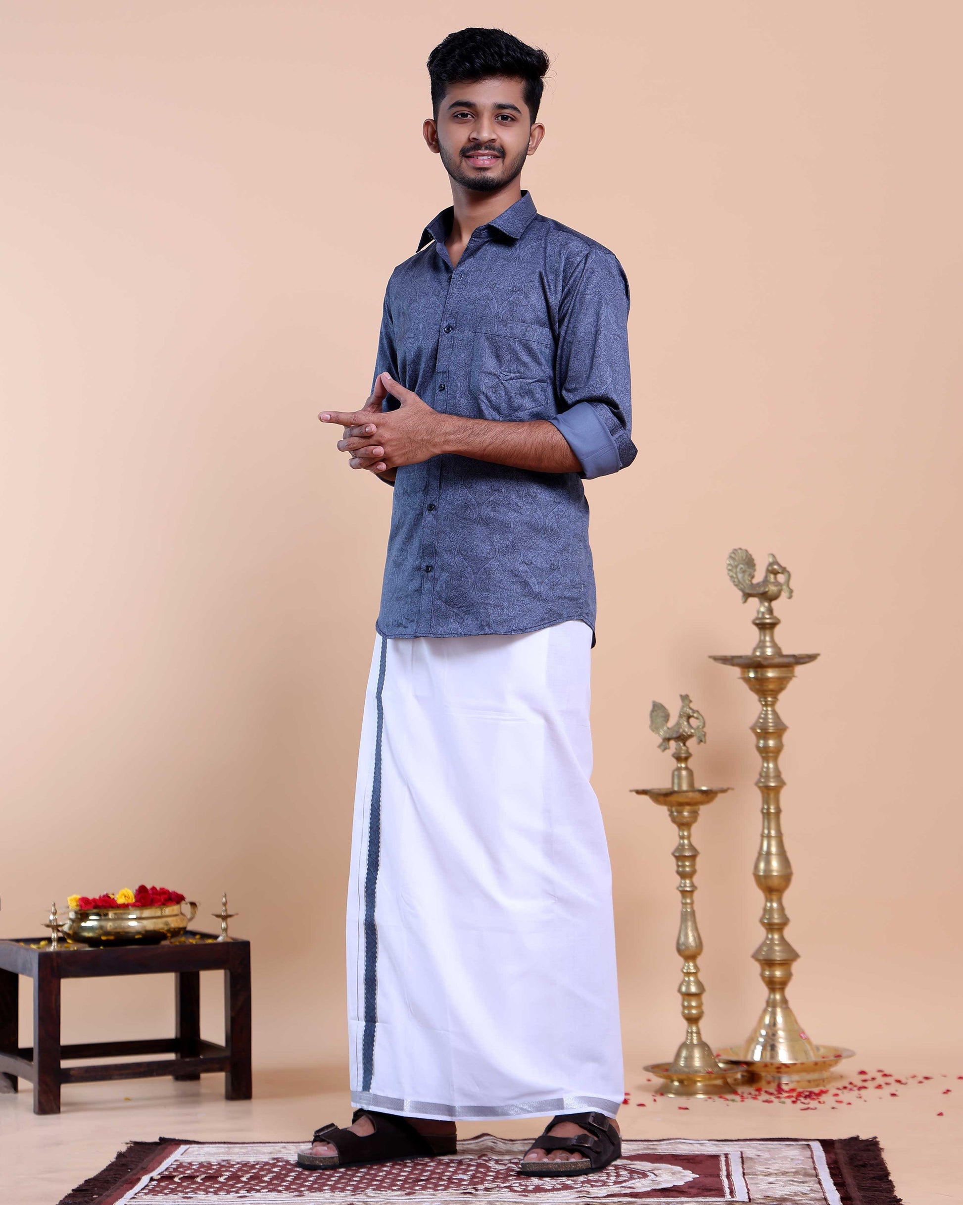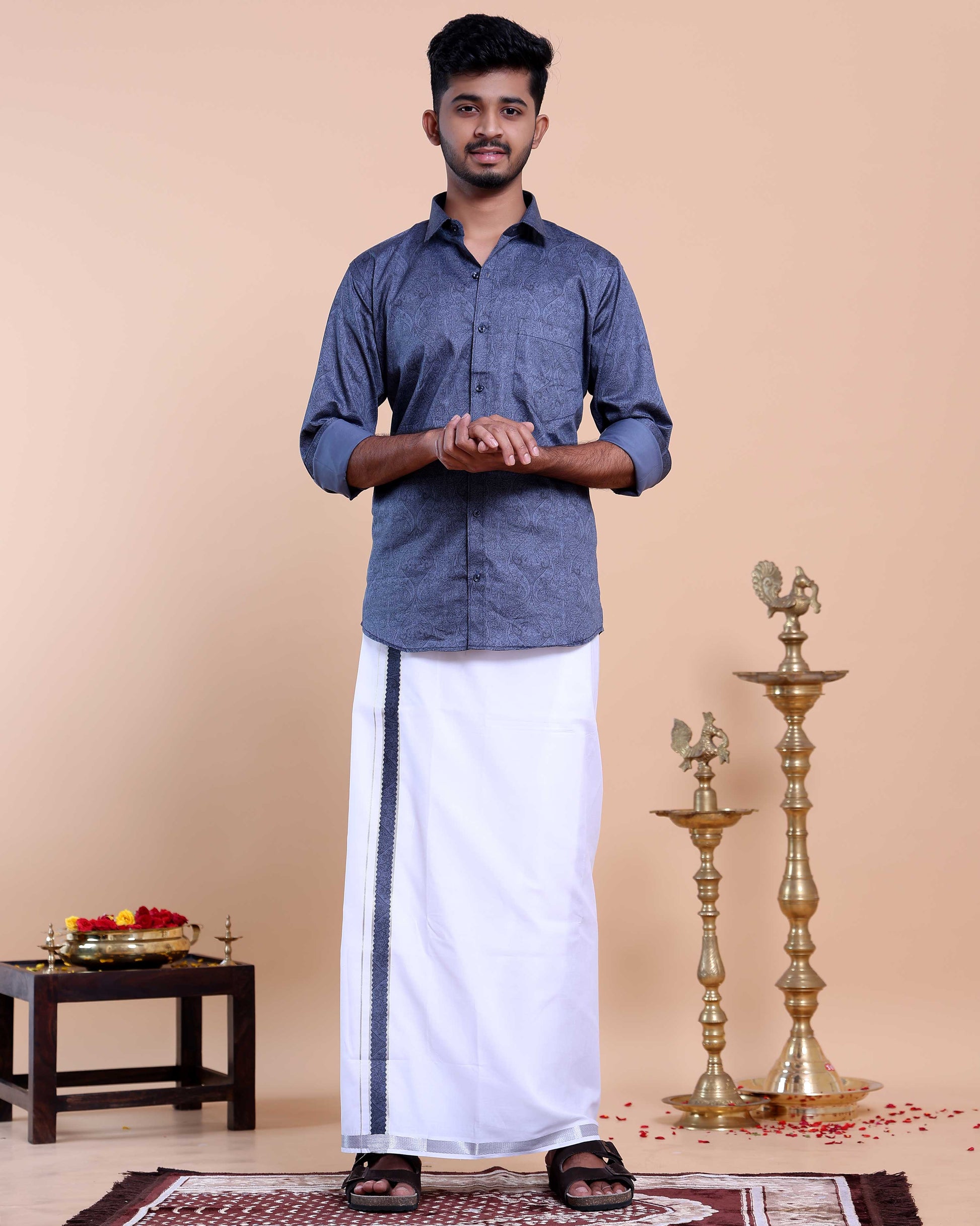 - The ensemble a full-sleeve shirt and a fancy border dhoti, perfect for festive occasions and celebrations.