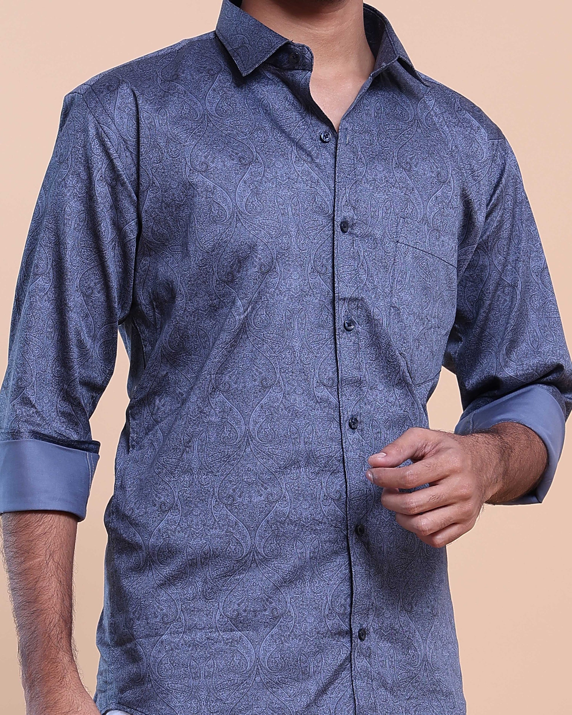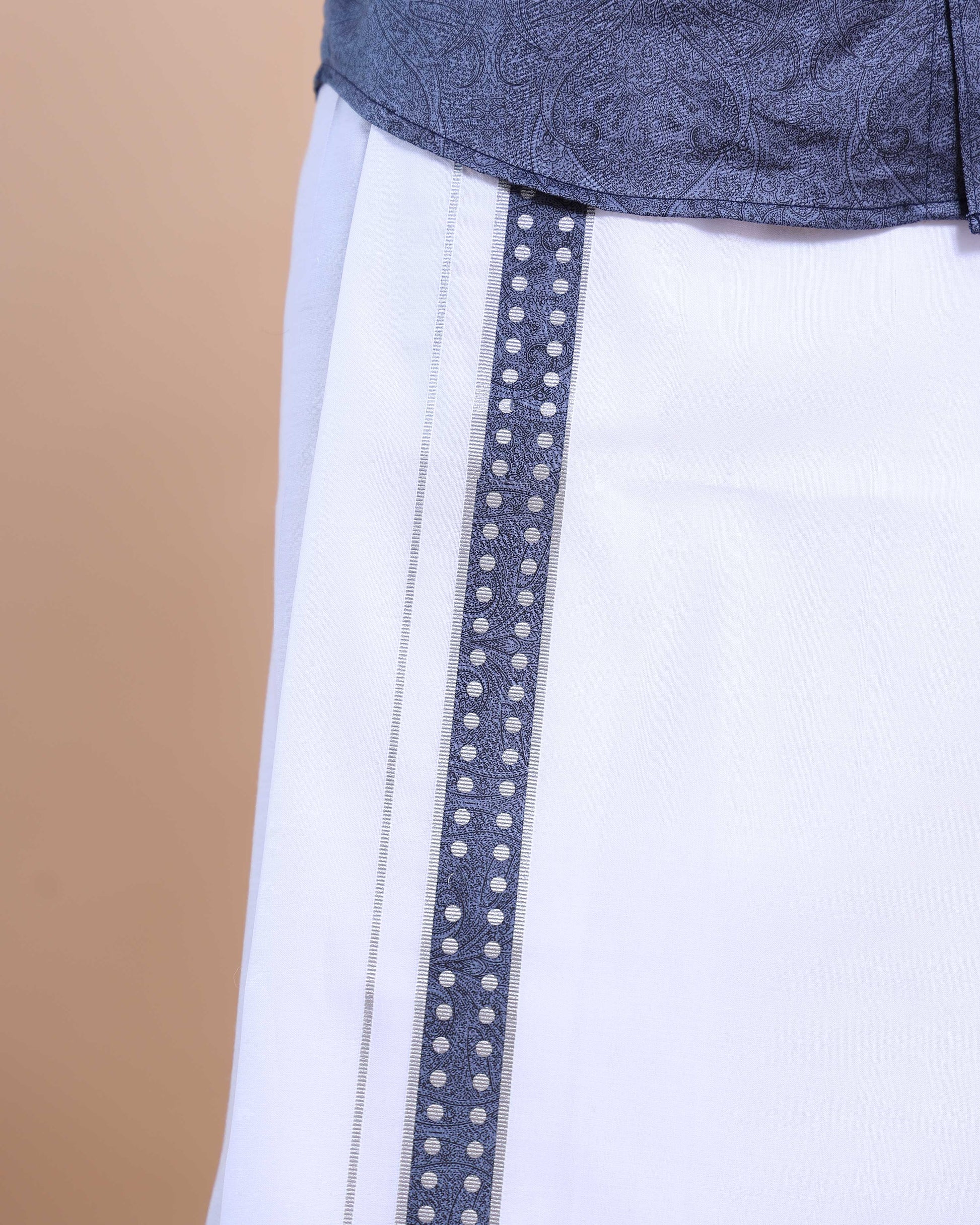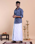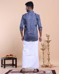 Elevate your traditional style with this men's Blue Color shirt and White Color dhoti set, crafted from comfortable cotton