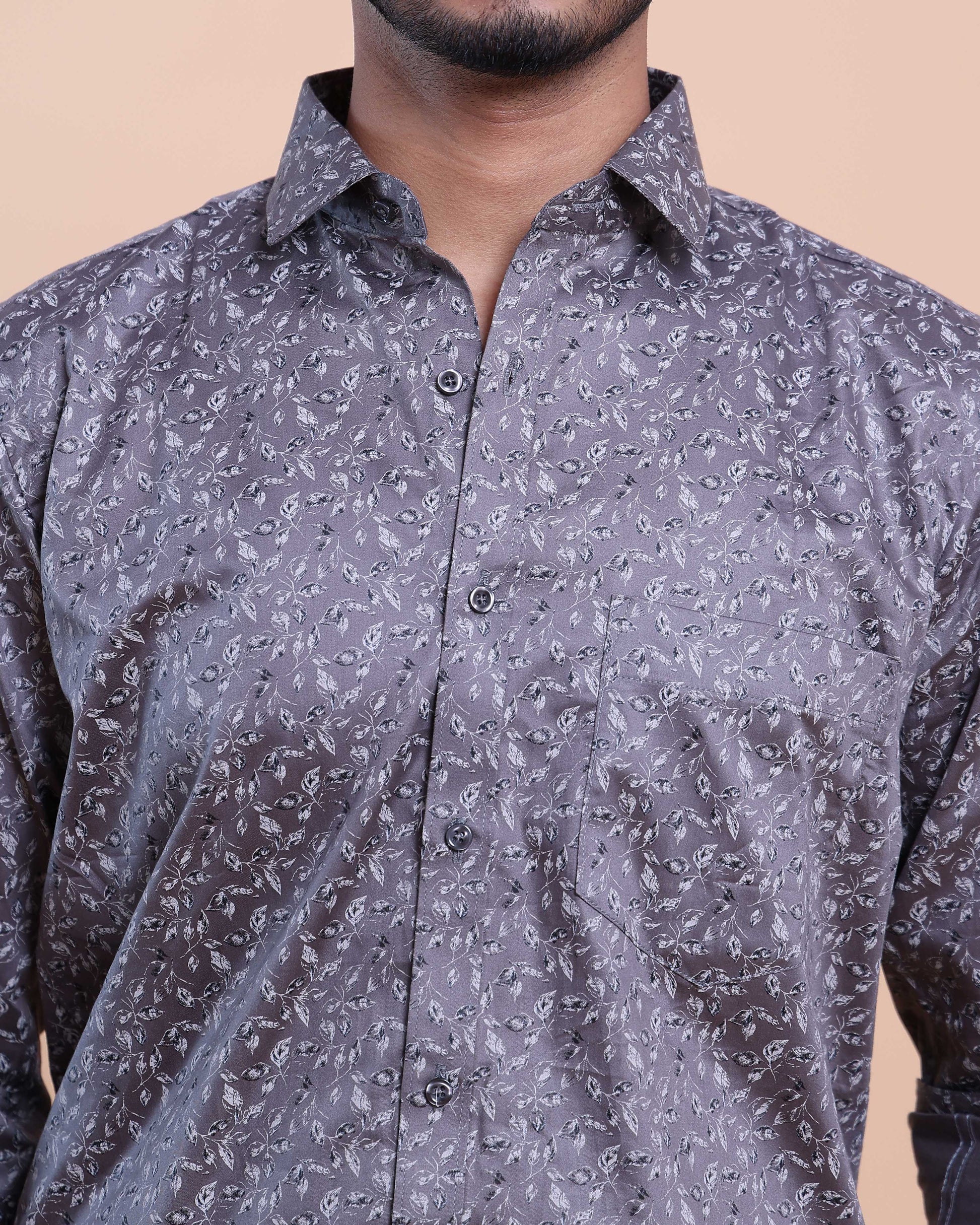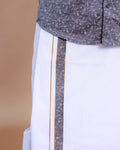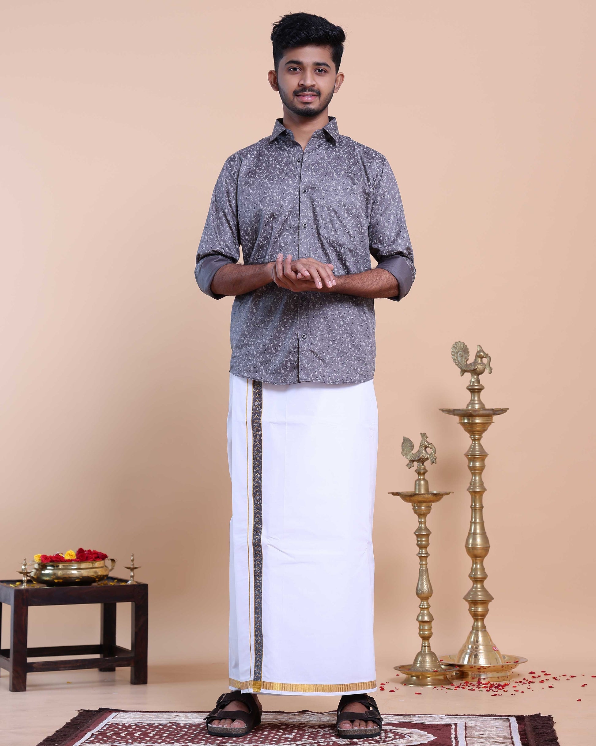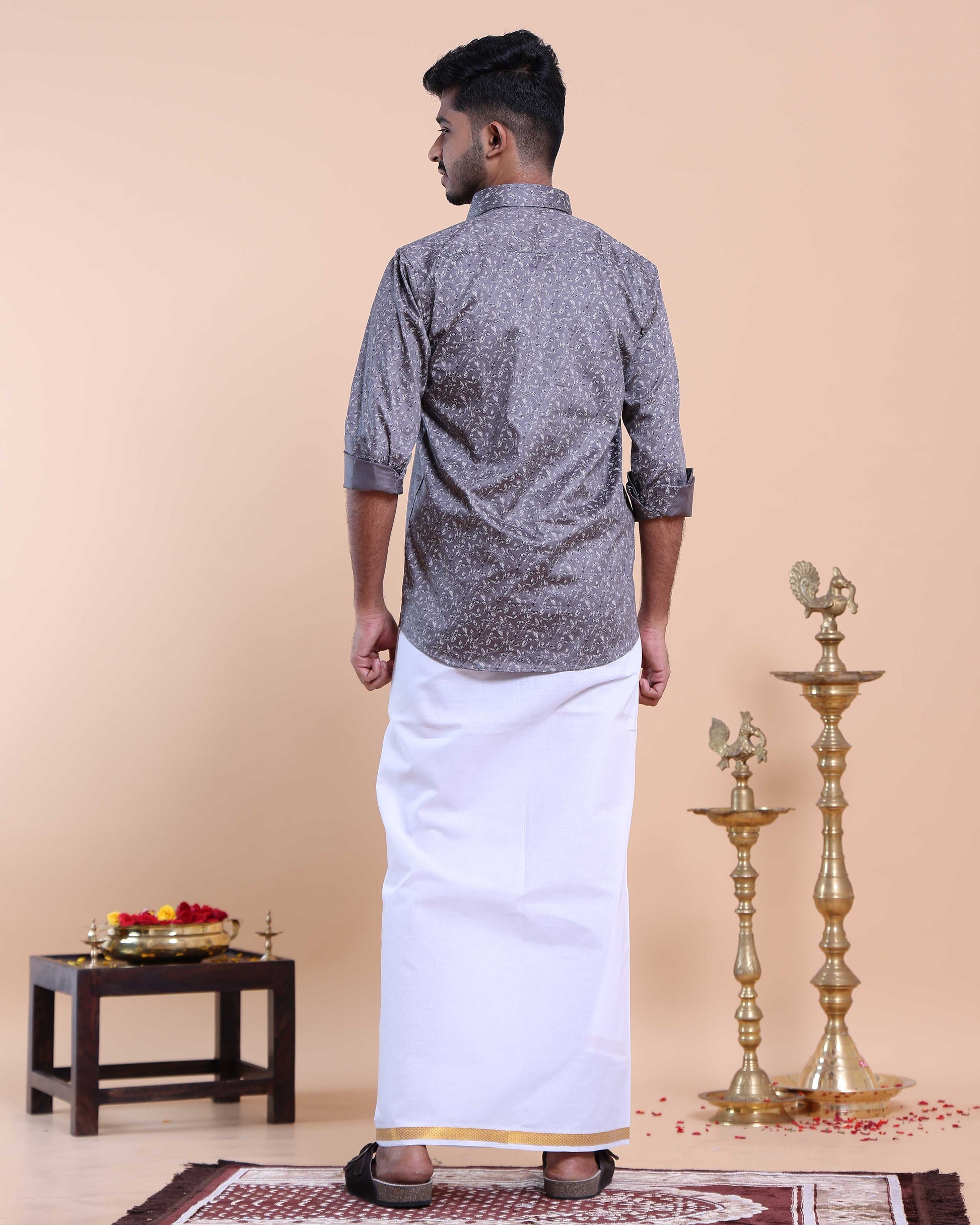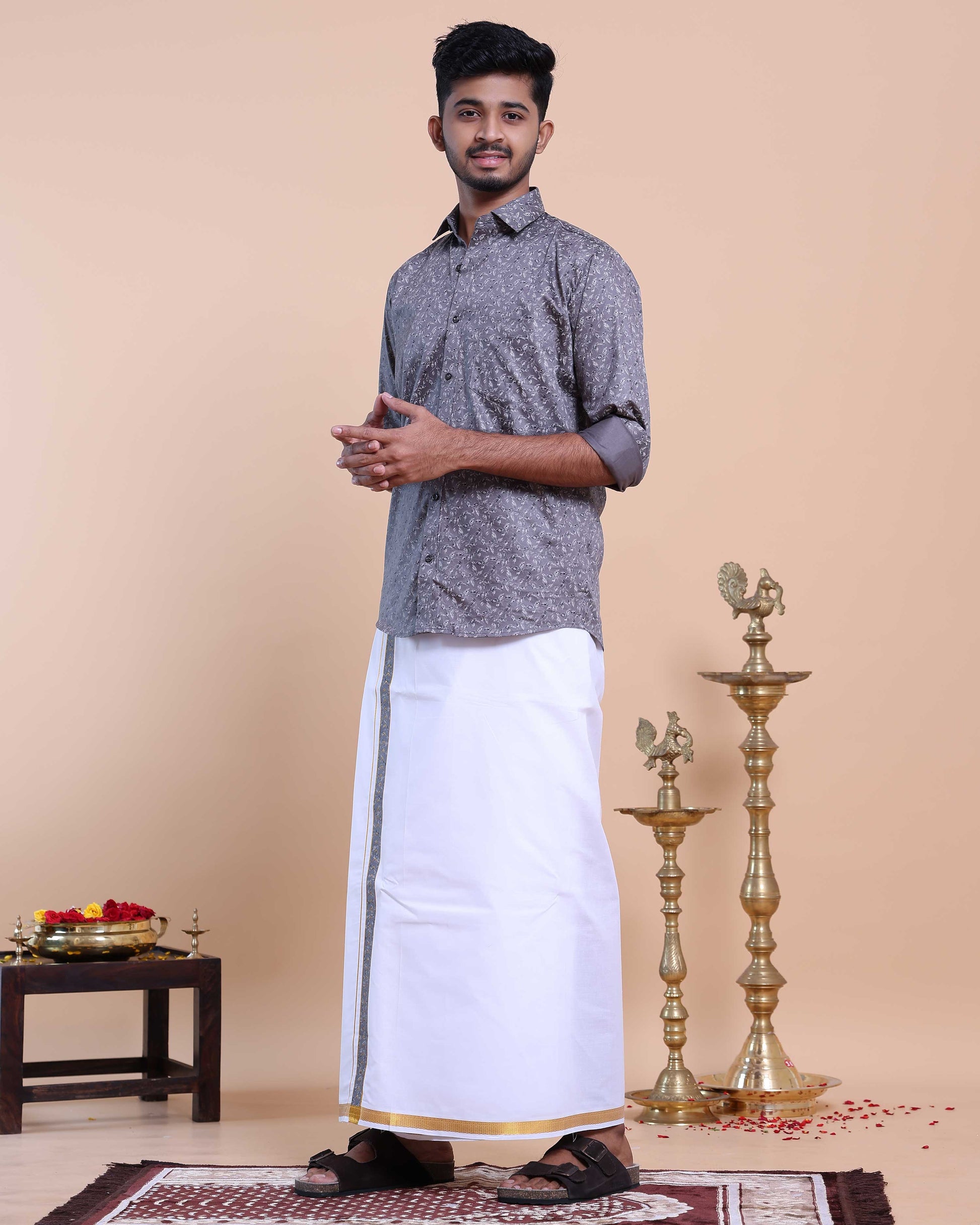 Elevate your traditional style with this men's Grey Color shirt and White Color dhoti set, crafted from comfortable cotton