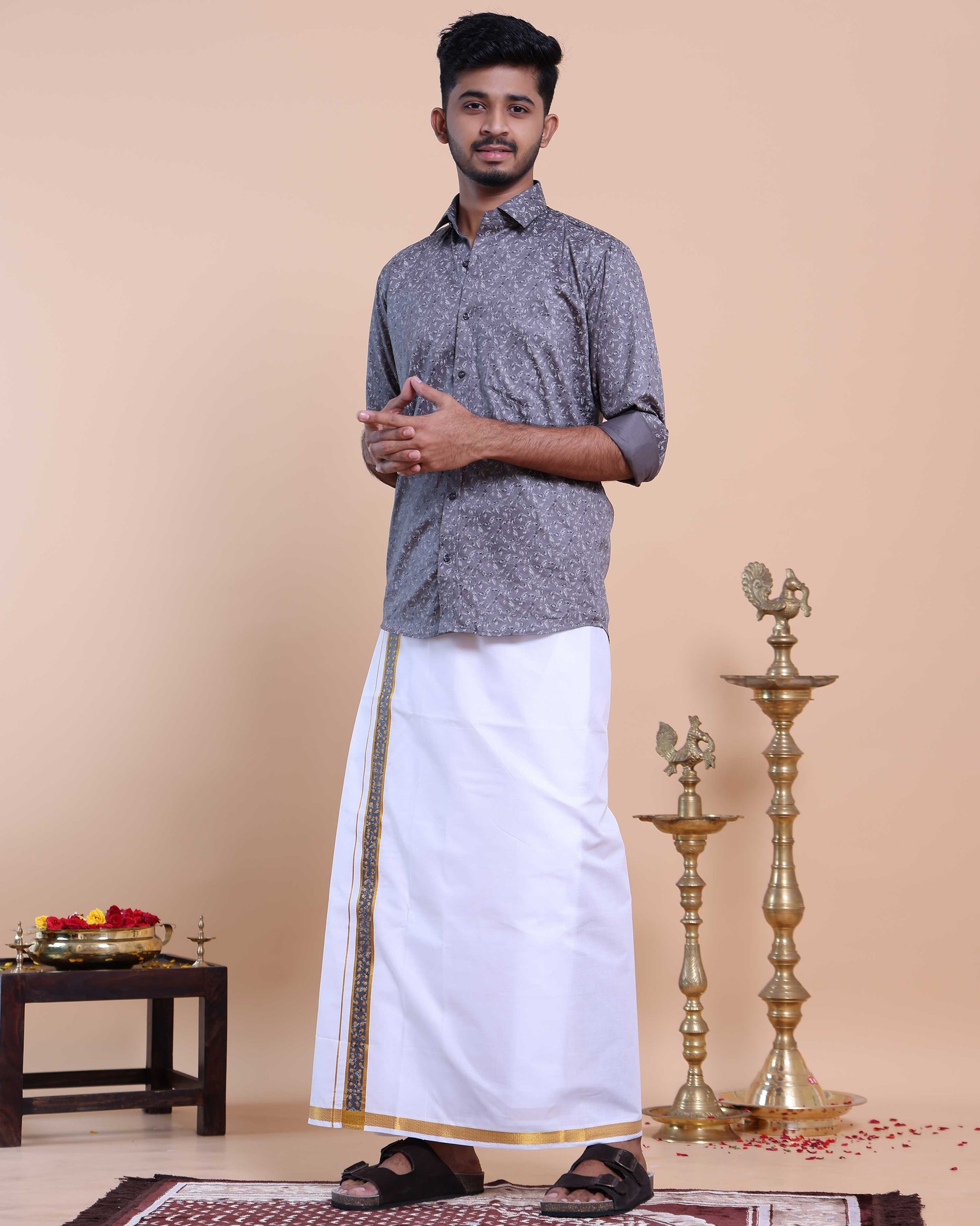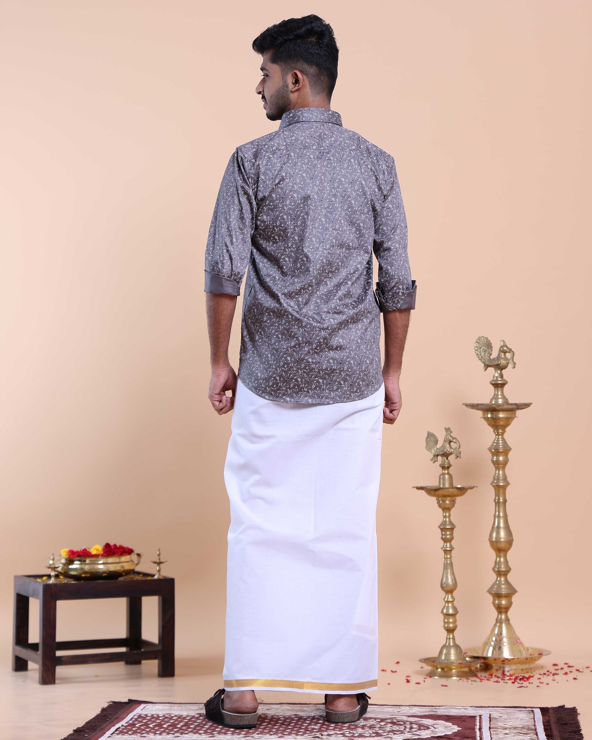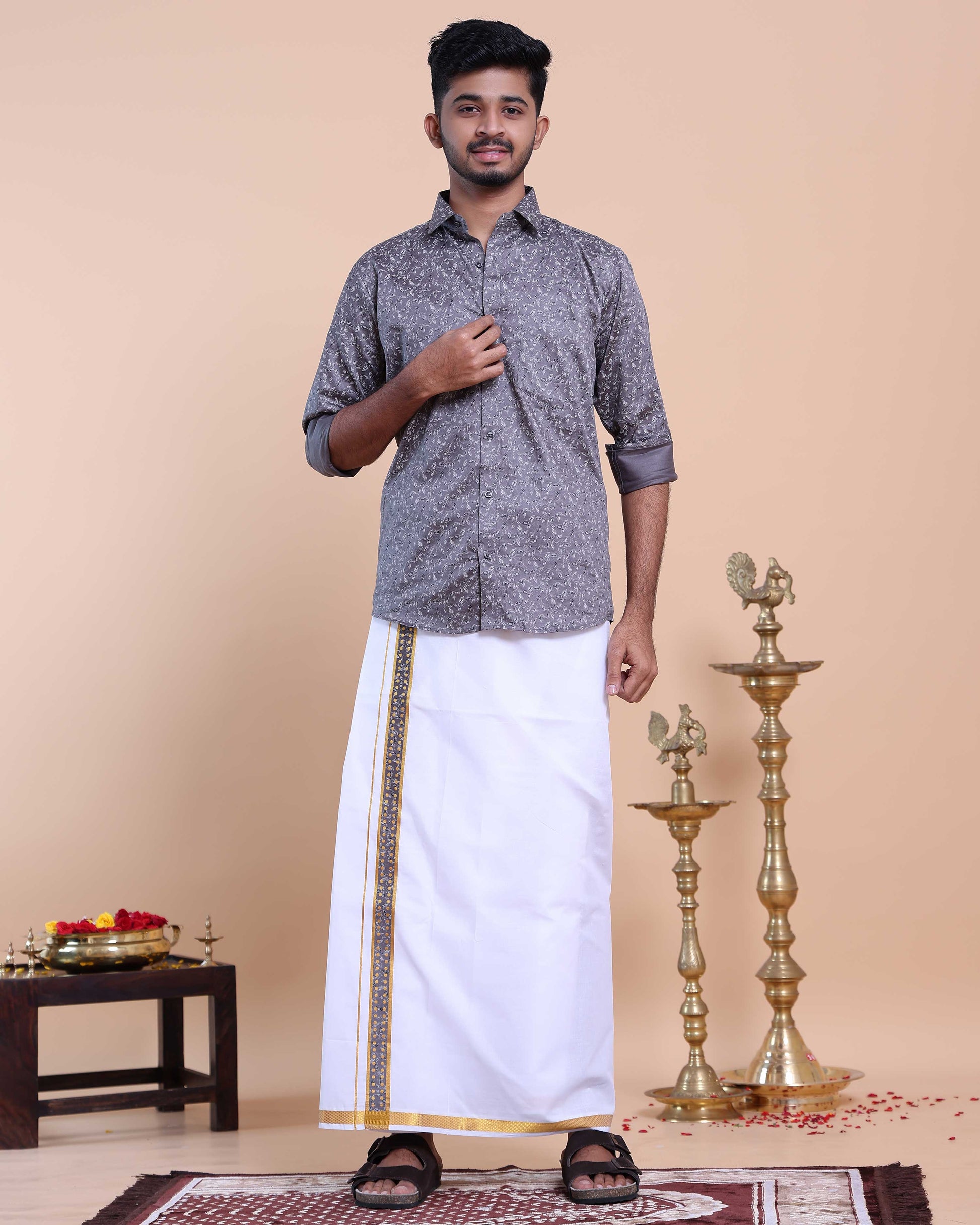 Elevate your traditional style with this men's Grey Color shirt and White Color dhoti set, crafted from comfortable cotton