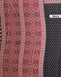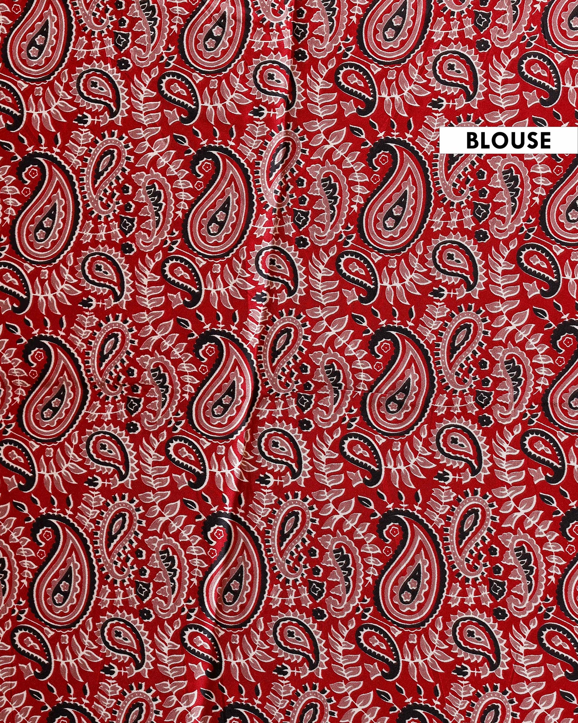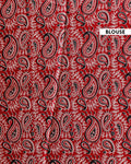 The look is elevated by a vibrant red and white Ajrakh hand-block printed border, making it a perfect blend of traditional and contemporary style.