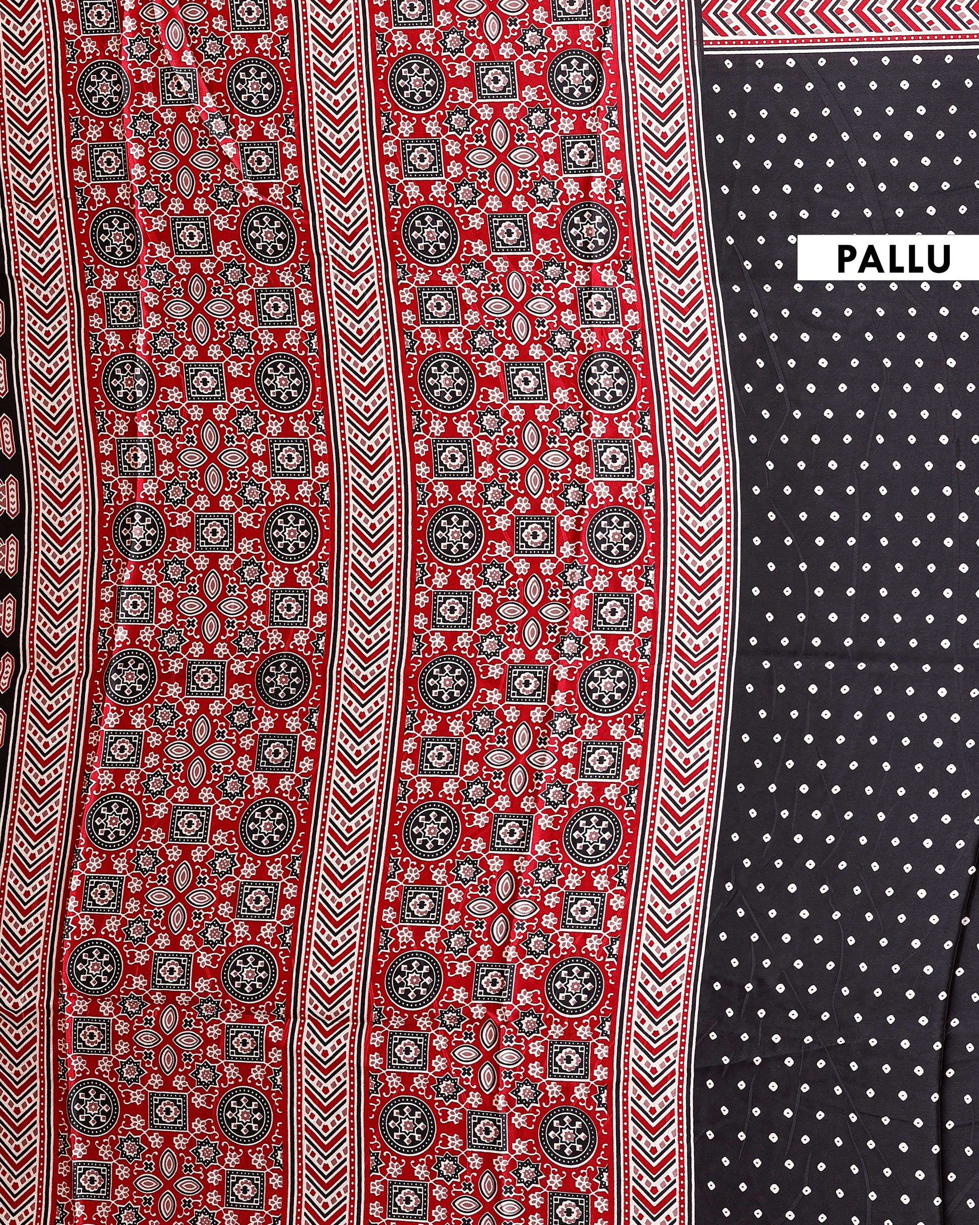 - This modal satin saree features a striking black body adorned with a bandhani-inspired dotted pattern