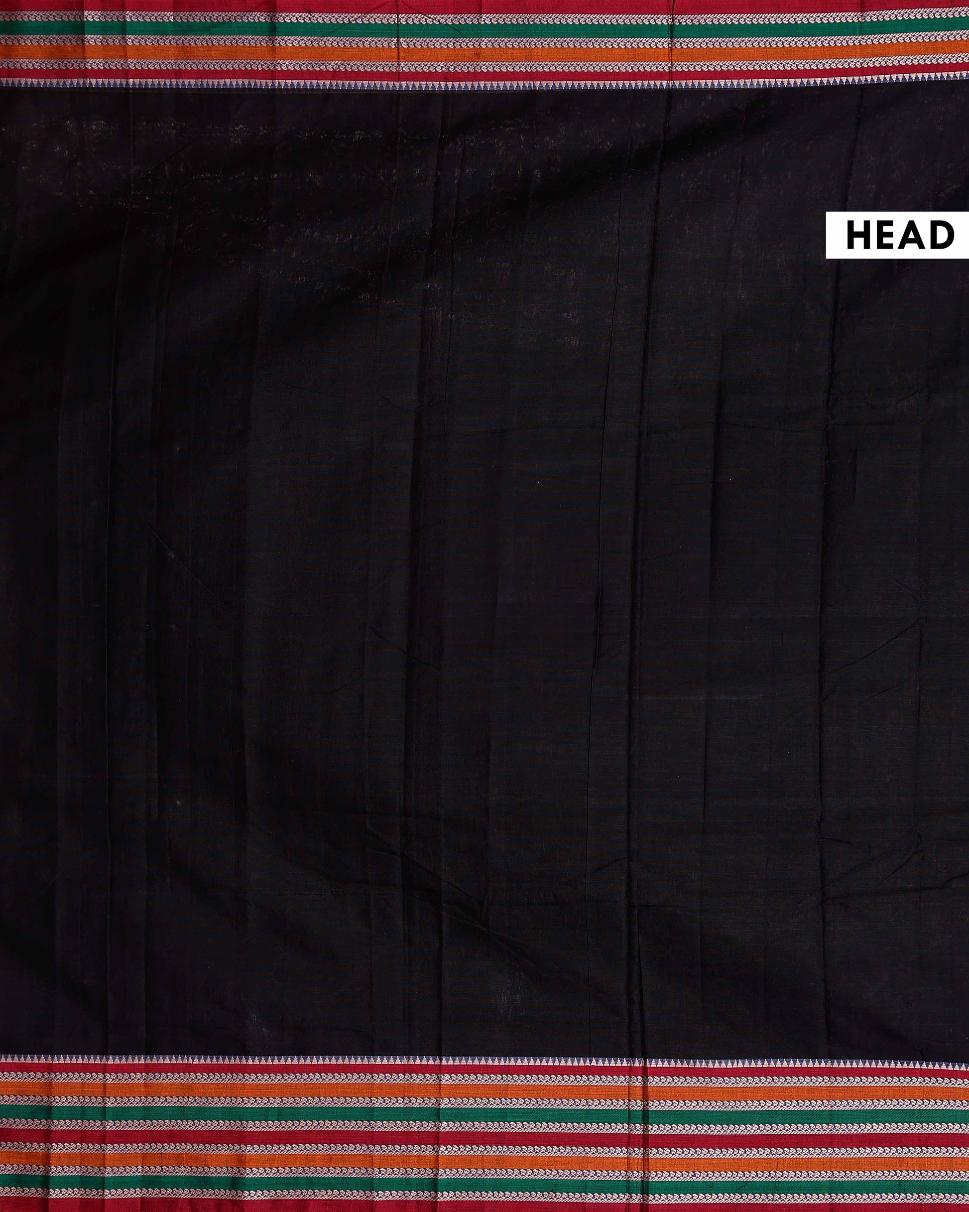 - This elegant Black Narayanpet cotton saree a plain body and a striking contrast striped pallu
