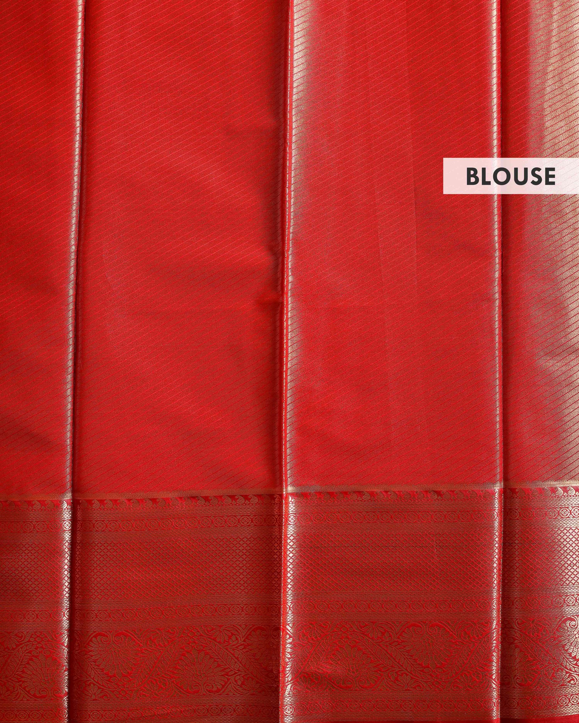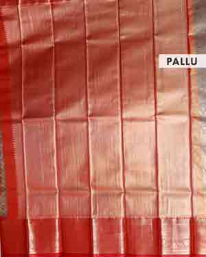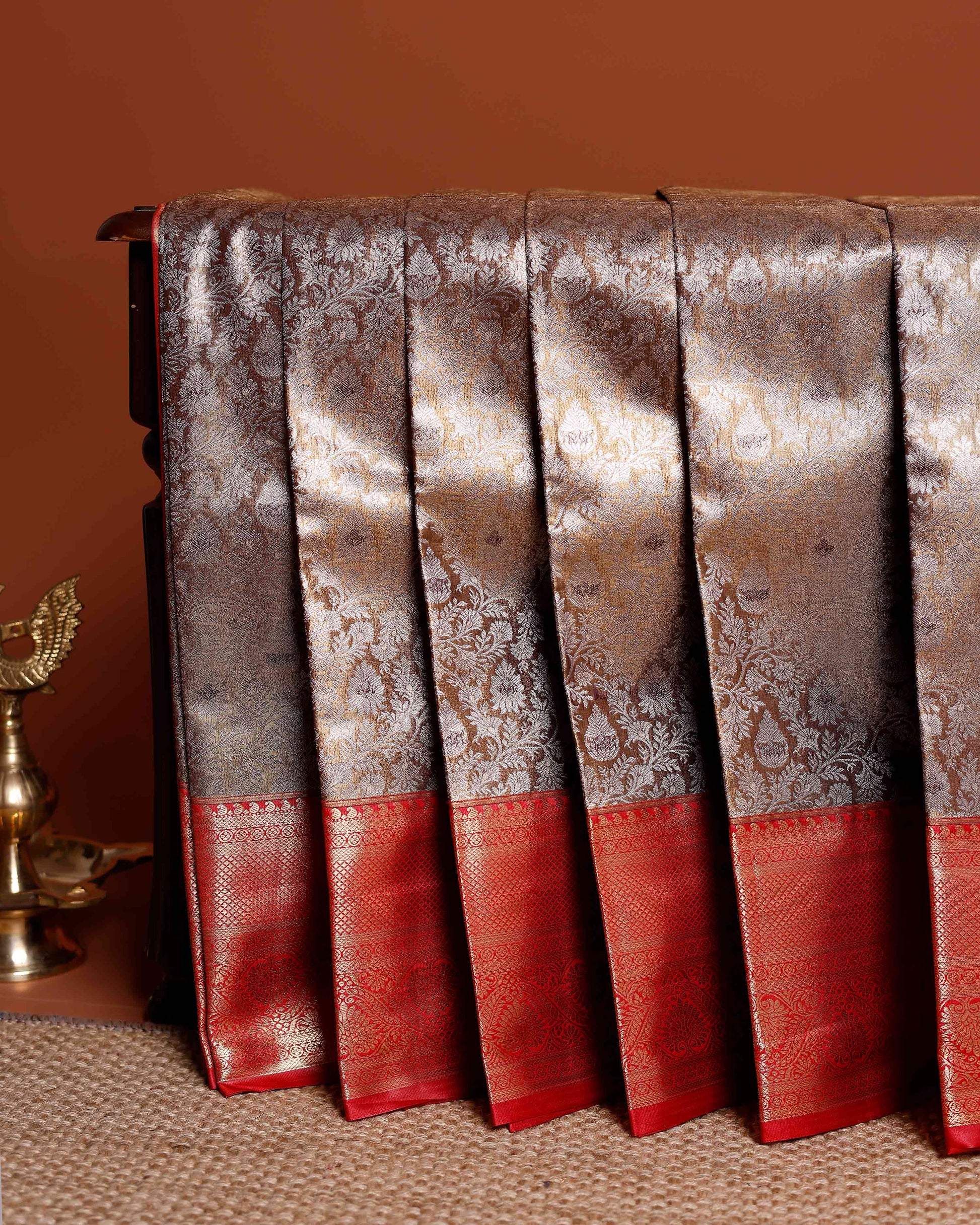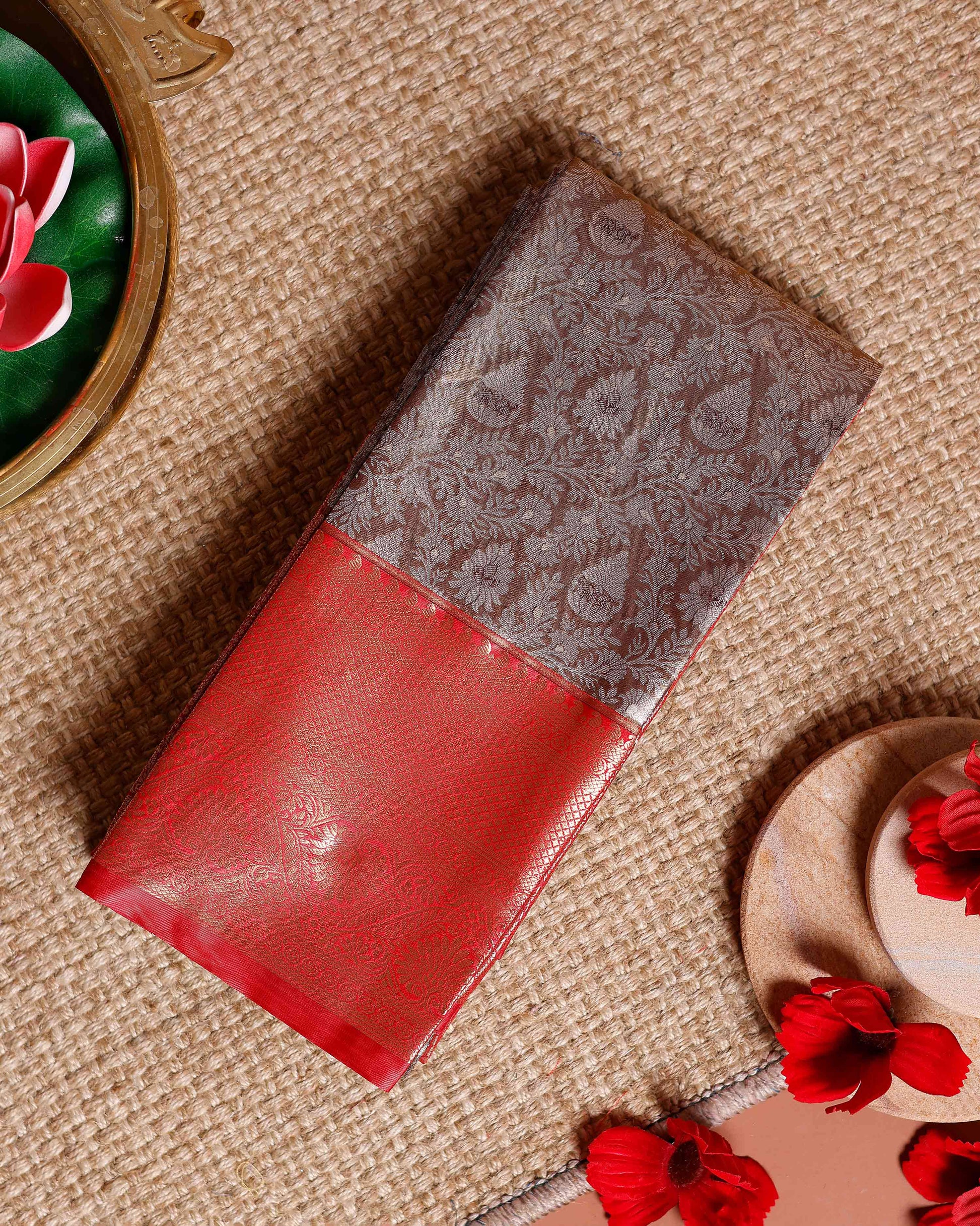 - This elegant Niranjana silk saree a lustrous brown body with all-over brocade weaving, complemented by a rich, contrasting red border with intricate zari work