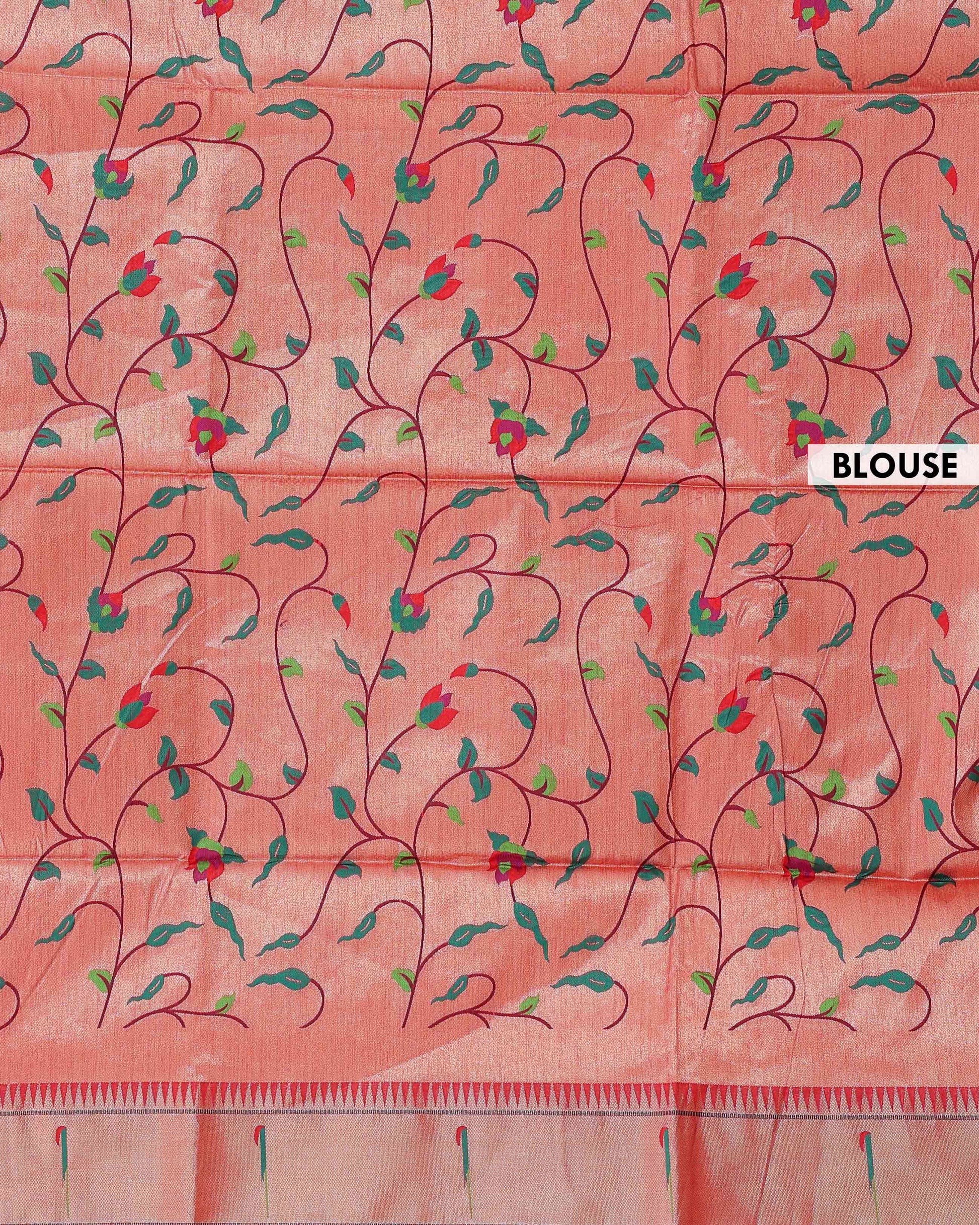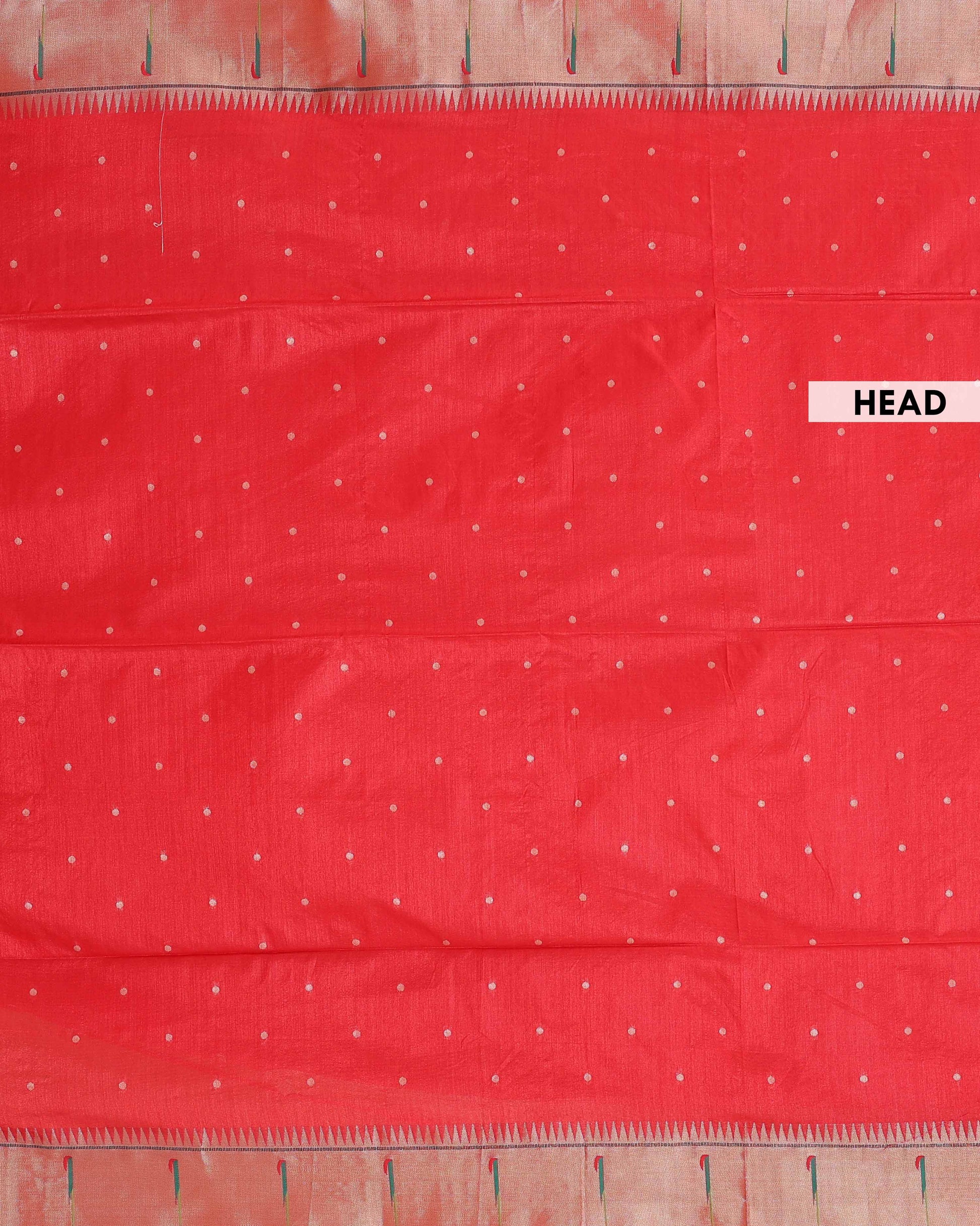 - This Red Paithani saree is a traditional masterpiece, a rich pallu with intricate peacock and floral weaving
