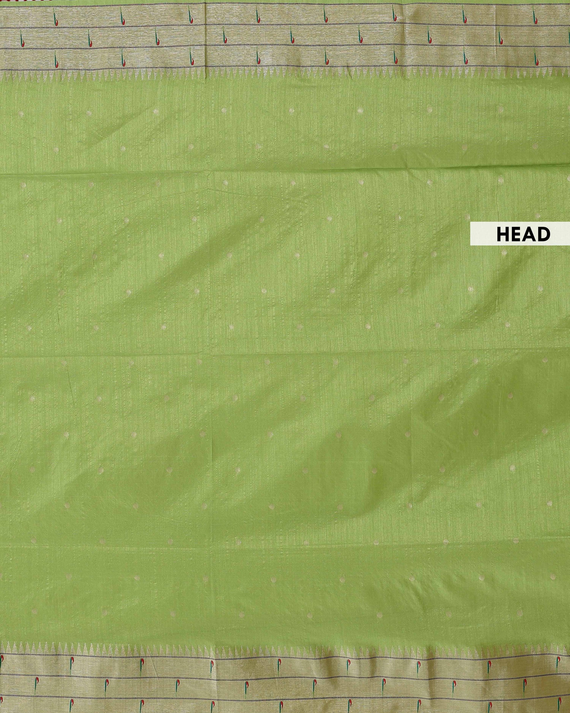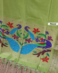- This light green Paithani saree is a traditional masterpiece, a rich pallu with intricate peacock and floral weaving